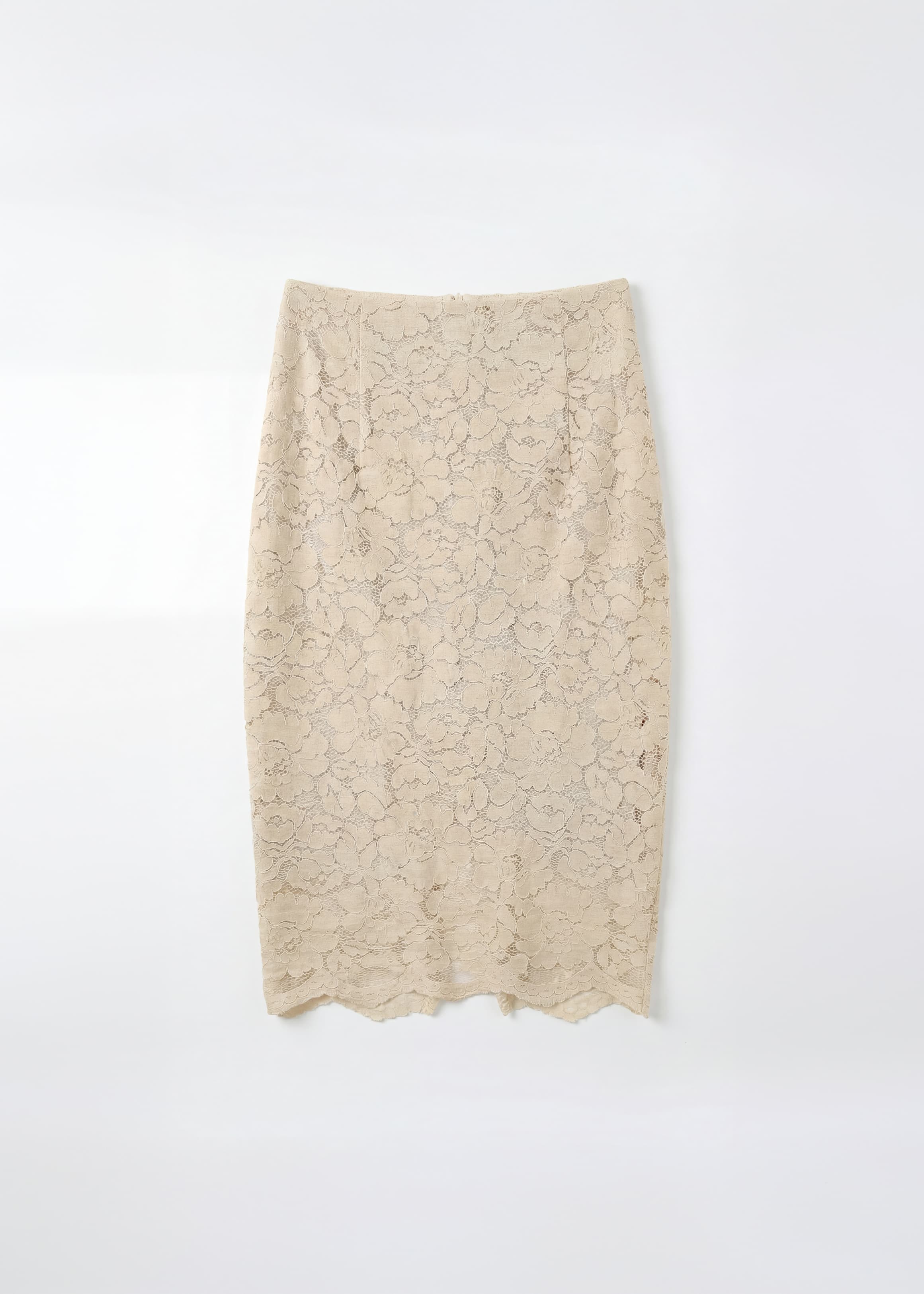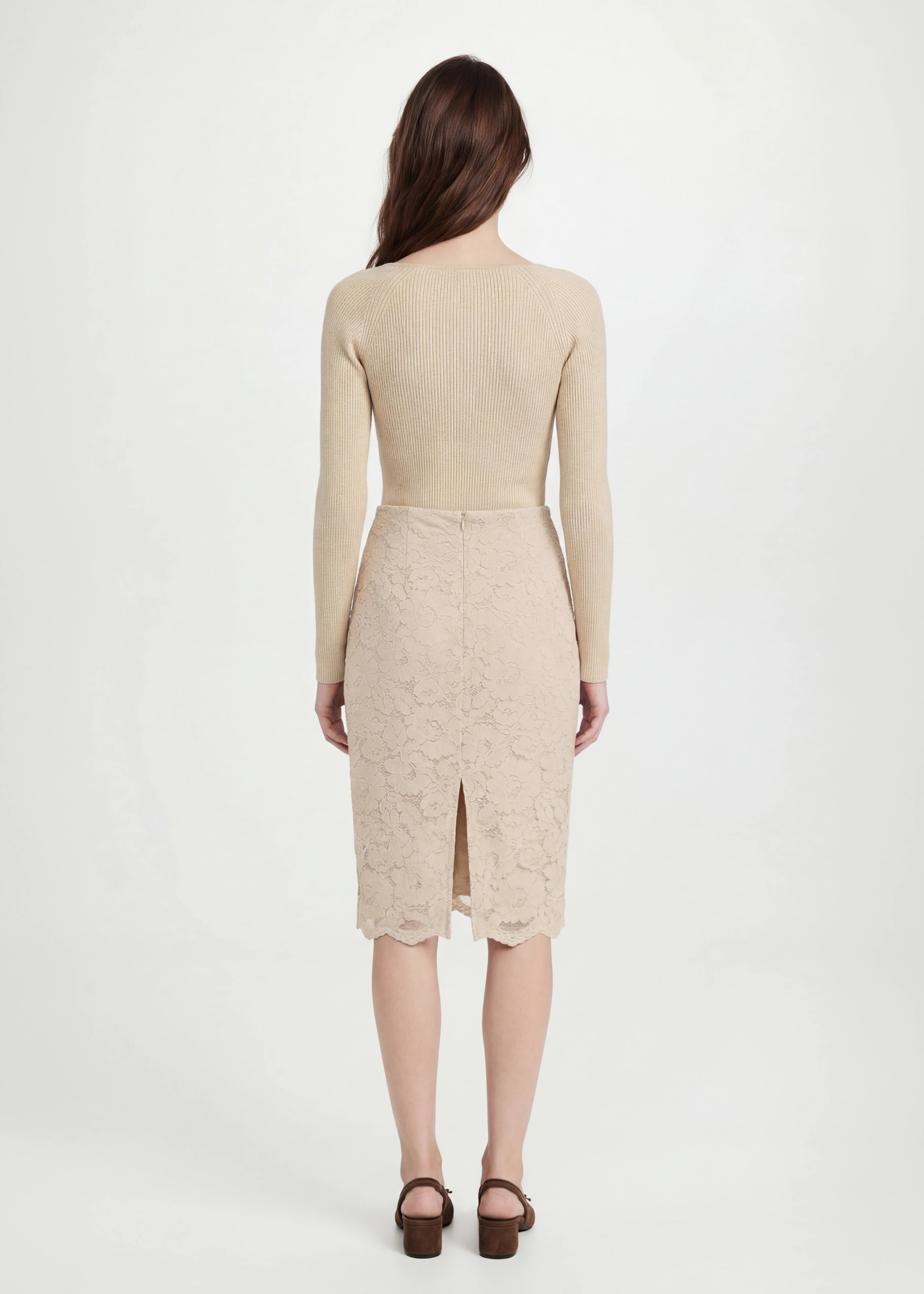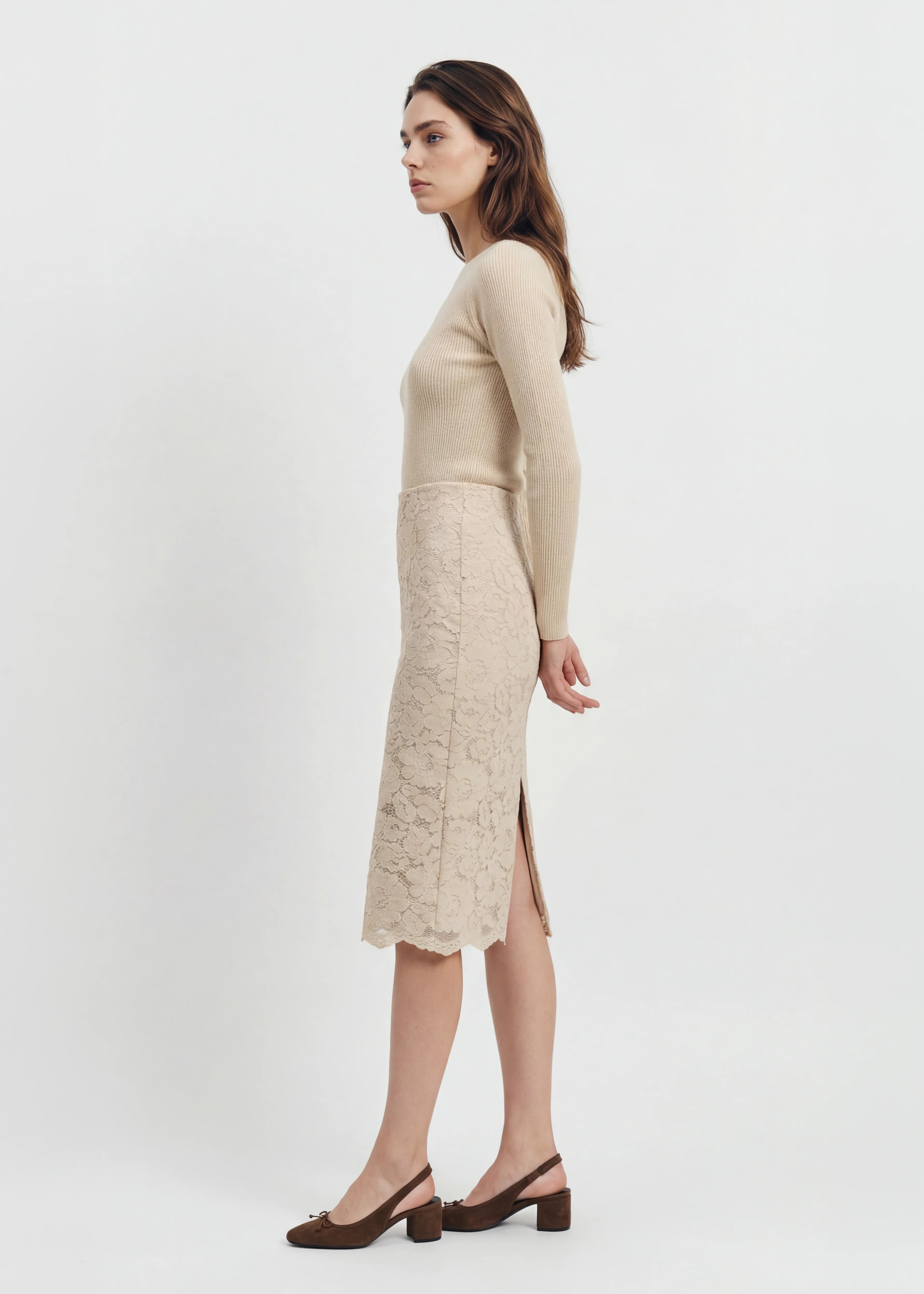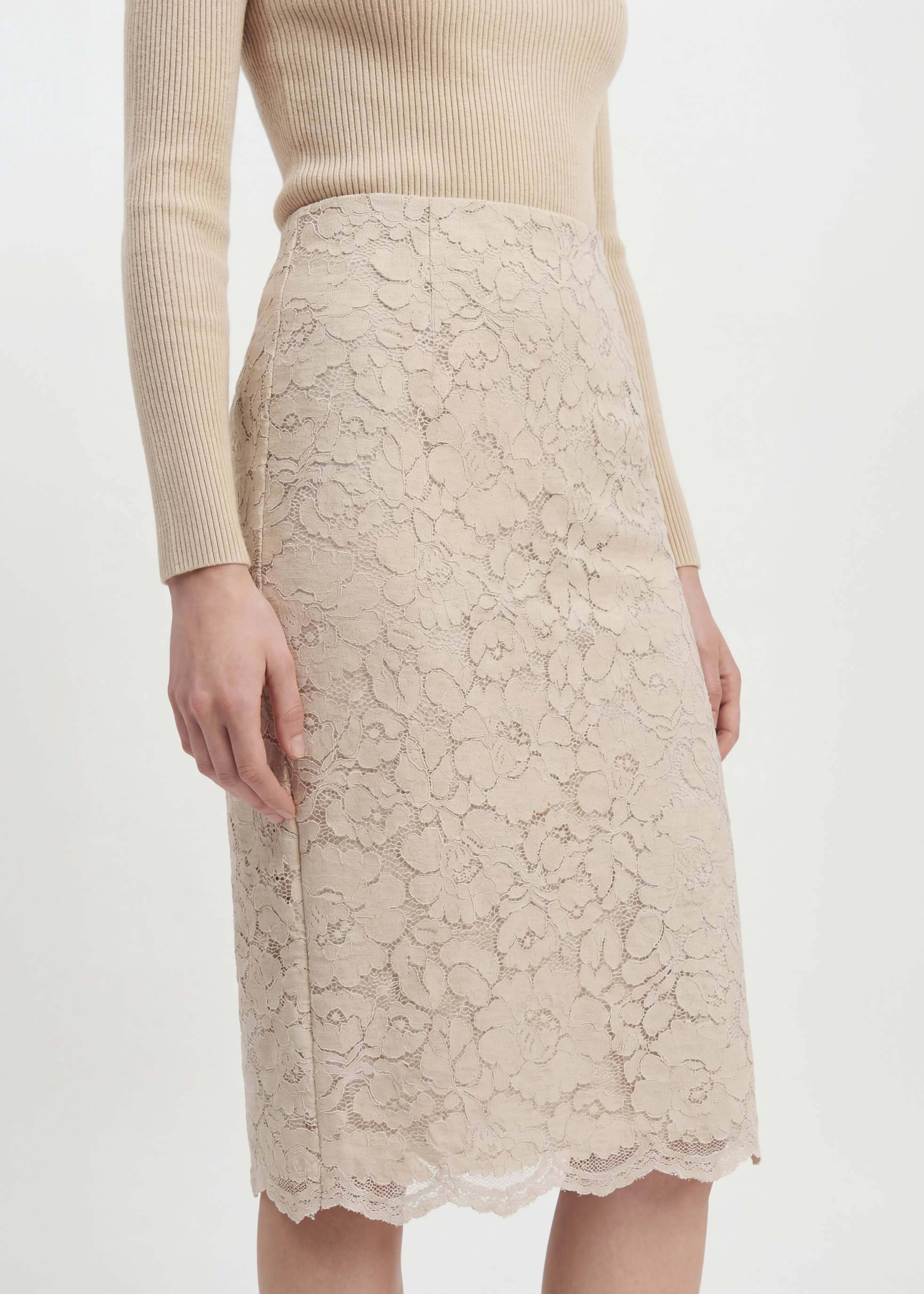 A refined midi skirt crafted in delicate lace with a smooth lining for comfort. Designed with a high waist, fitted silhouette and scalloped hem, finished with a back split for ease of movement. An elevated essential for day to evening styling.