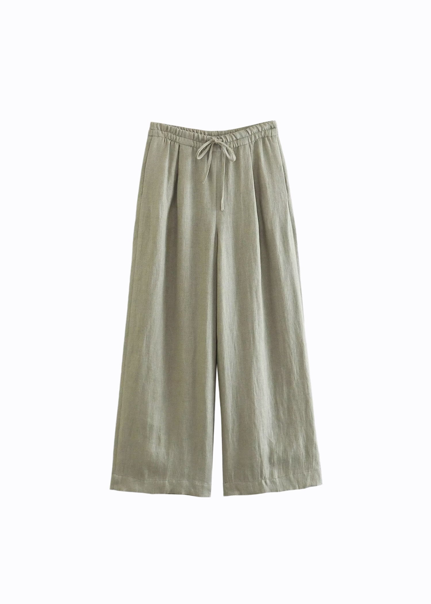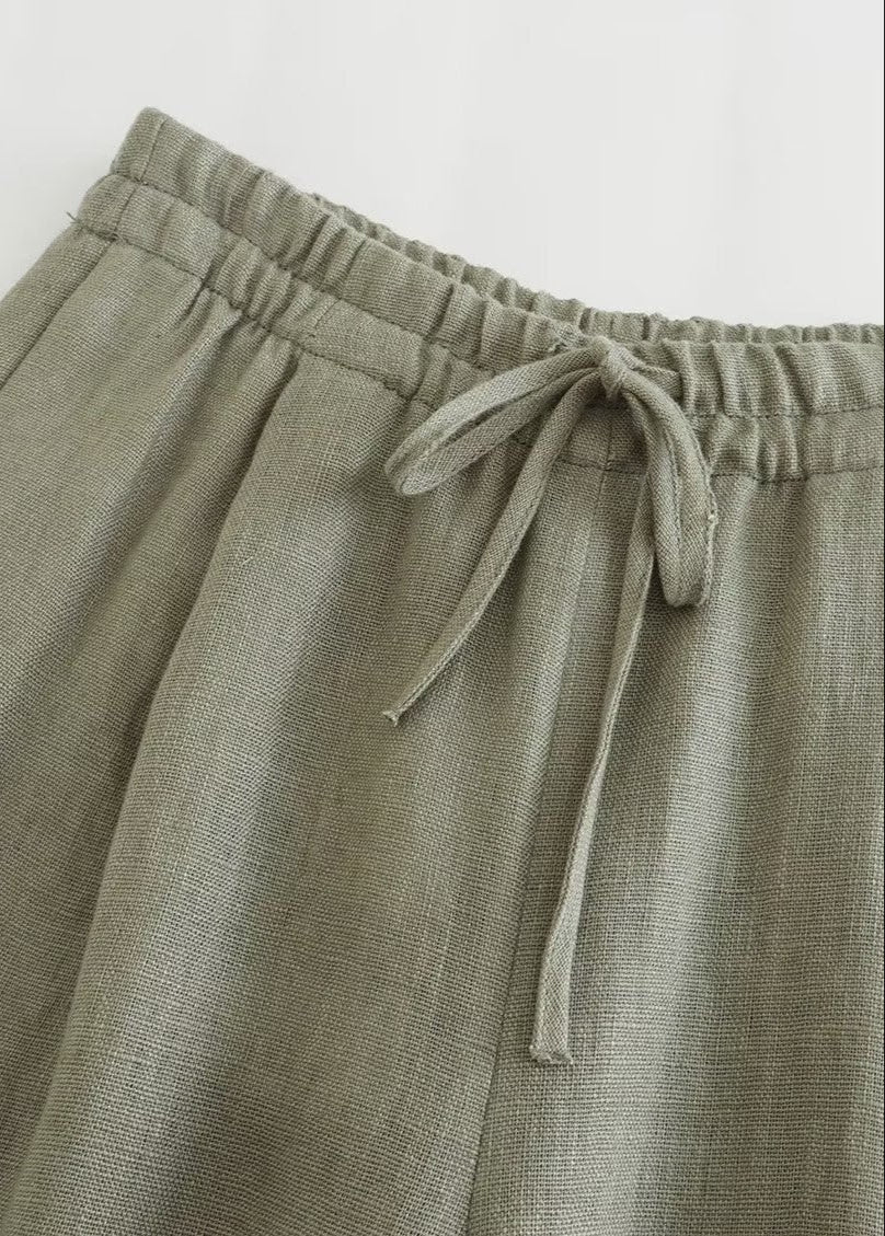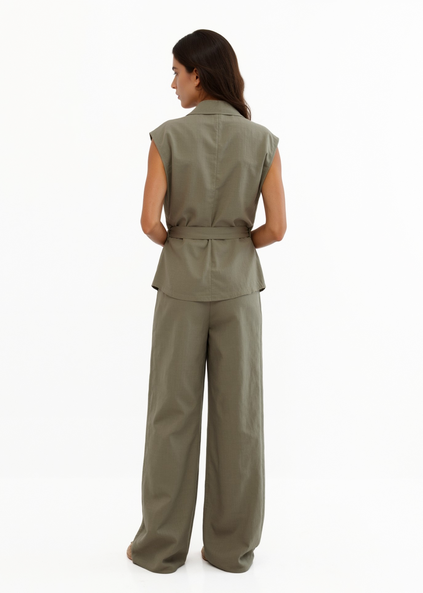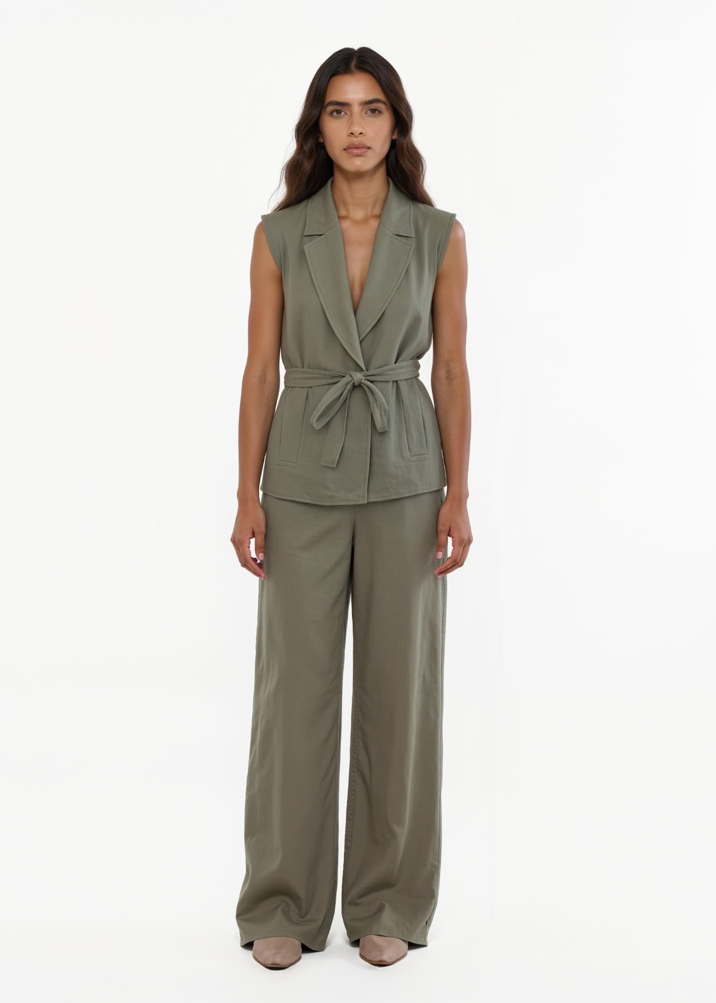 They’re made to match Cassia Vest in the same sage cloth. Worn together, they create an understated two-piece with real presence.