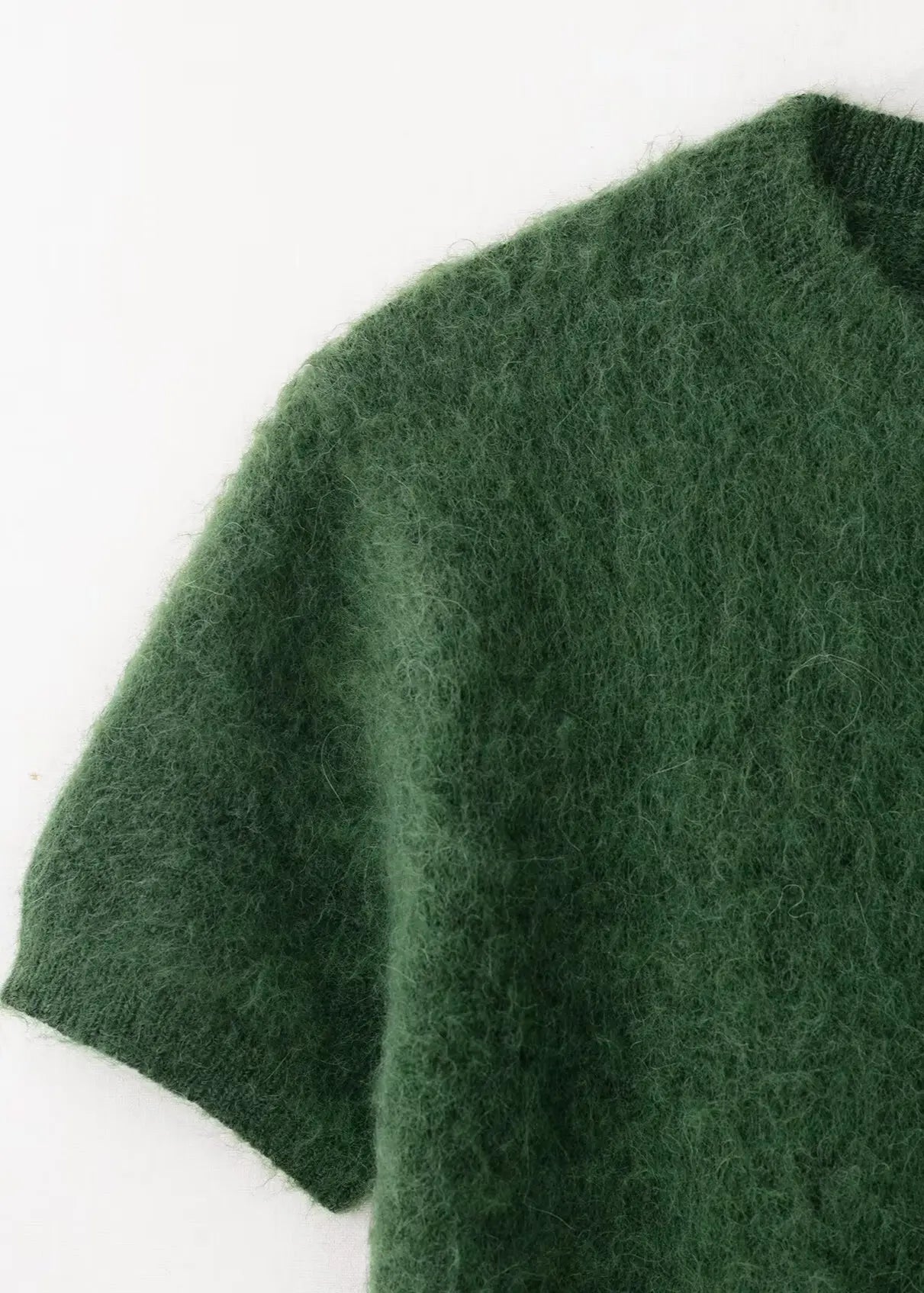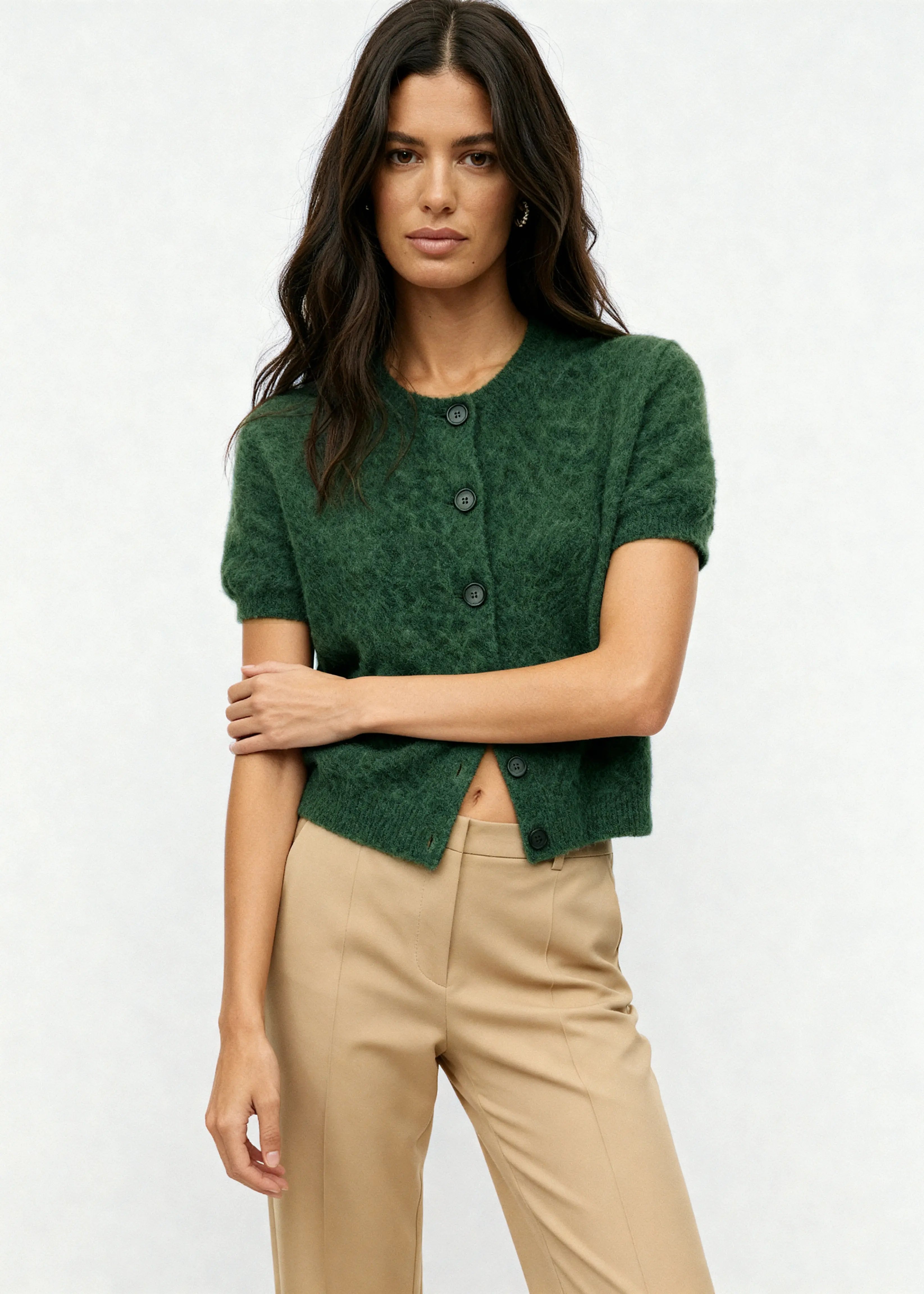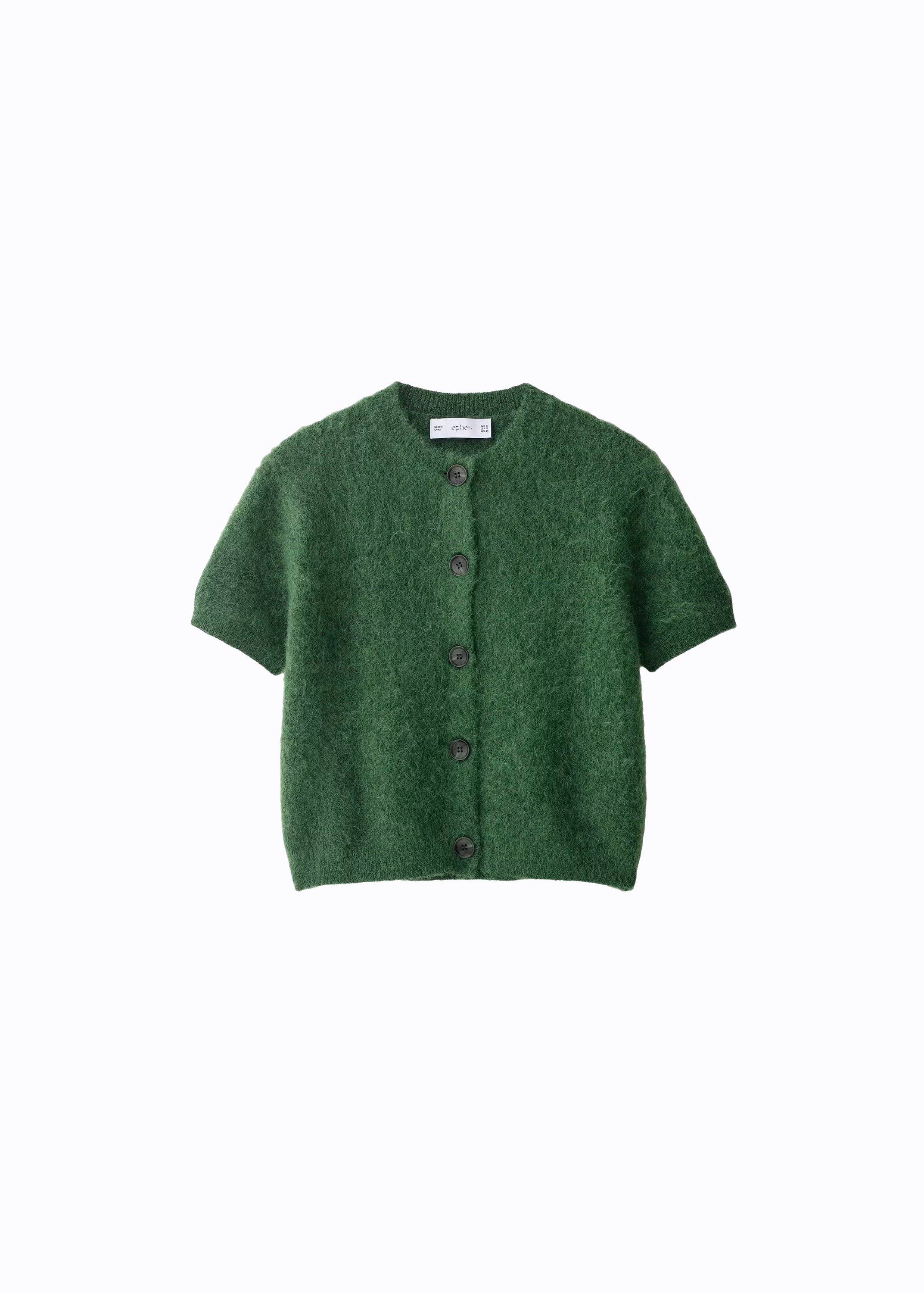 Short sleeves, fuzzy knit, forest green — three things that, on paper, sound like a committee decision gone wrong, but in practice land somewhere between surprisingly clever and genuinely useful. It's made in a brushed yarn, buttoned-through the front, cropped at the waist, finished with ribbed edges that do their job and nothing more. The whole thing weighs almost nothing, breathes better than you'd expect, and layers over slip dresses or sits neatly with trousers when the temperature can't decide what it's doing.