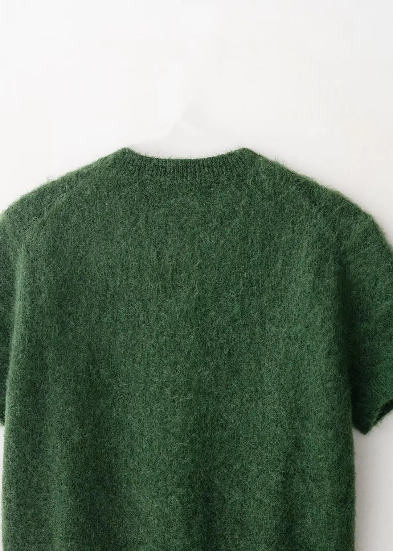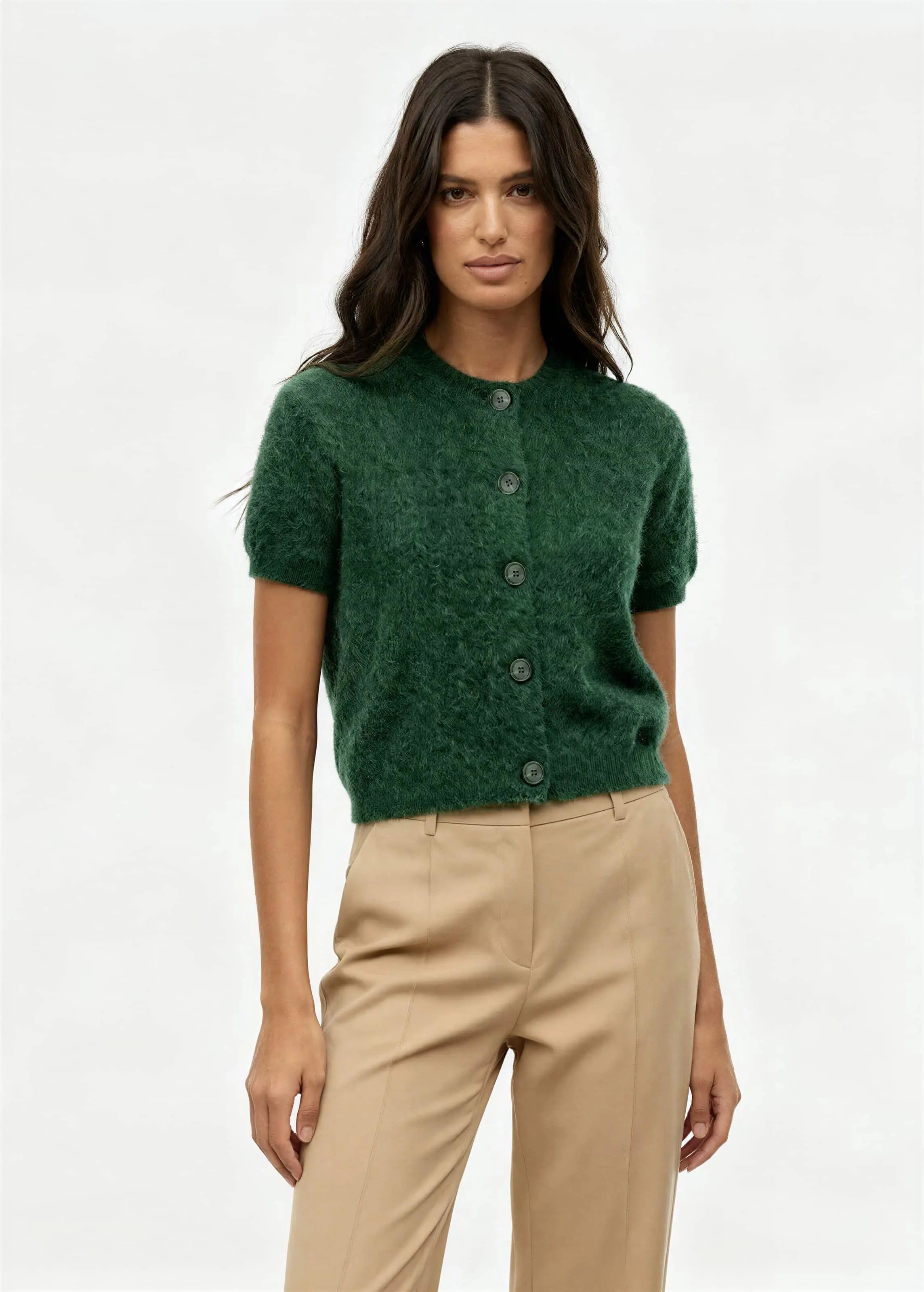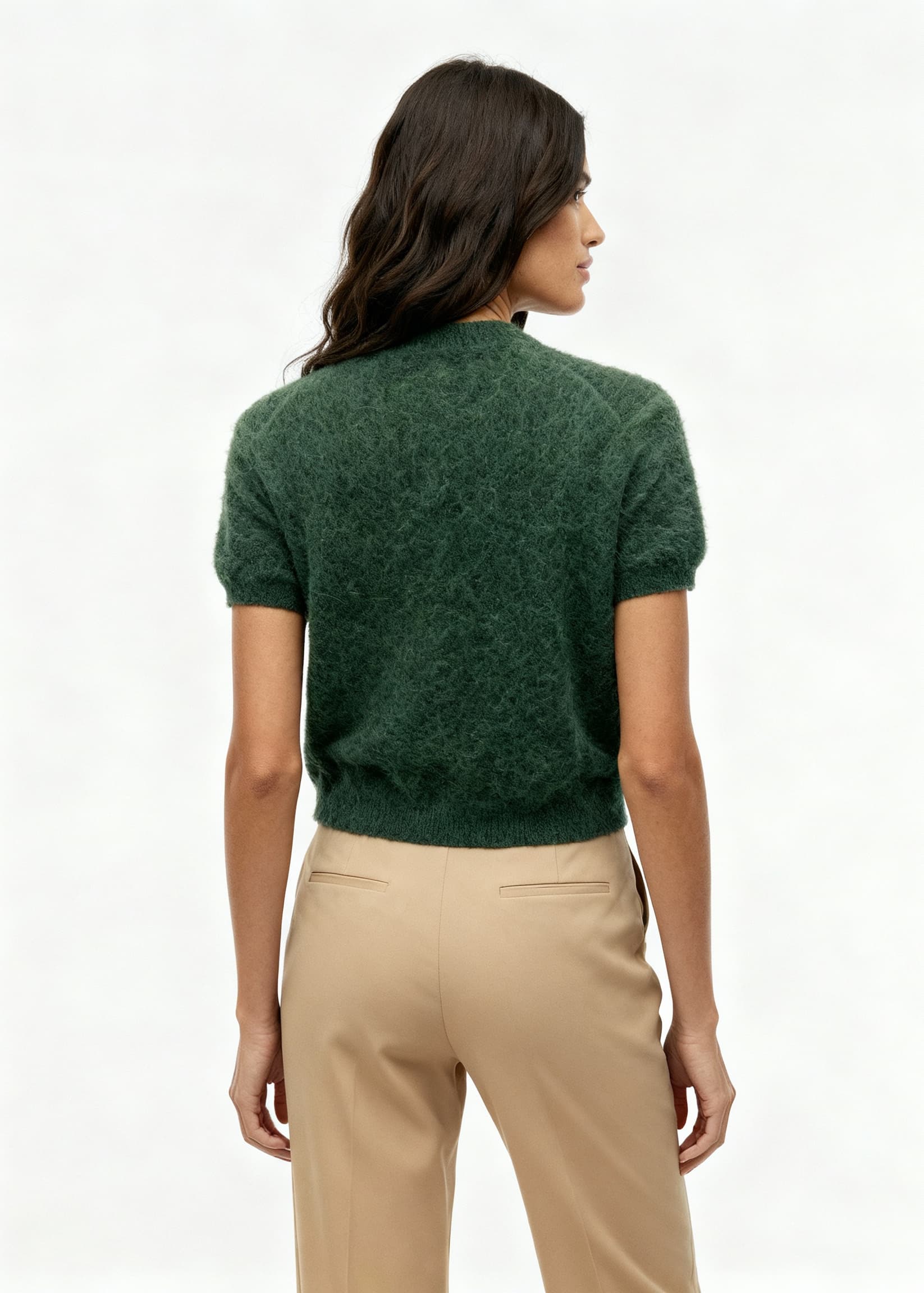 Short sleeves, fuzzy knit, forest green — three things that, on paper, sound like a committee decision gone wrong, but in practice land somewhere between surprisingly clever and genuinely useful. It's made in a brushed yarn, buttoned-through the front, cropped at the waist, finished with ribbed edges that do their job and nothing more. The whole thing weighs almost nothing, breathes better than you'd expect, and layers over slip dresses or sits neatly with trousers when the temperature can't decide what it's doing.