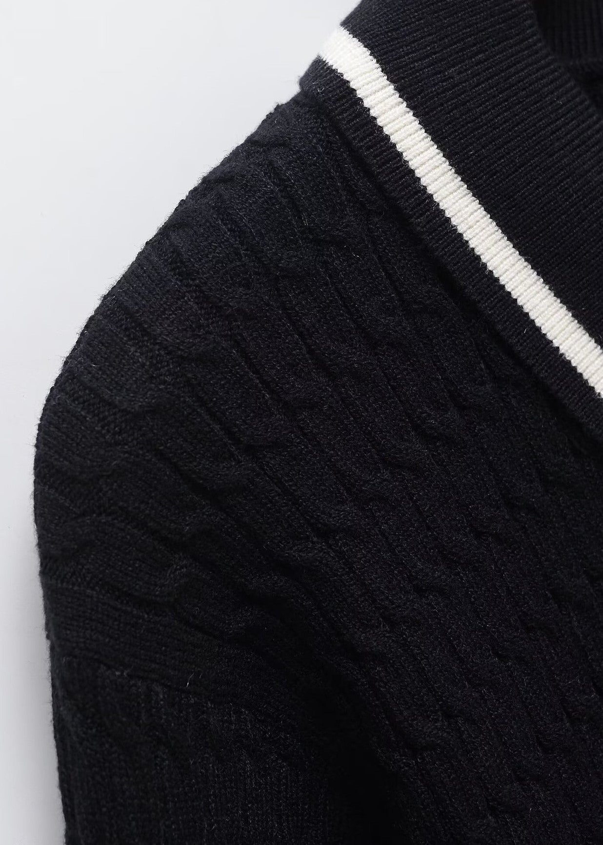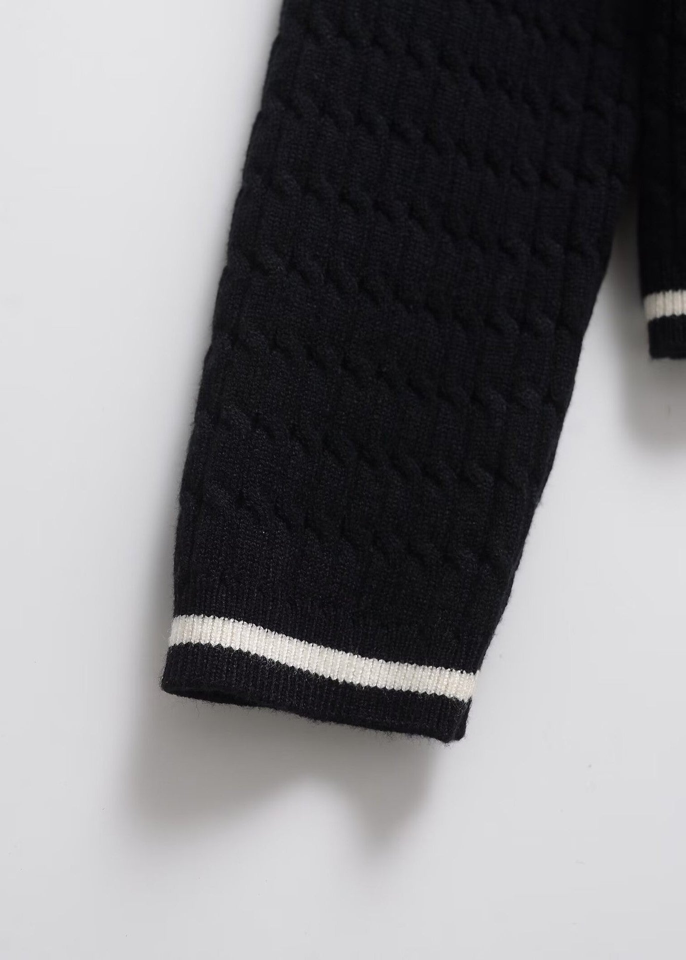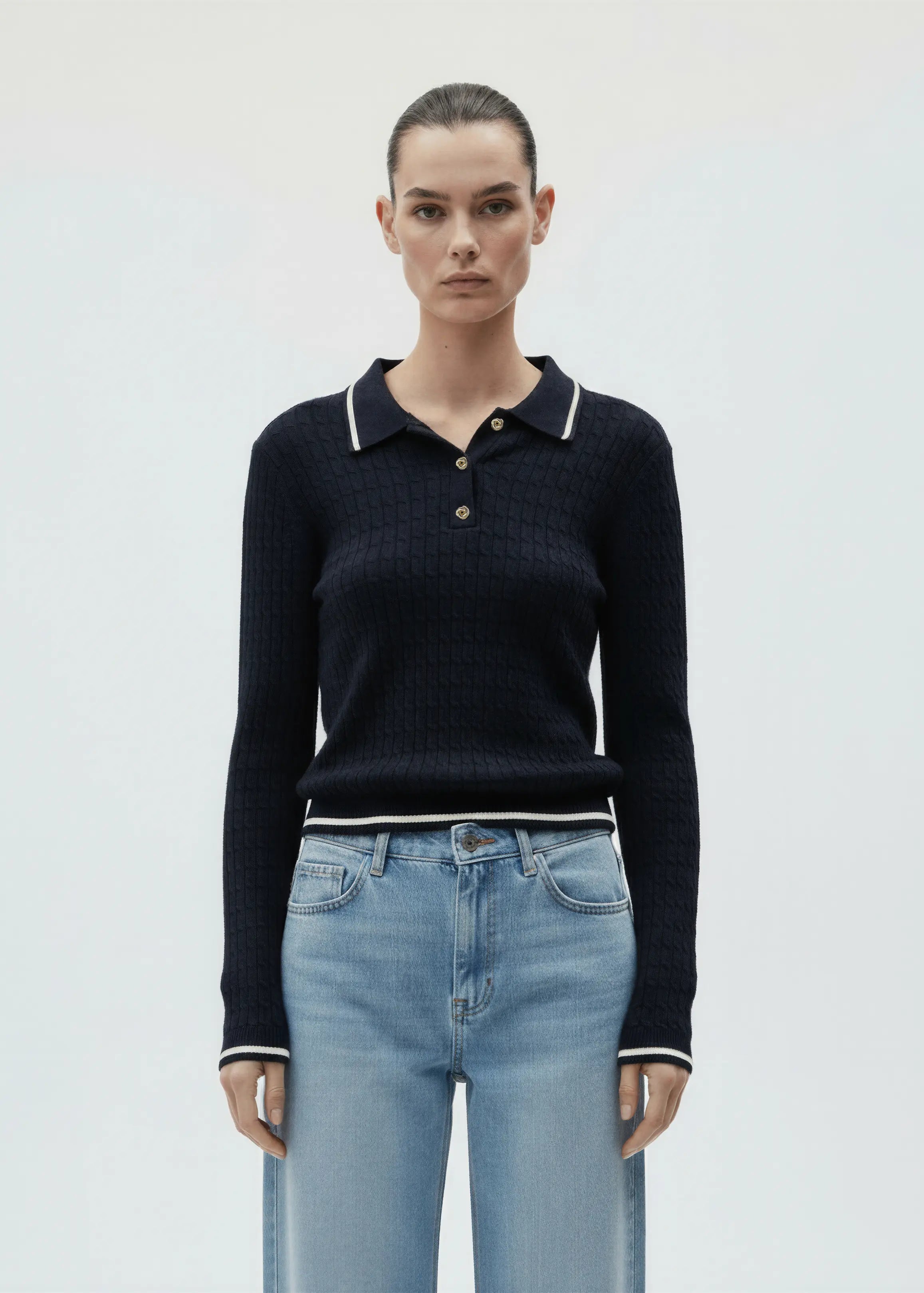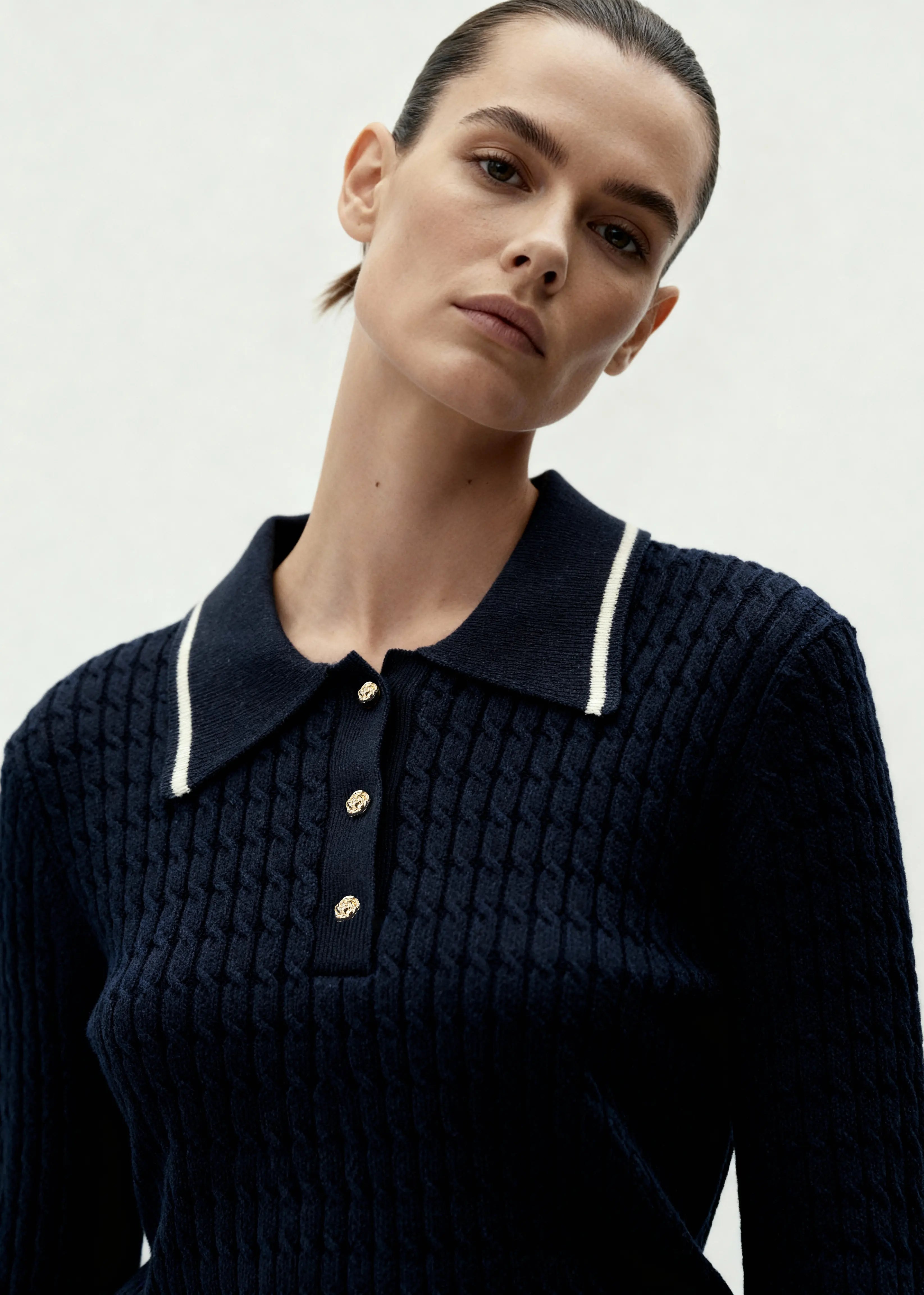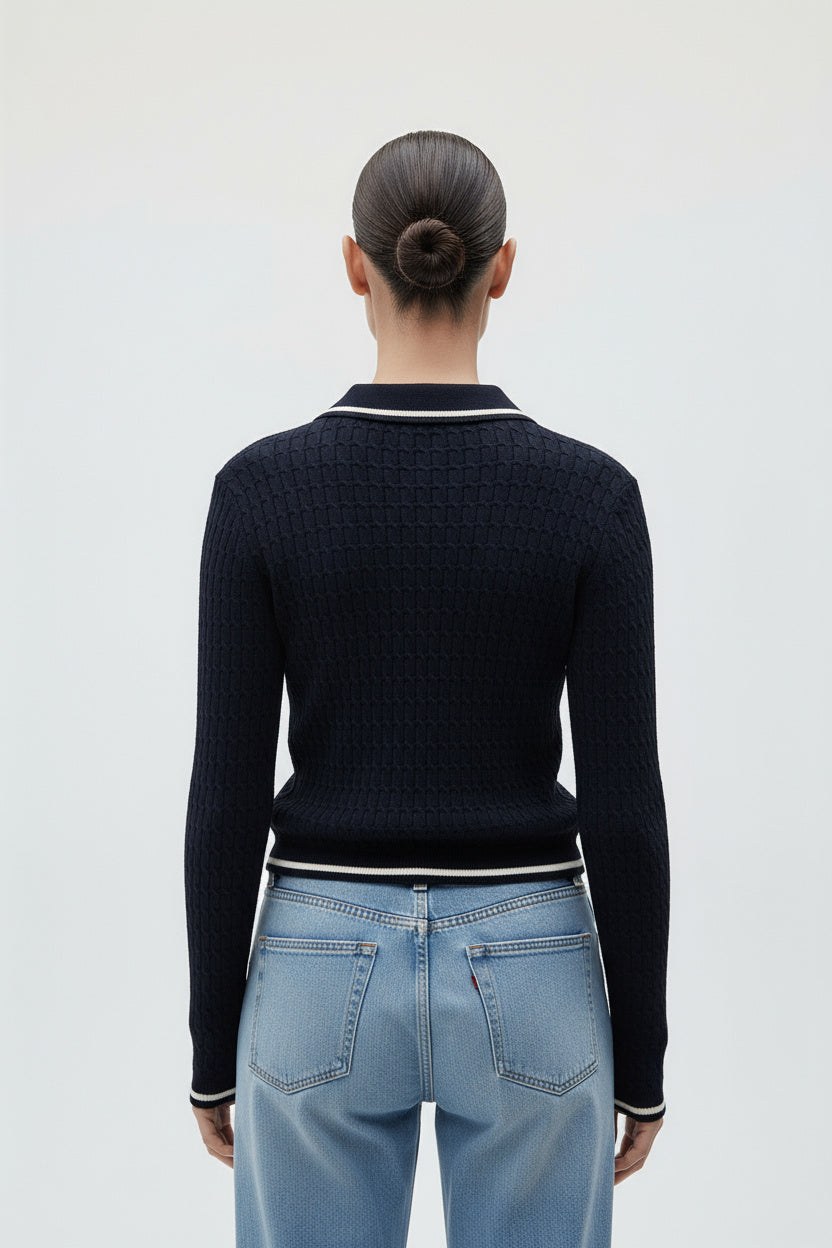The main feature of this polo is its knit. It is a textured, geometric stitch that covers the entire garment, giving it structure and a distinct surface. A single white stripe provides contrast at the polo collar, cuffs, and hem. The three-button placket is fastened with gold-toned metal knots. It’s a smart piece of knitwear, all told. Familiar in shape, but with enough going on in the texture and details to make it interesting.