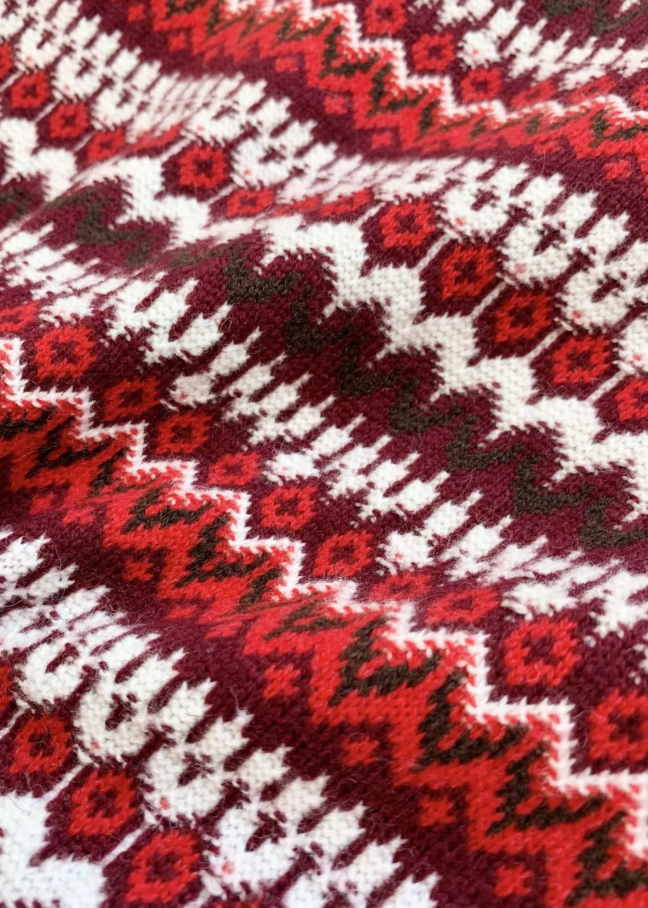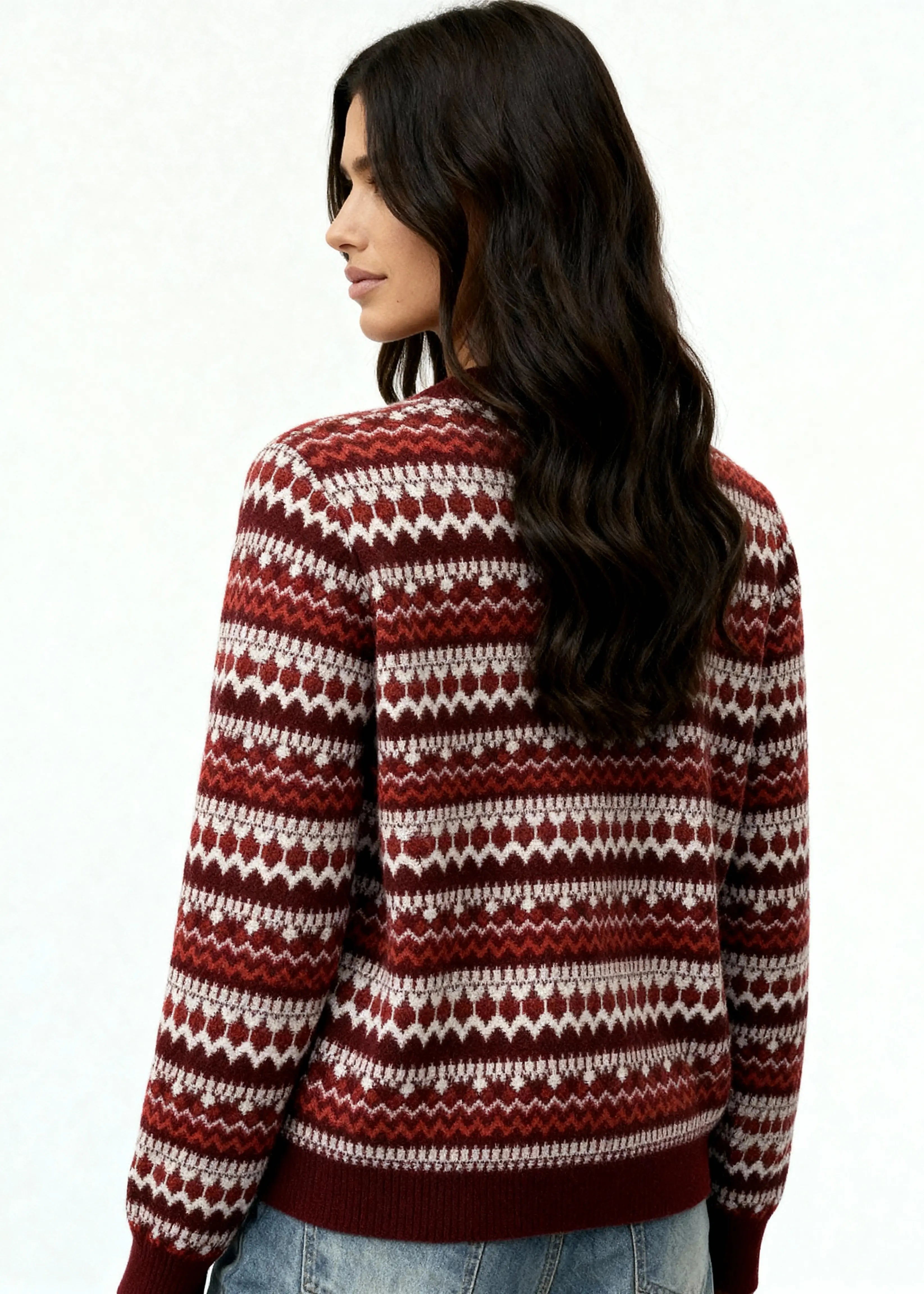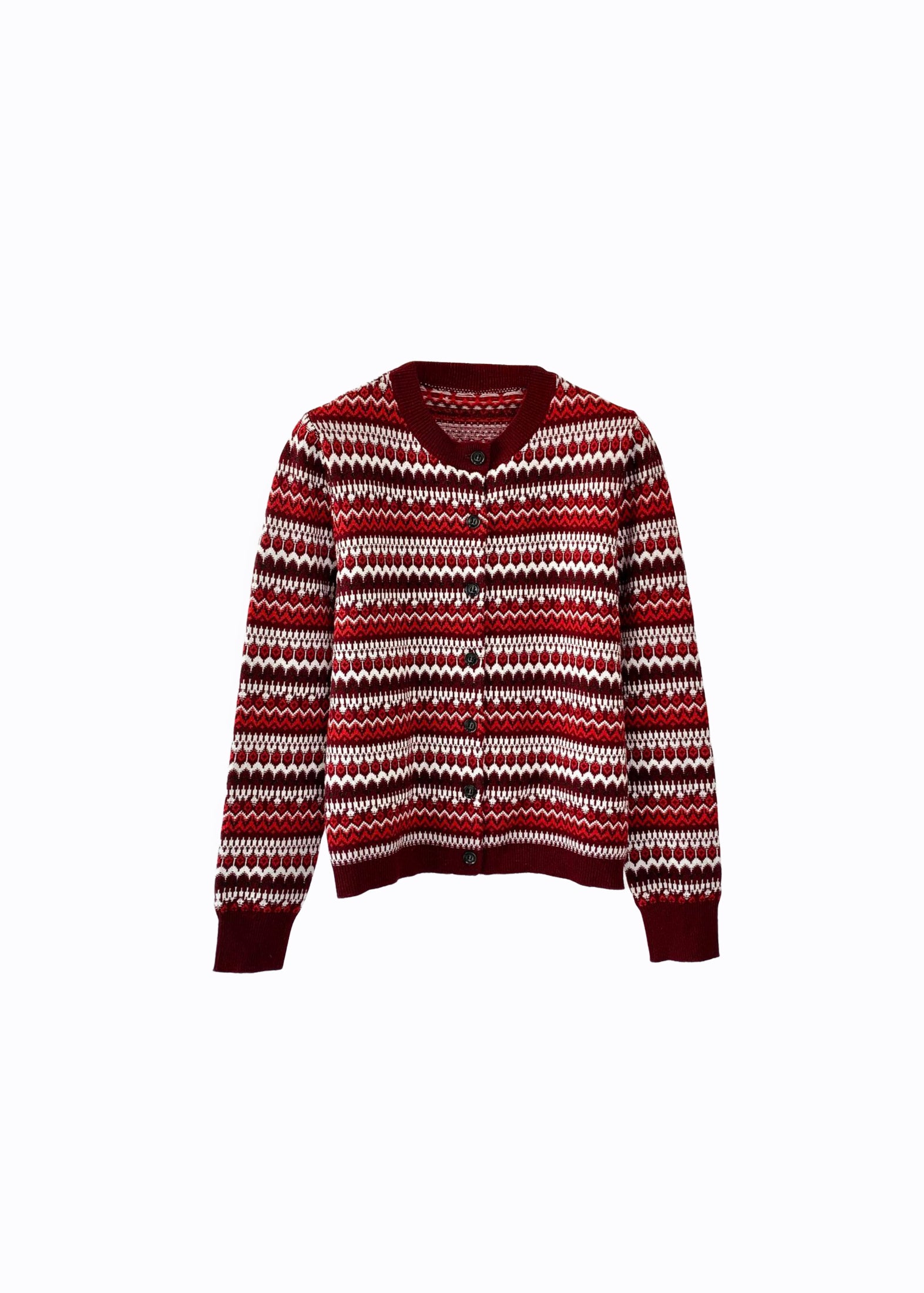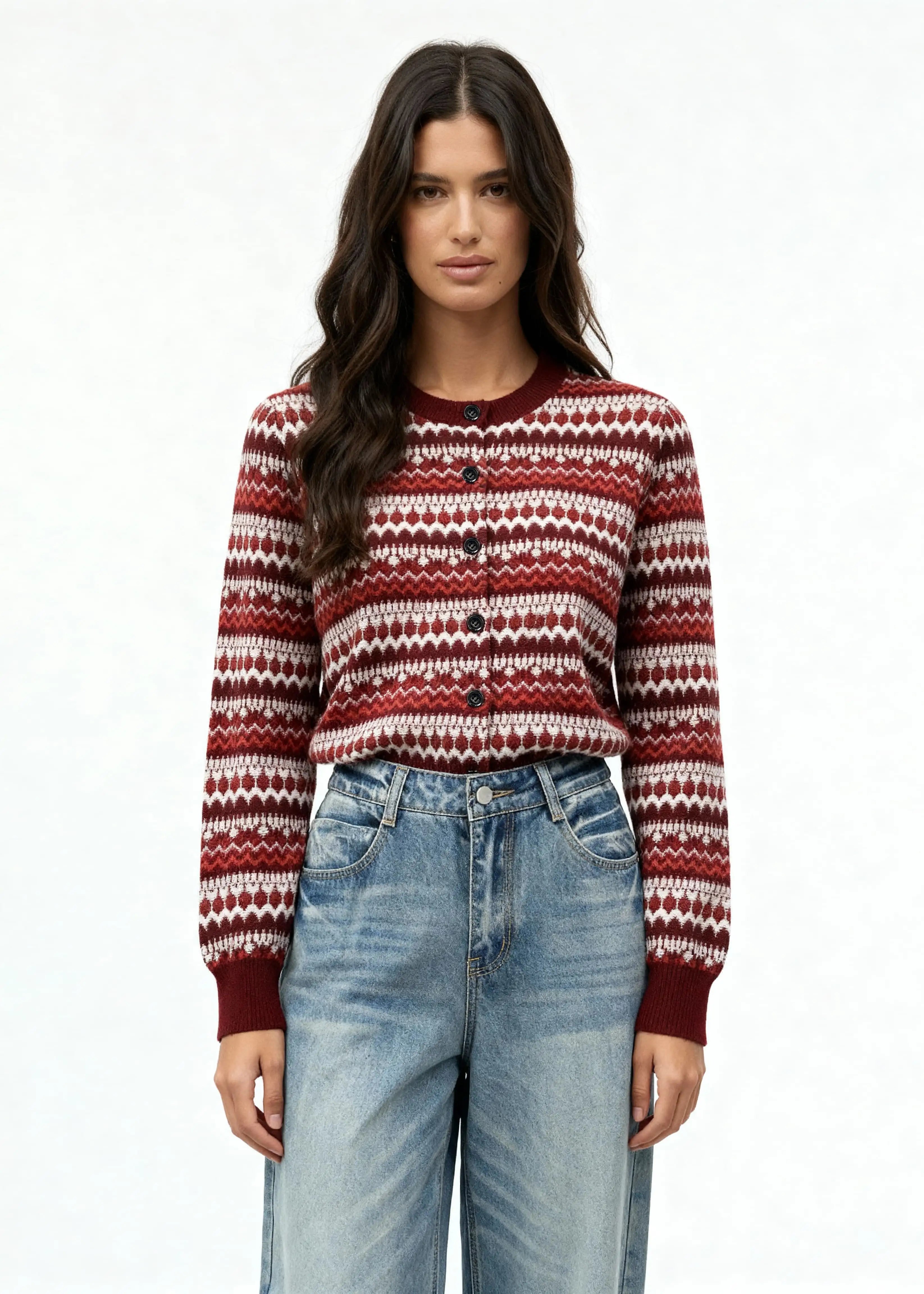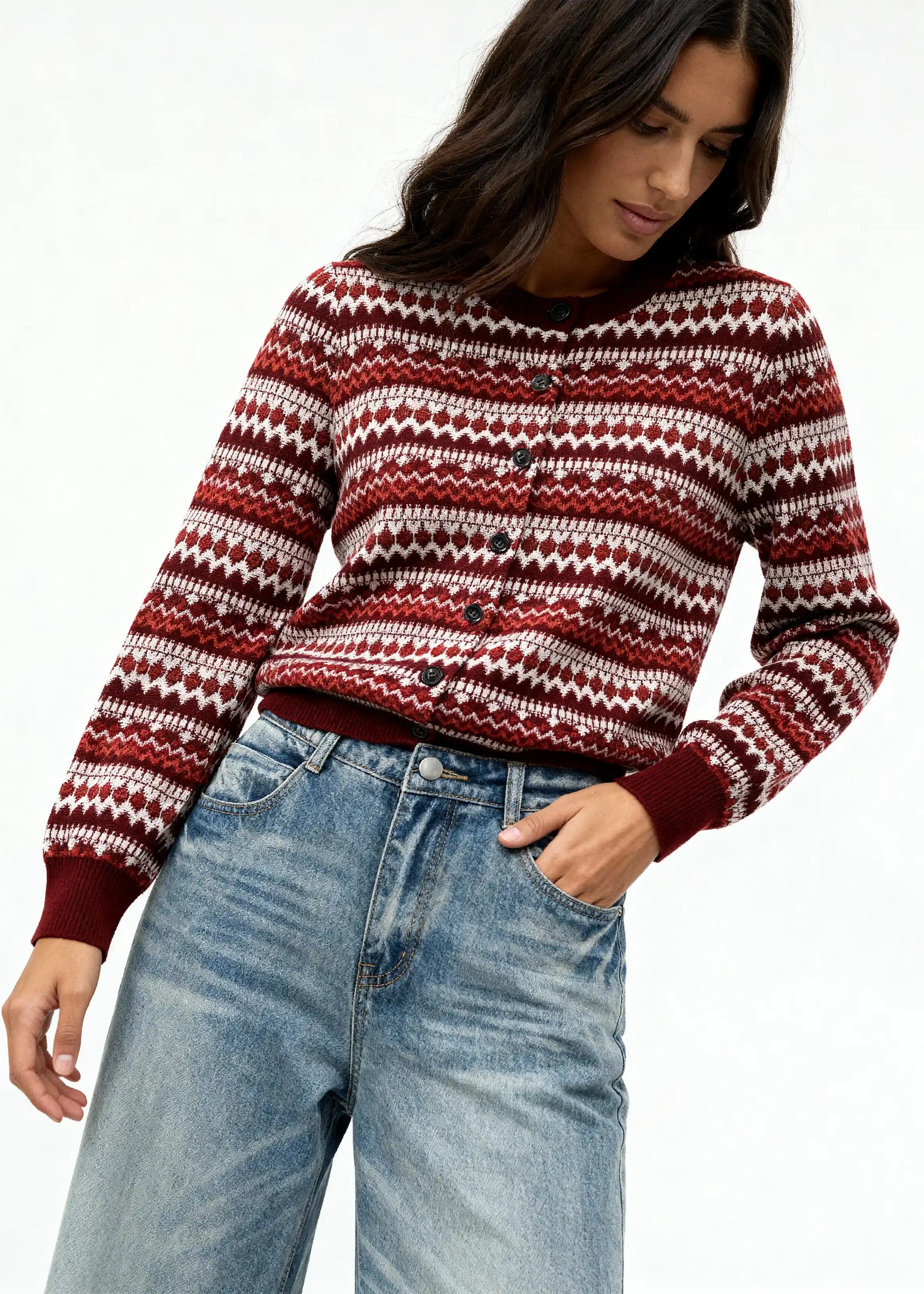A Fair Isle cardigan that doesn't require a trip to the Highlands. Knit in a traditional jacquard pattern with zigzags, dots, and geometric motifs that layer over one another in deep burgundy, bright red, and cream. Cropped just above the hip, with a relaxed fit that leaves room for layering over shirts or lightweight knits. It's cosier than it looks, warmer than you'd expect, and works rather well with everything from jeans to tailored trousers when you want a bit of pattern.