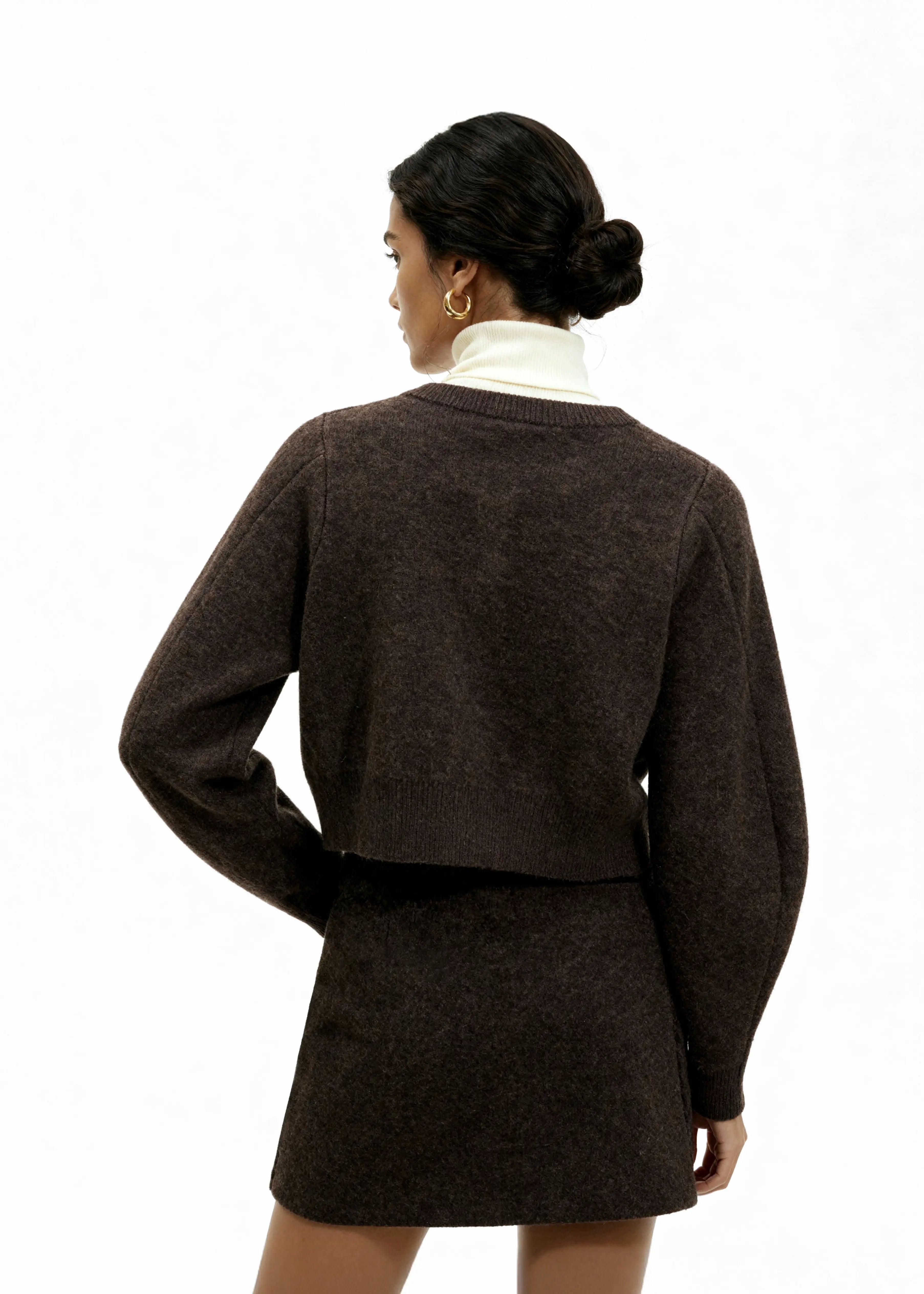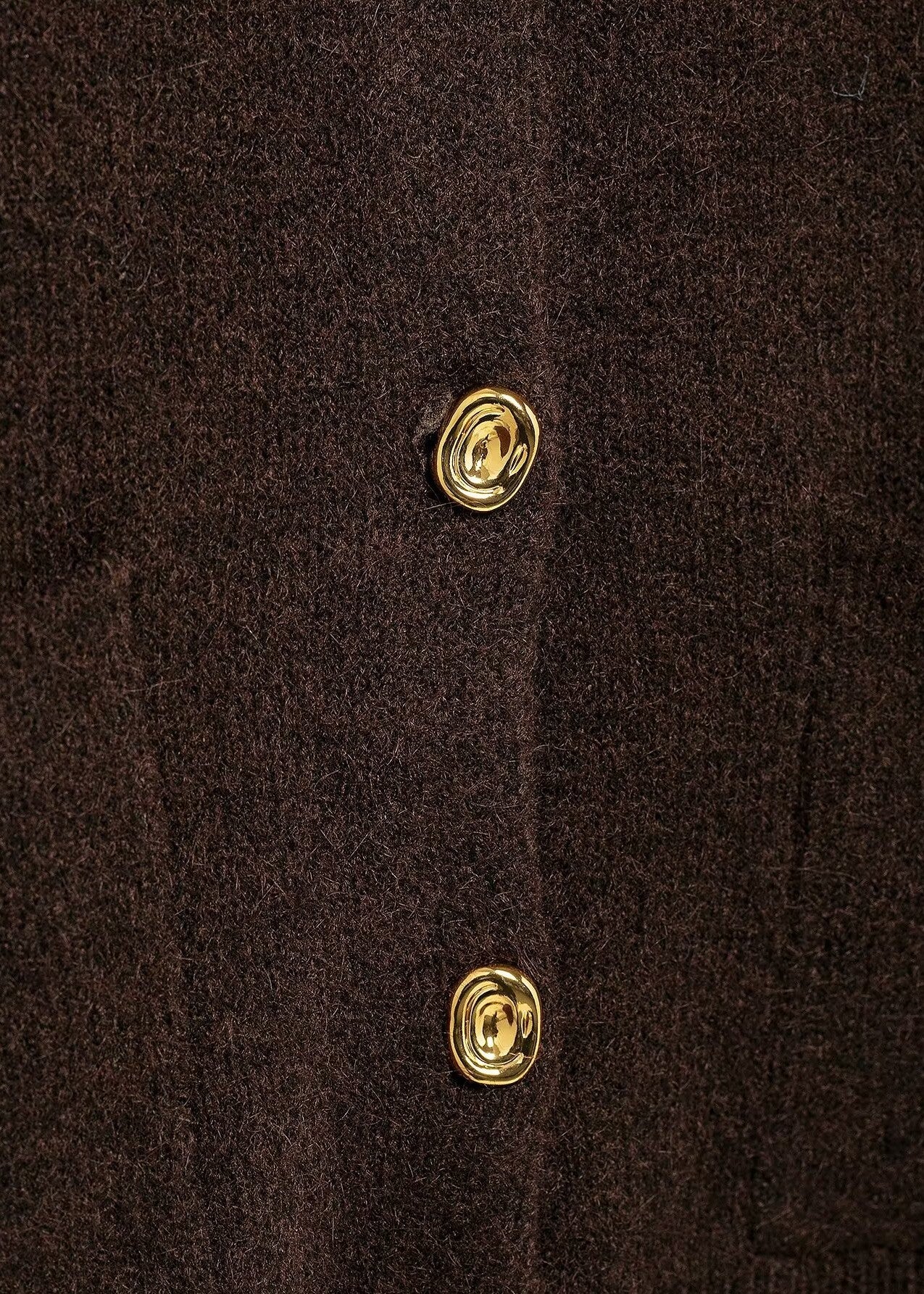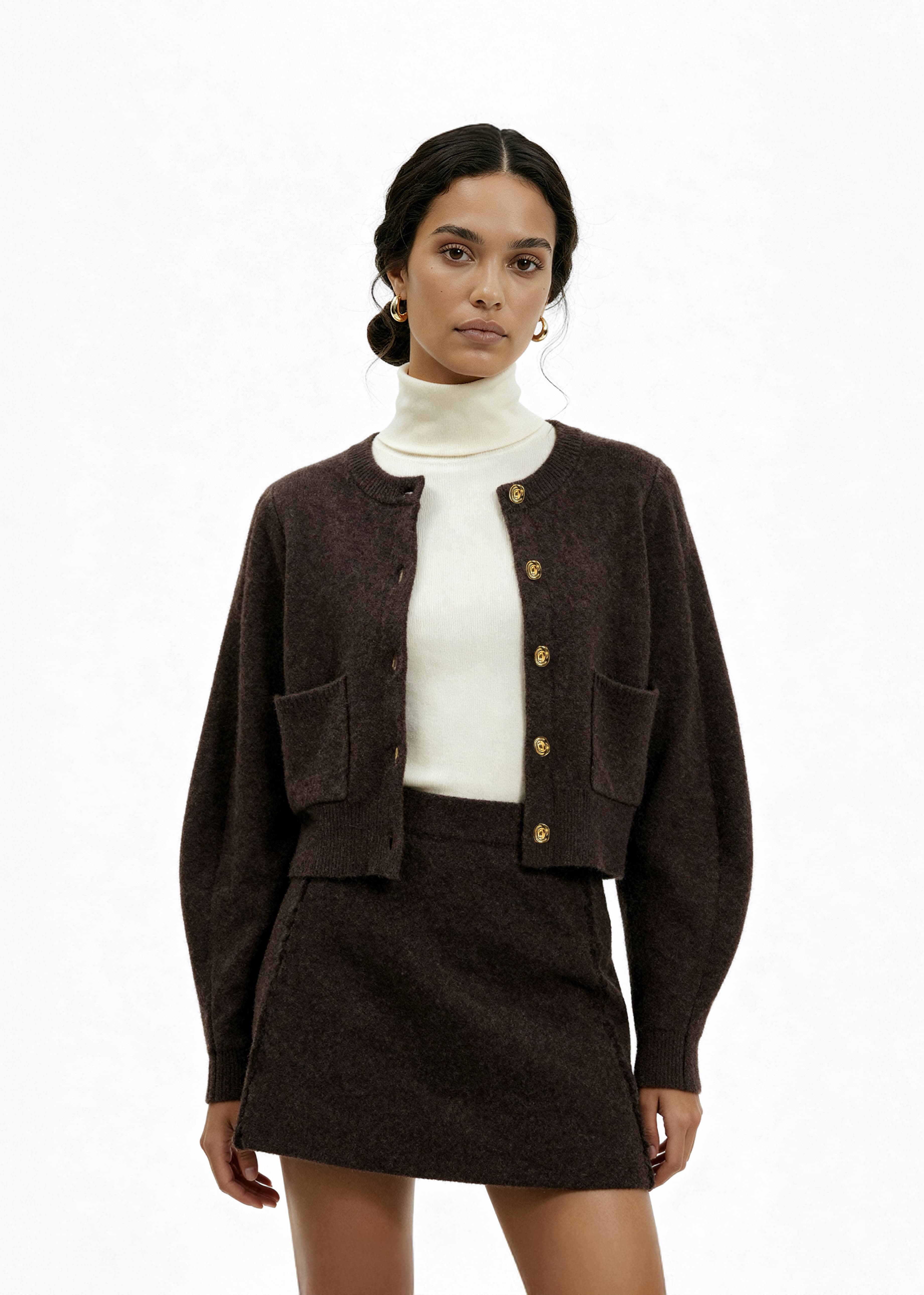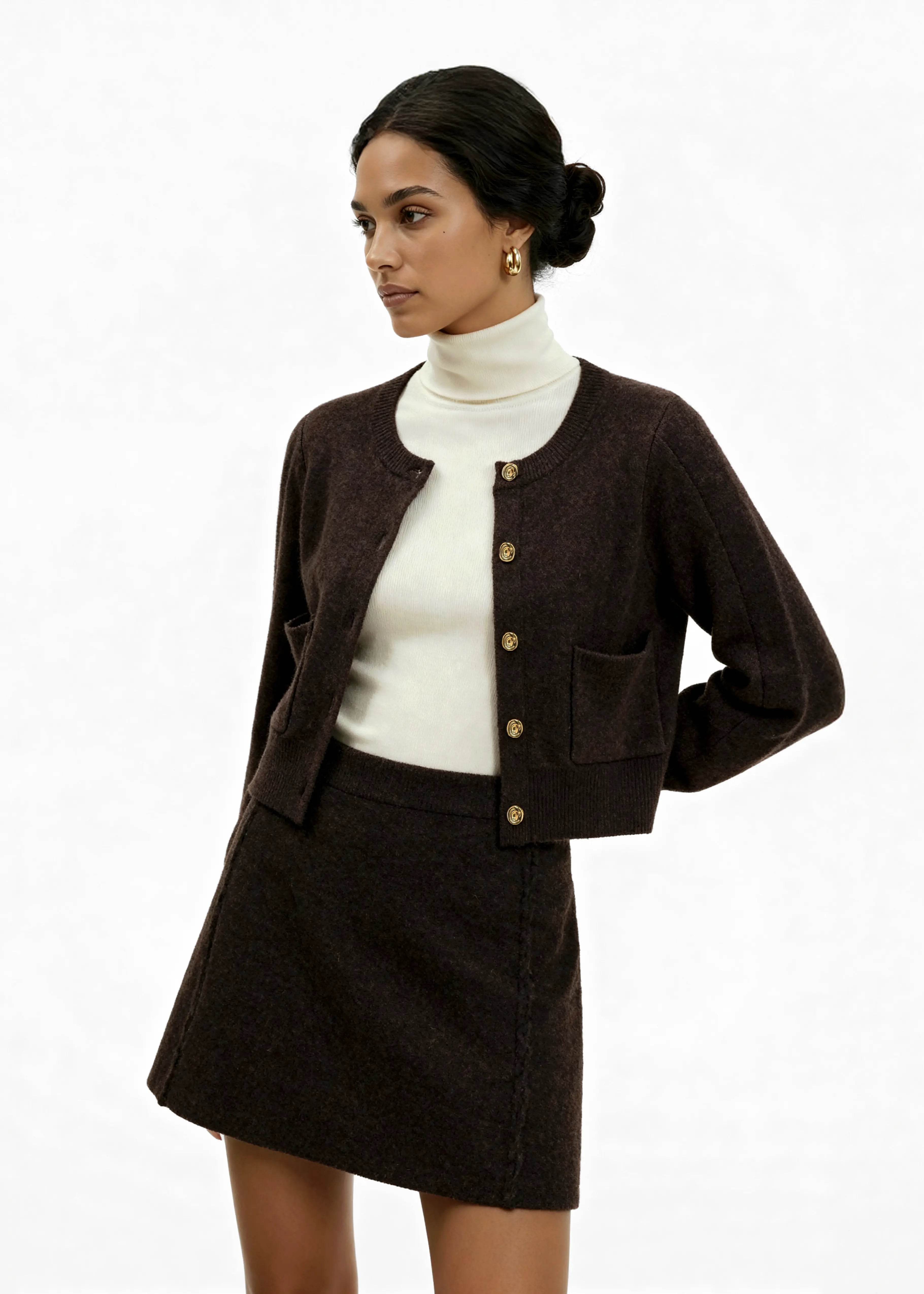 Gold buttons lend a touch of polish, while the dense ribbing at the cuffs and hem keeps the shape firm through wear. It is best worn layered, open or fastened, depending on how the day goes. Paired with its matching mini skirt, it becomes something sharper, almost tailored, though still unmistakably soft.