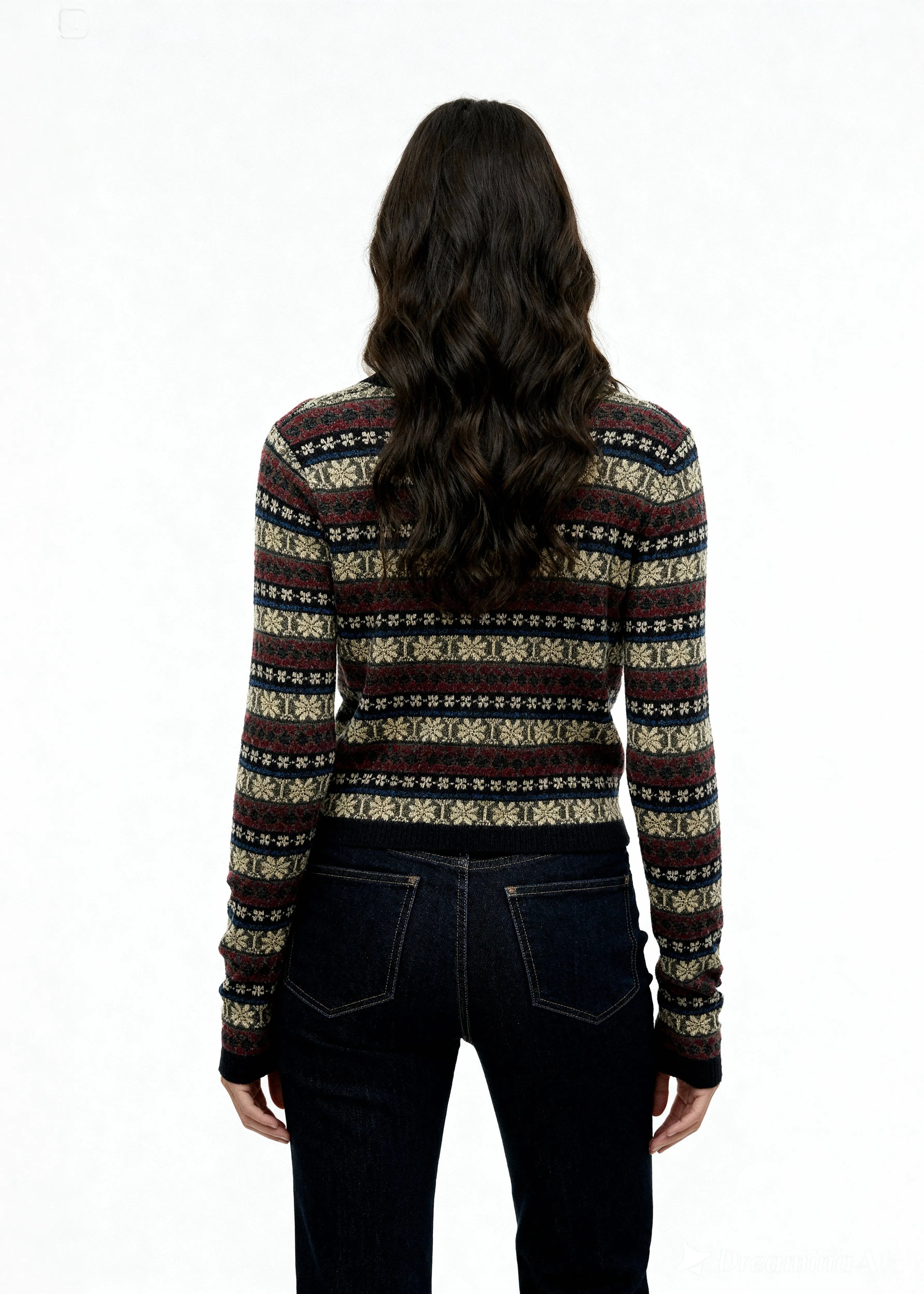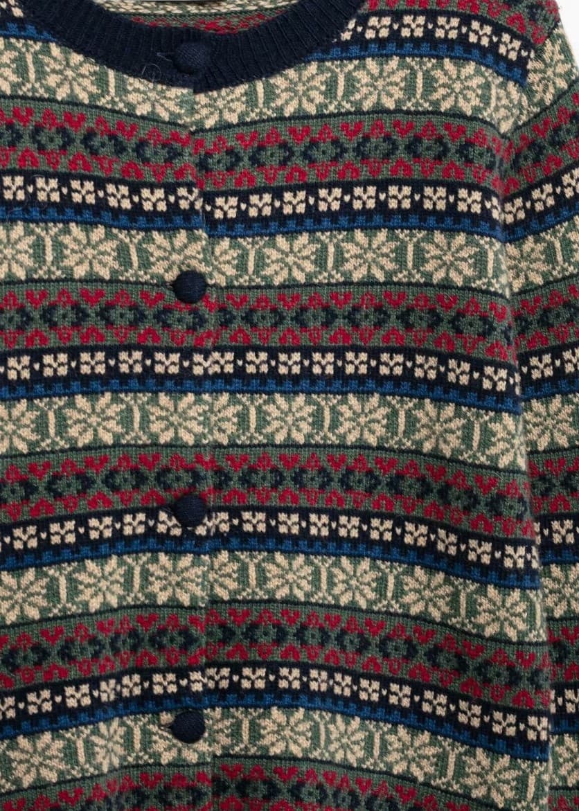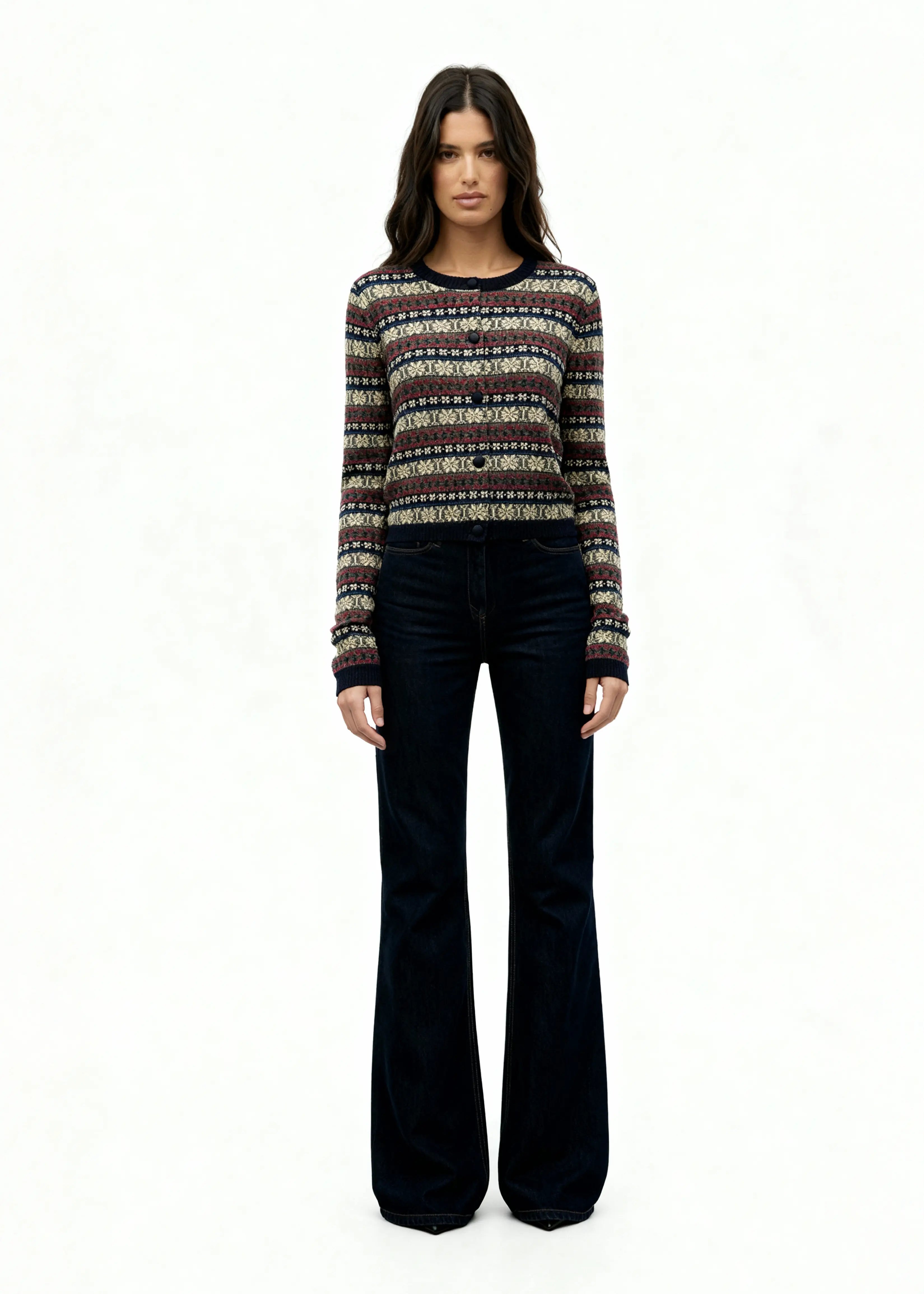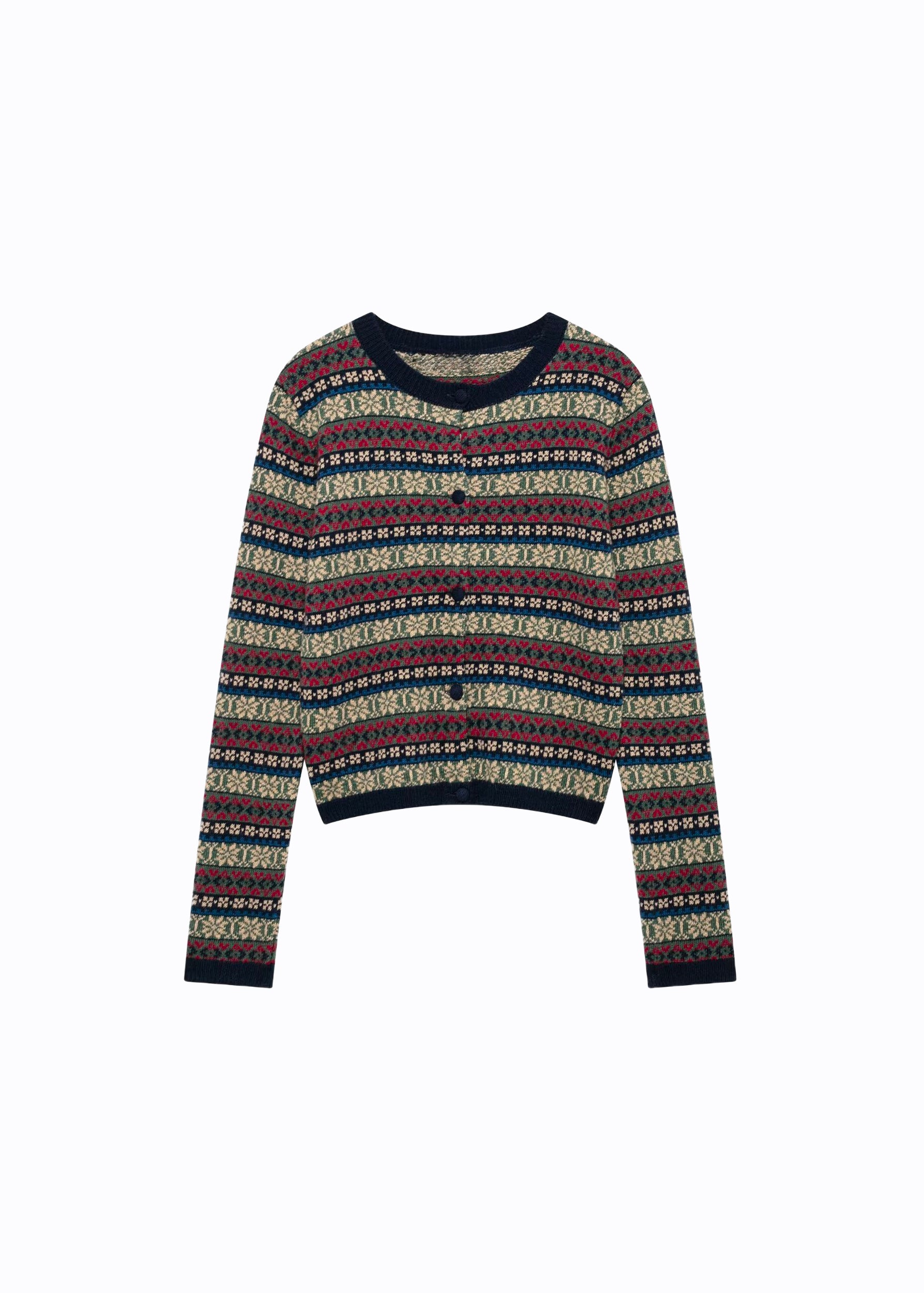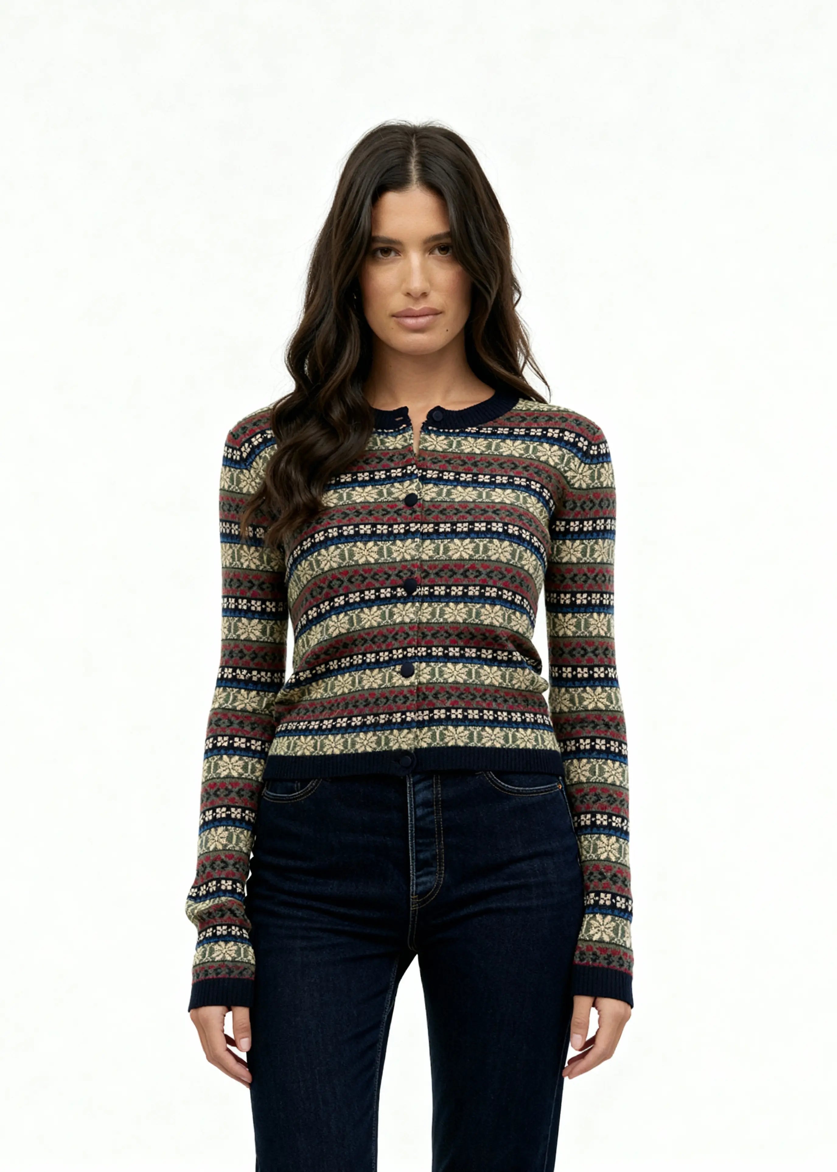 A modern nod to classic Fair Isle with intricate multi-colored patterning, trimmed in navy rib at the collar, cuffs, and hem. Cropped for a flattering fit that meets the waistband just so. Finished with covered buttons that behave beautifully. A cardigan that feels like conversation by the fire.