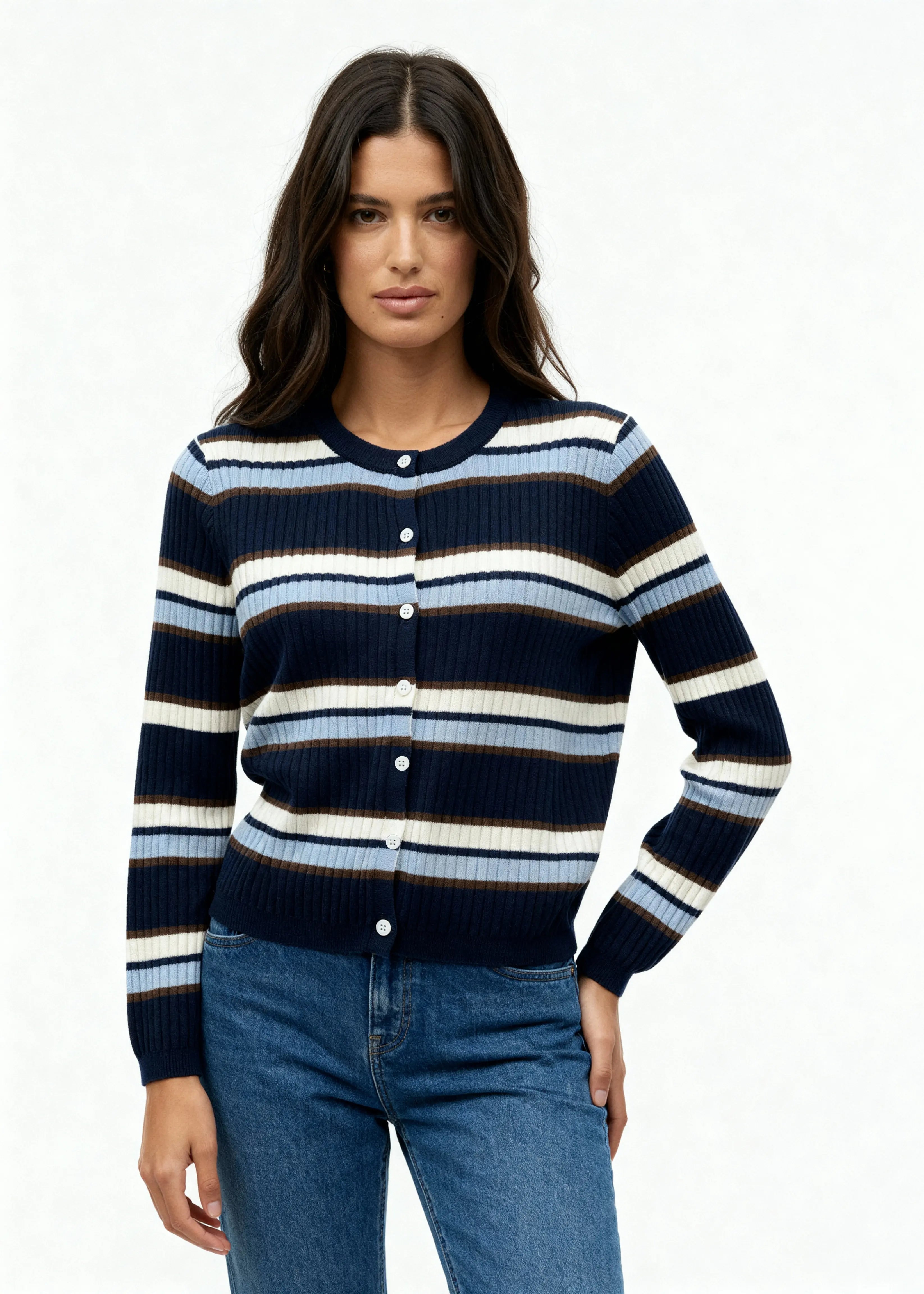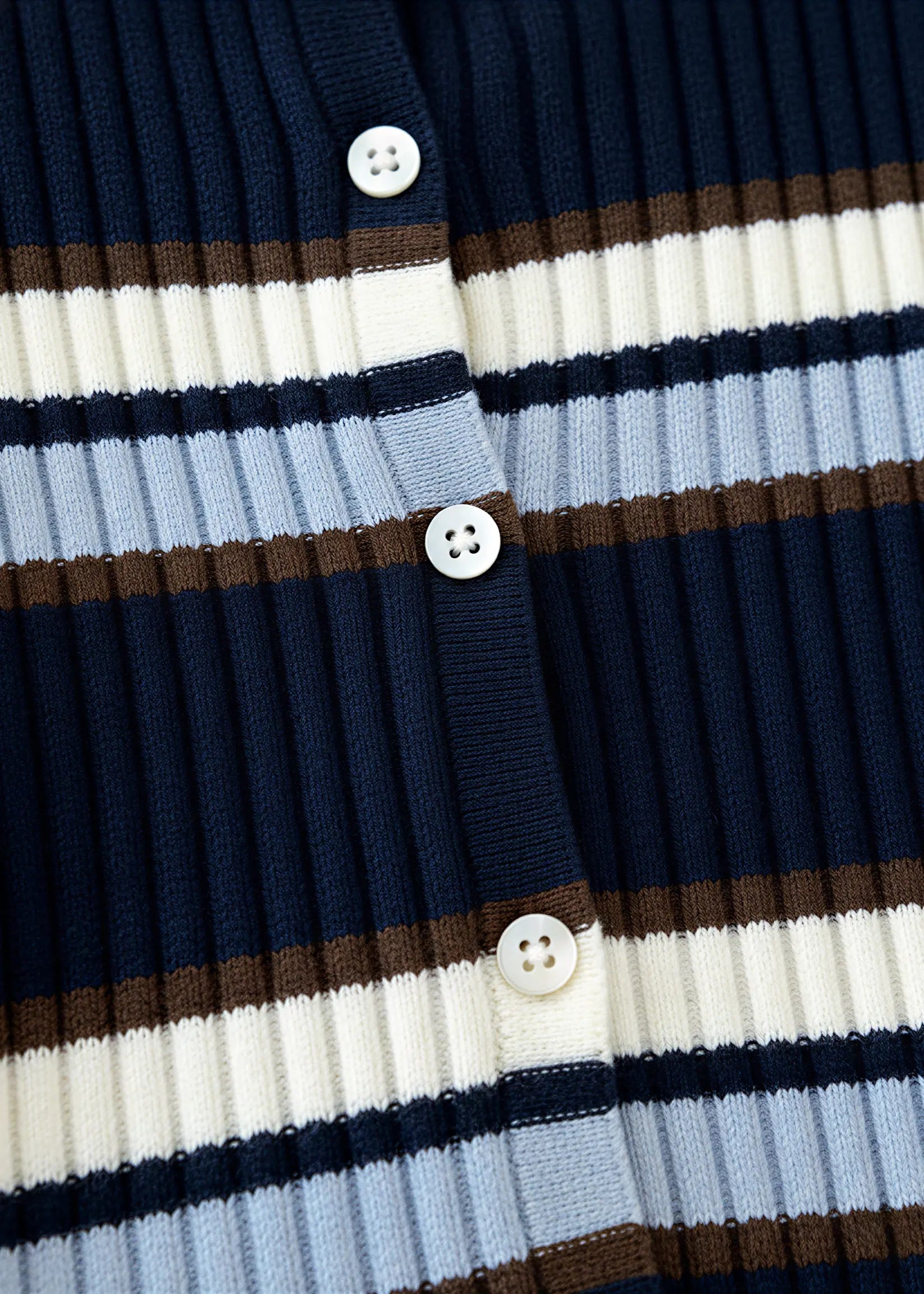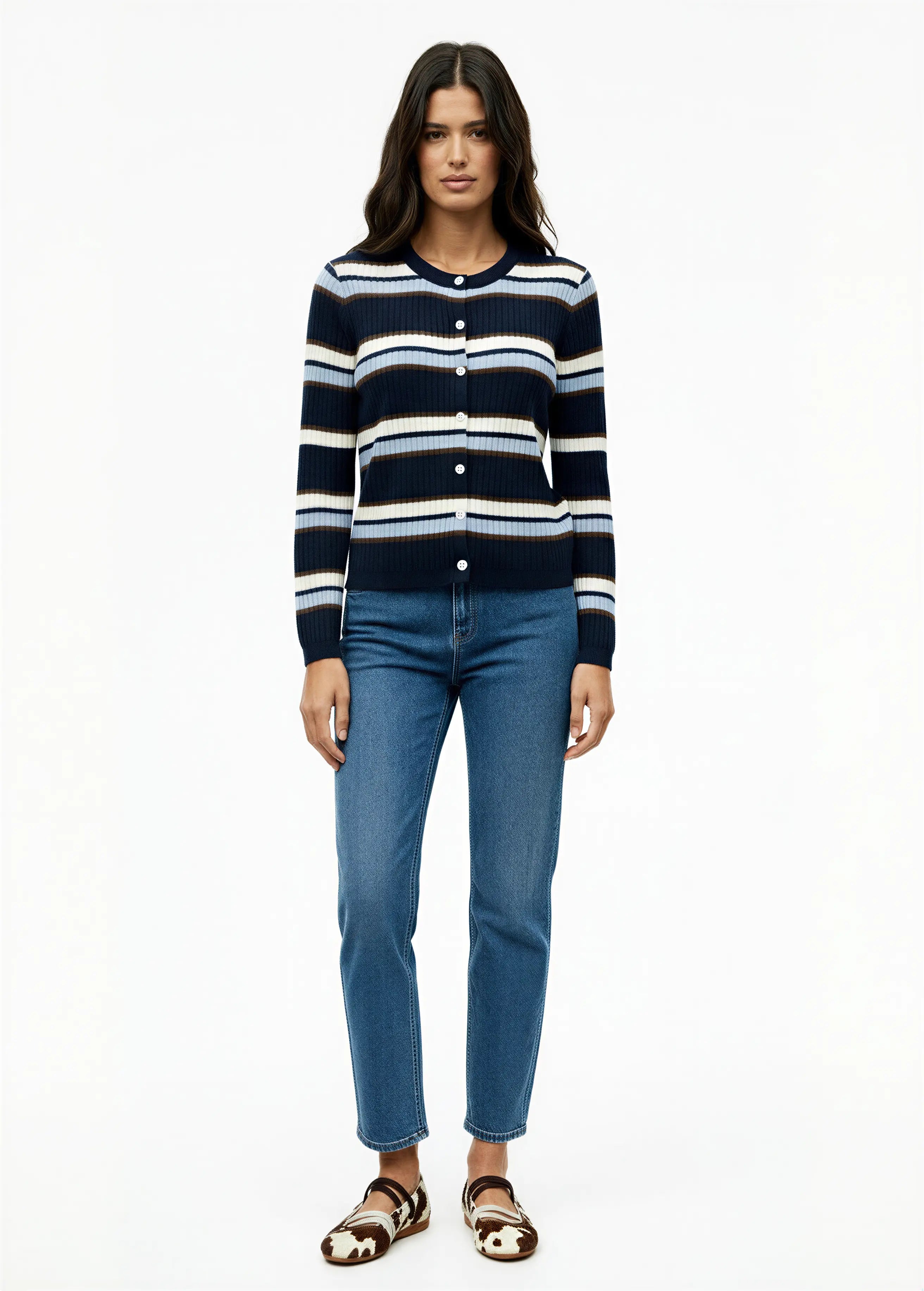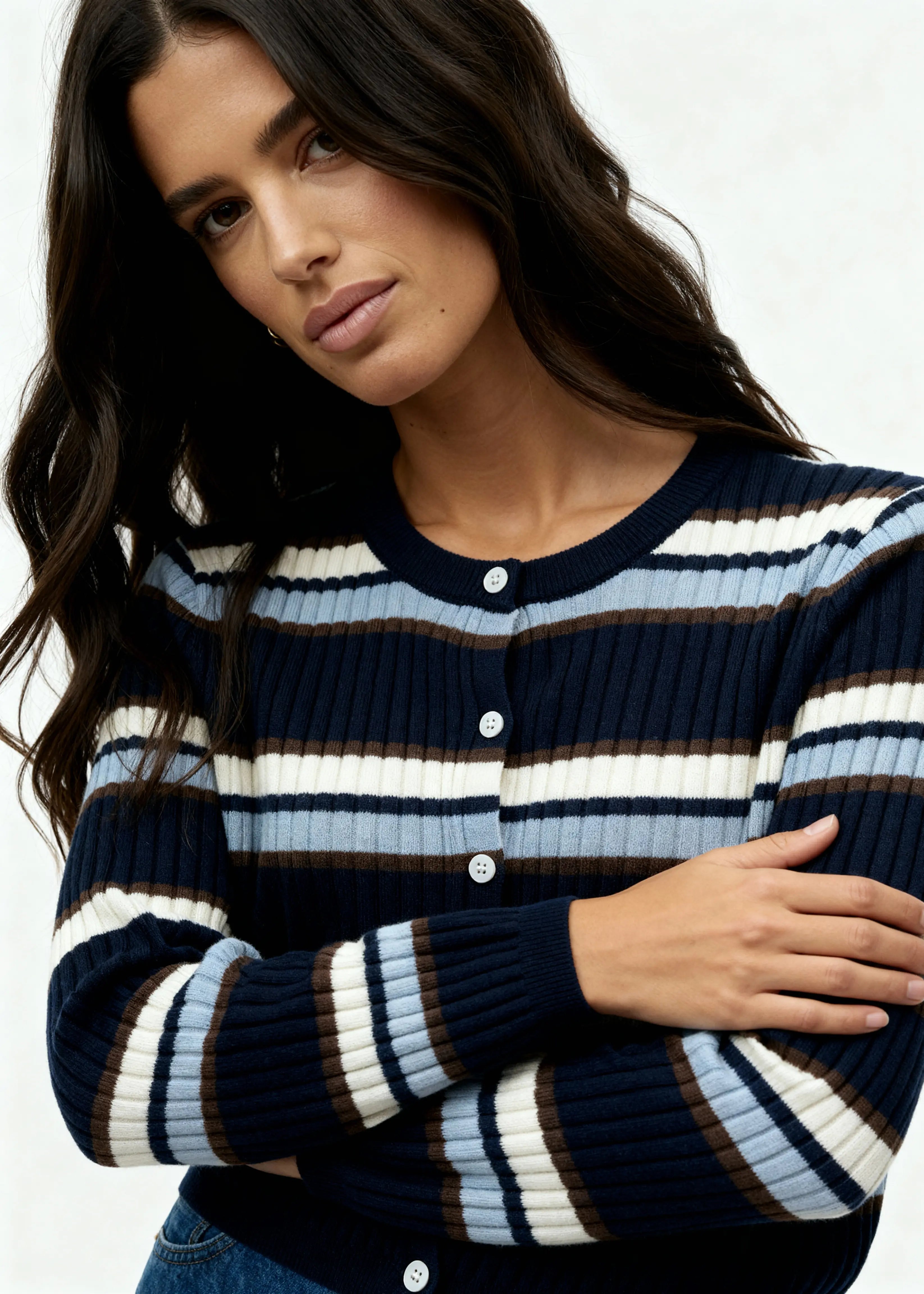 Easy on the eye, this one. It is knit in a chunky rib with horizontal stripes that create a satisfying geometric rhythm. Round neckline, button-through front with shell buttons, cropped at the natural waist. Fitted cuffs, relaxed through the body. Toss it over jeans or a slip skirt when you want visual interest without working too hard for it.