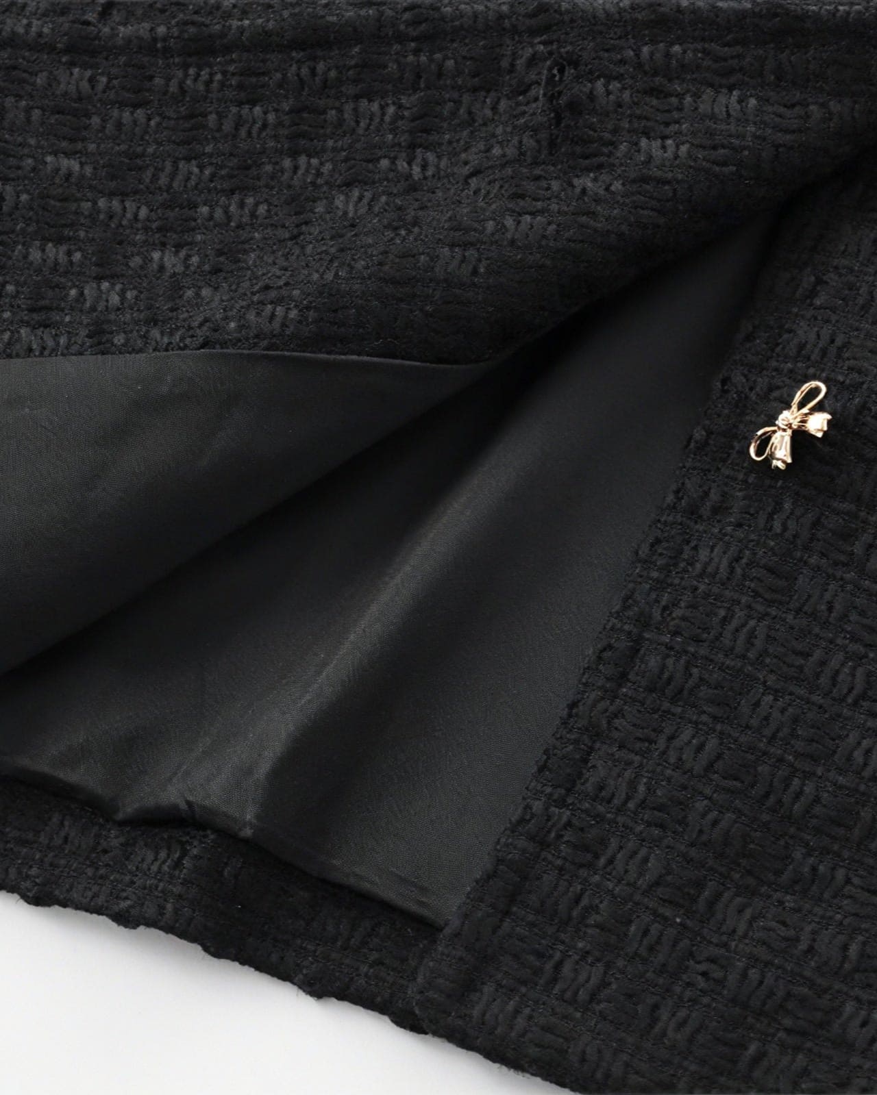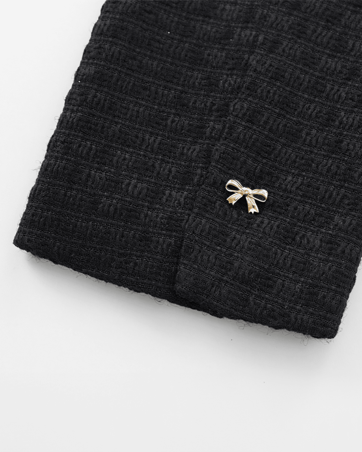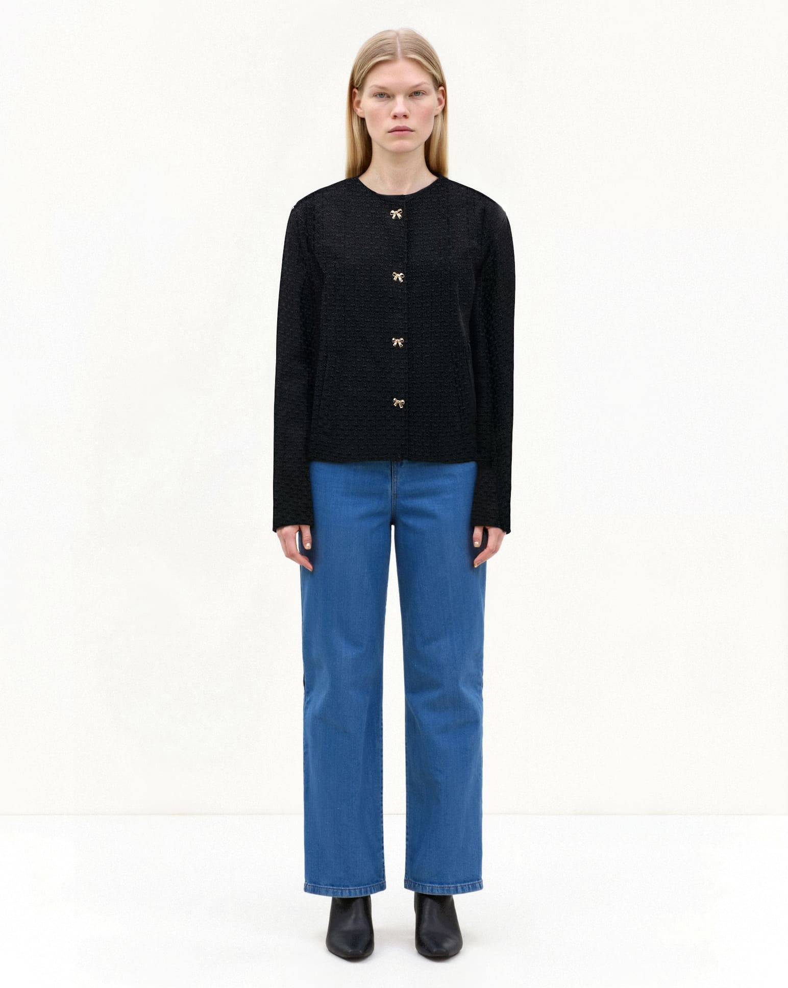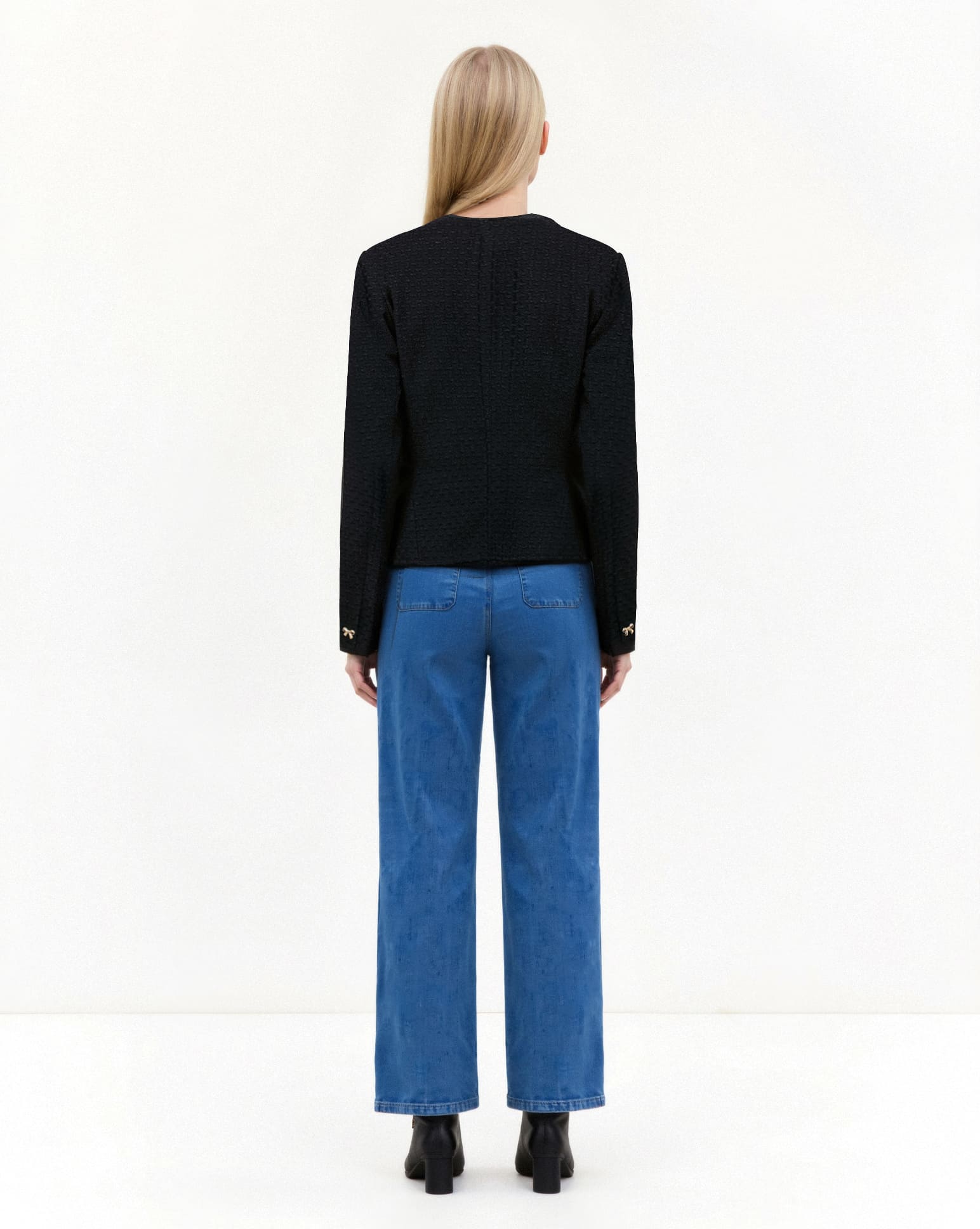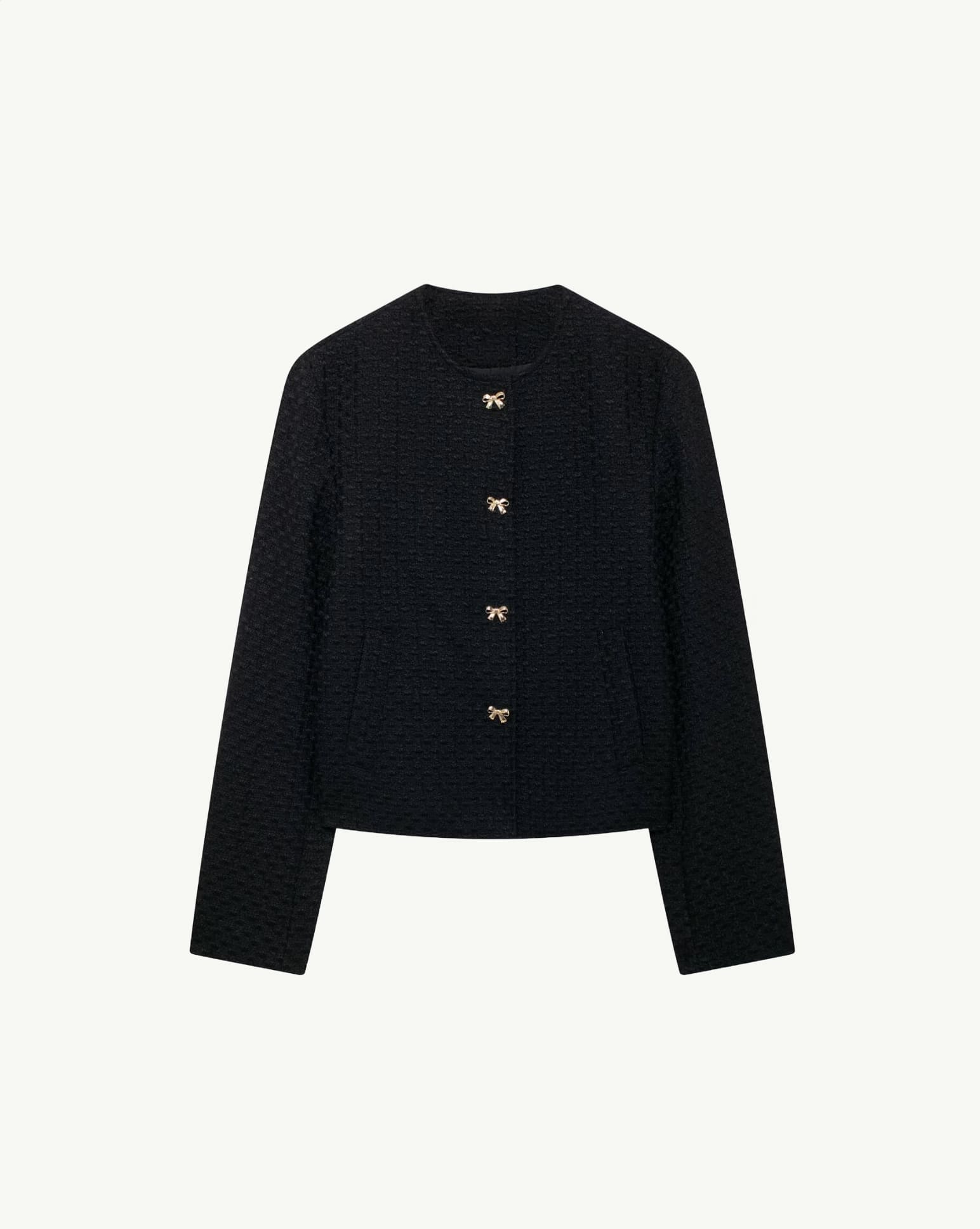 A cropped jacket crafted in textured noir bouclé with a refined basket weave pattern. The collarless neckline and hidden closure create clean lines, while delicate gold tone bow buttons add elegance. The cropped length and straight cut offer versatile styling options. Perfect over everything from silk blouses to fitted knits. The cropped silhouette pairs beautifully with high-waisted pieces. For evening, try it over a slip dress with delicate jewelry to complement the bow buttons.