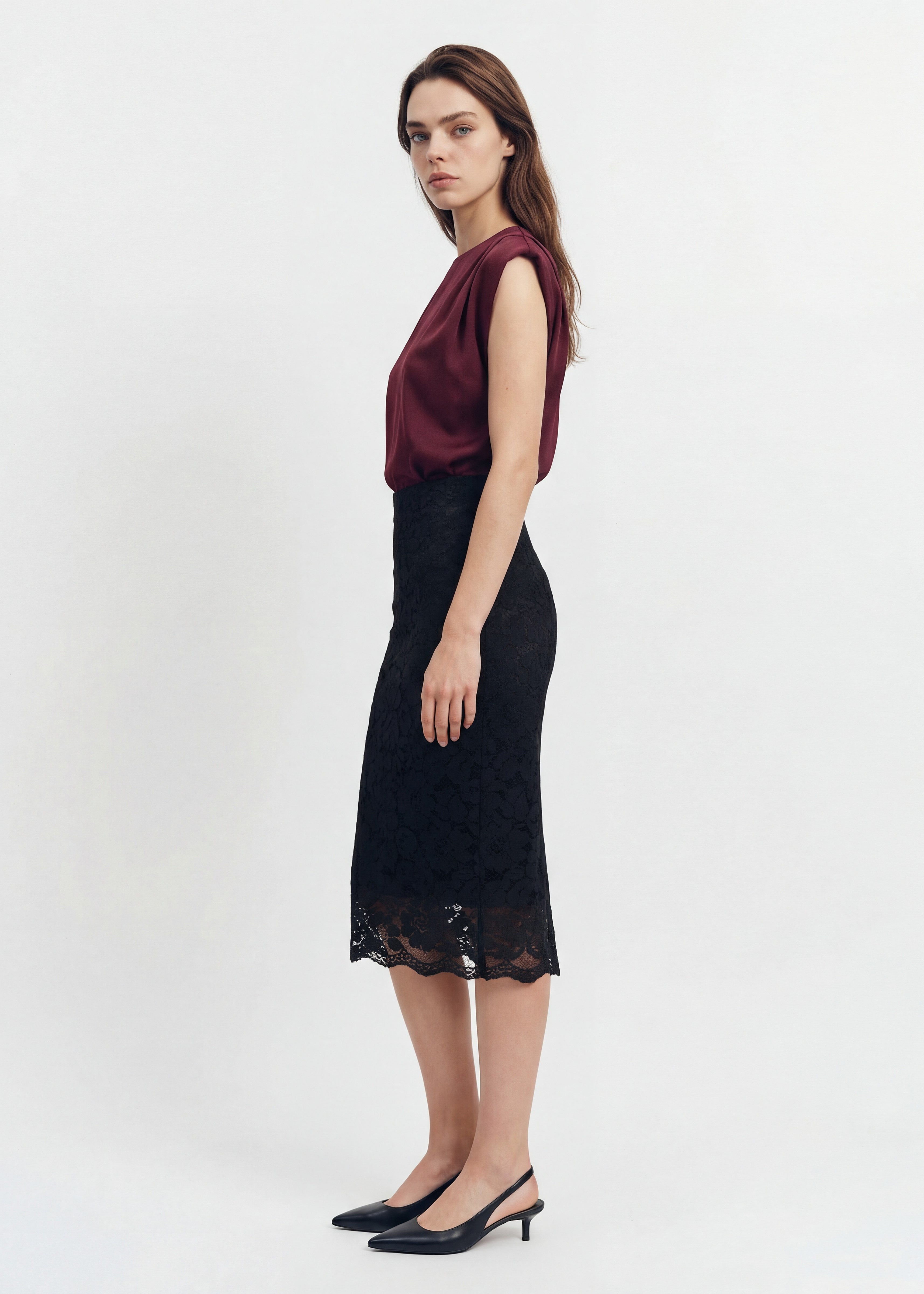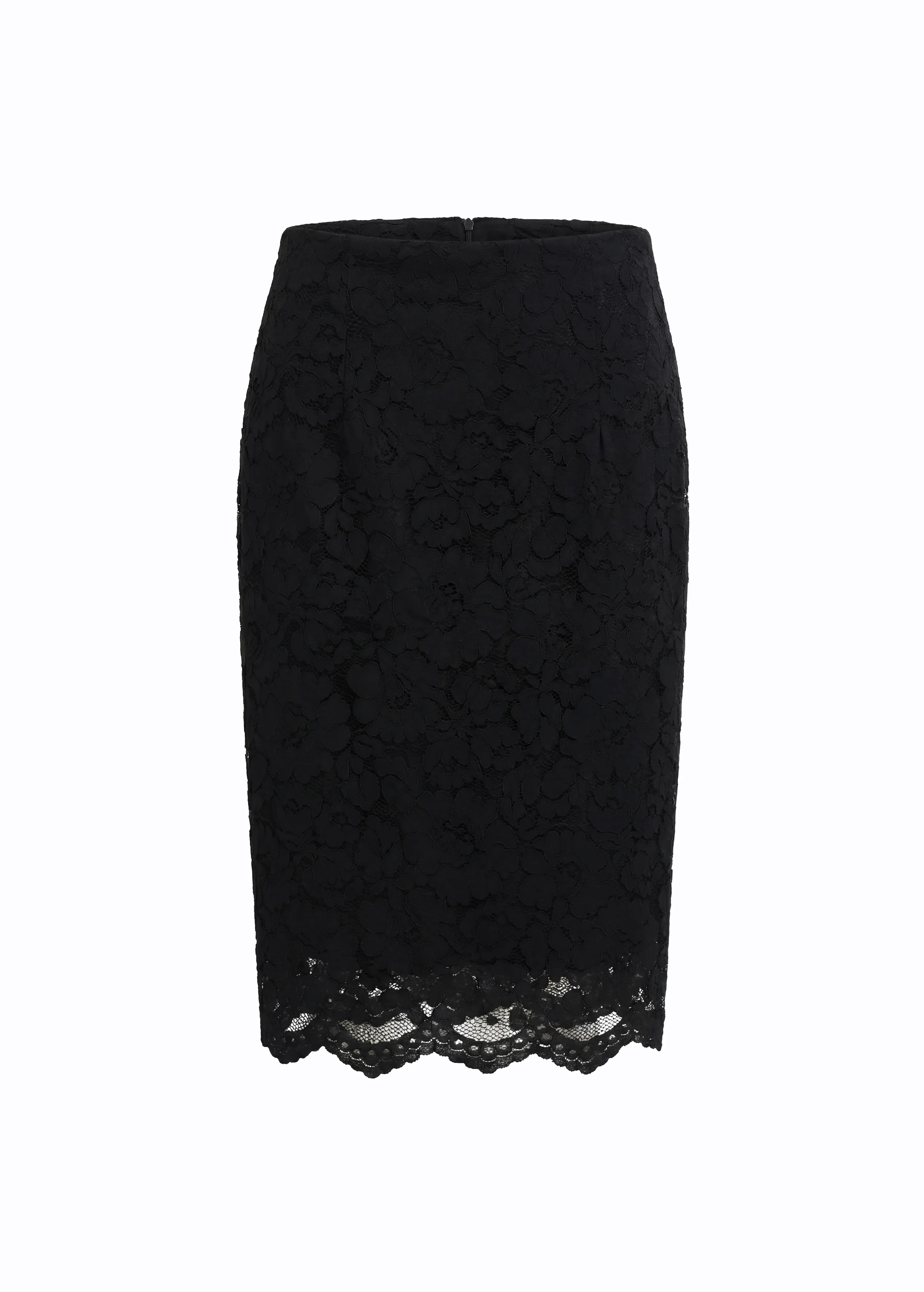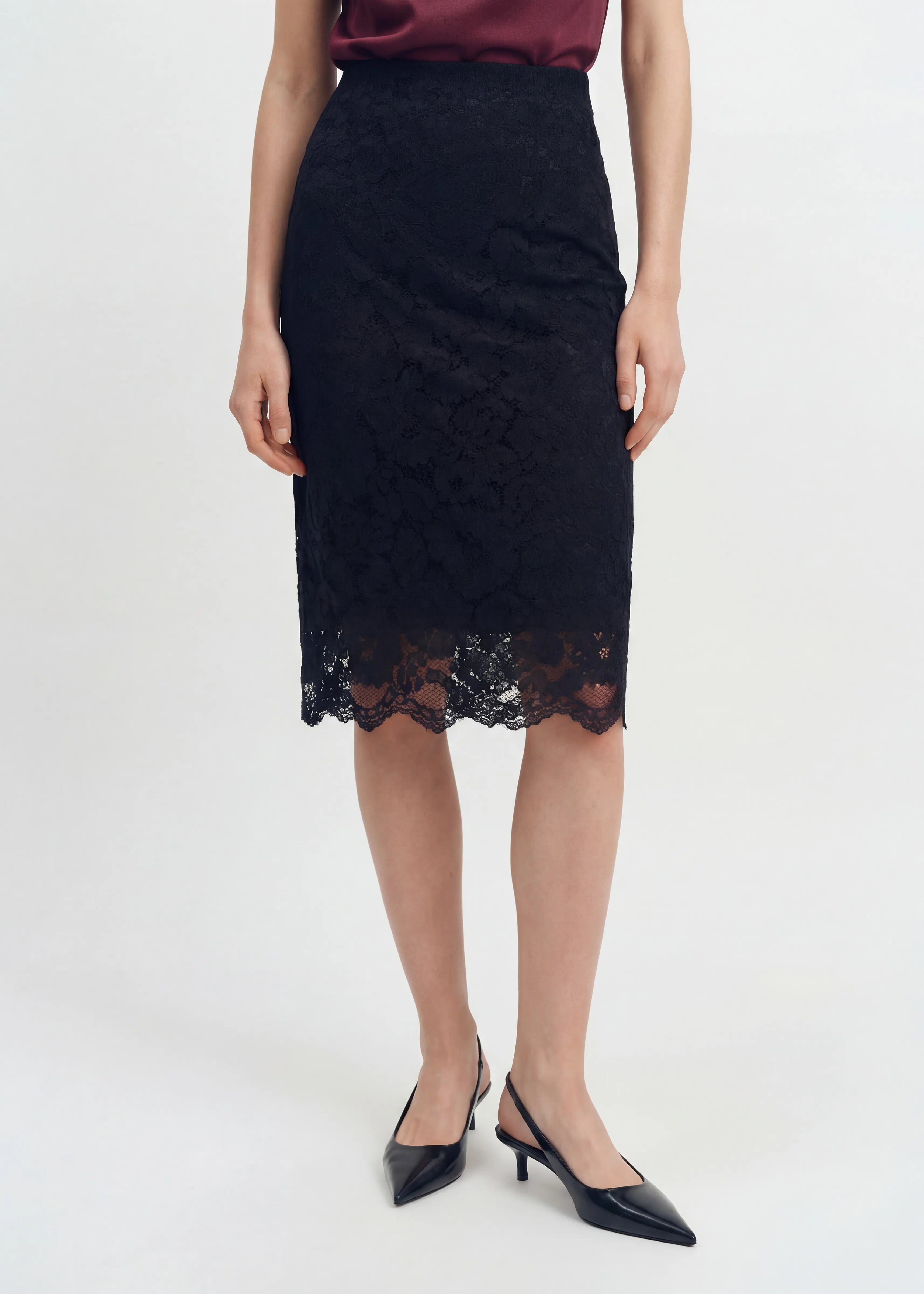 A refined midi skirt crafted in delicate lace with a smooth lining for comfort. Designed with a high waist, fitted silhouette and scalloped hem, finished with a back split for ease of movement. An elevated essential for day to evening styling.