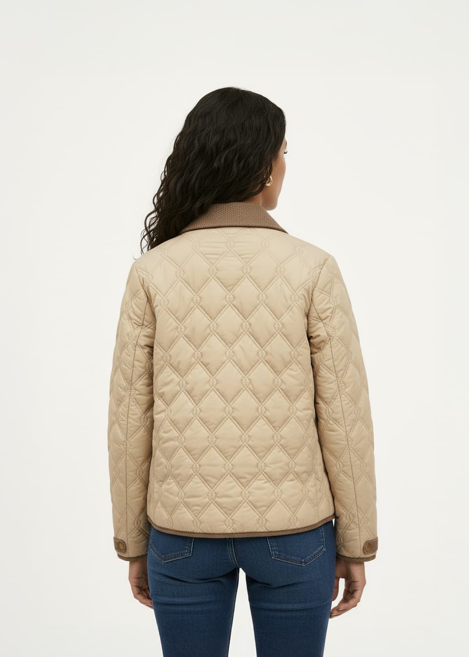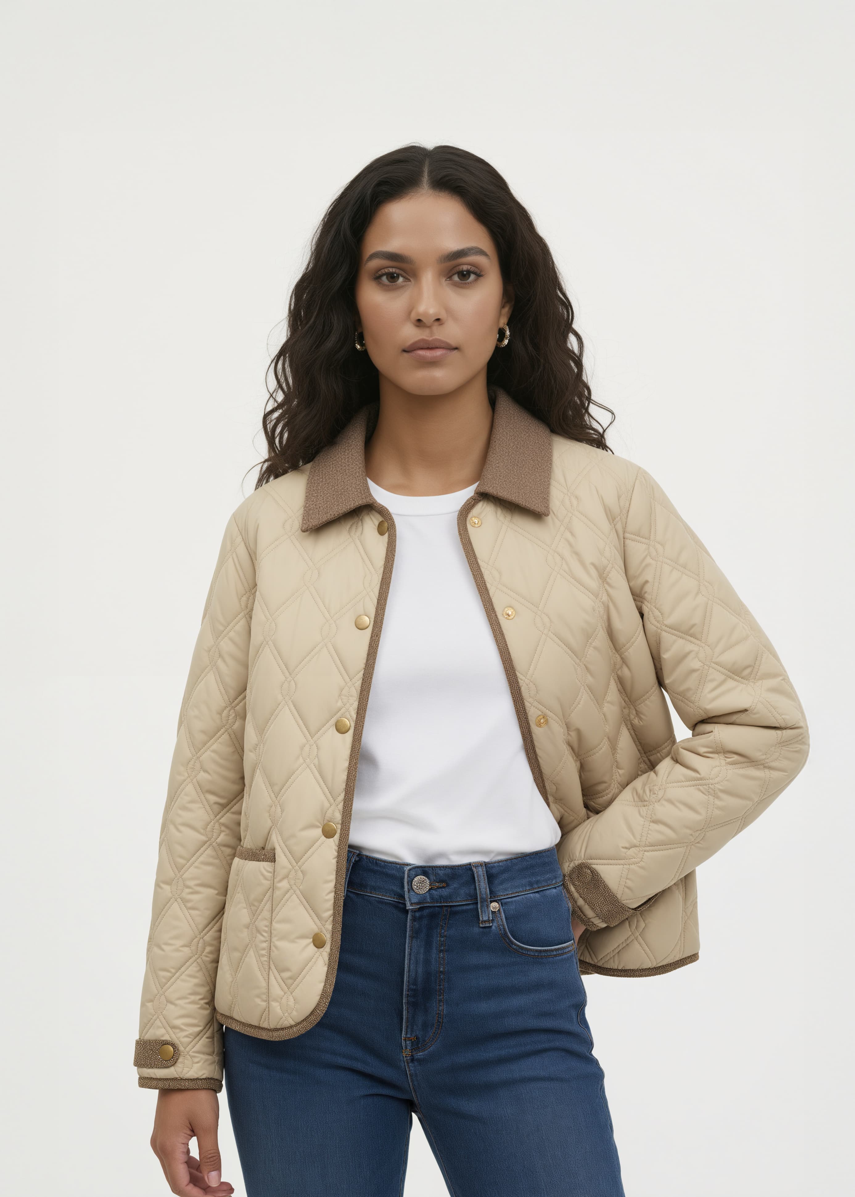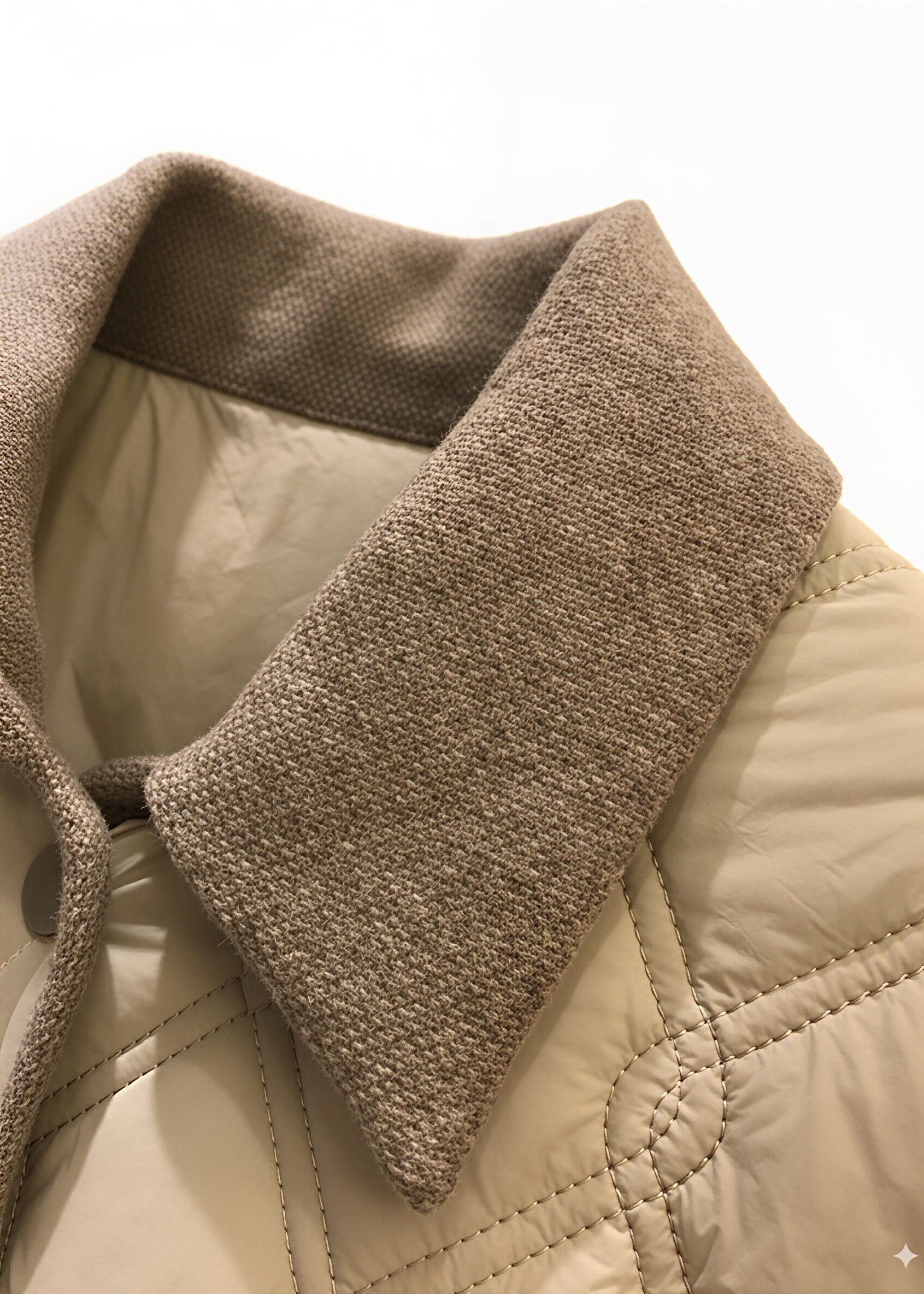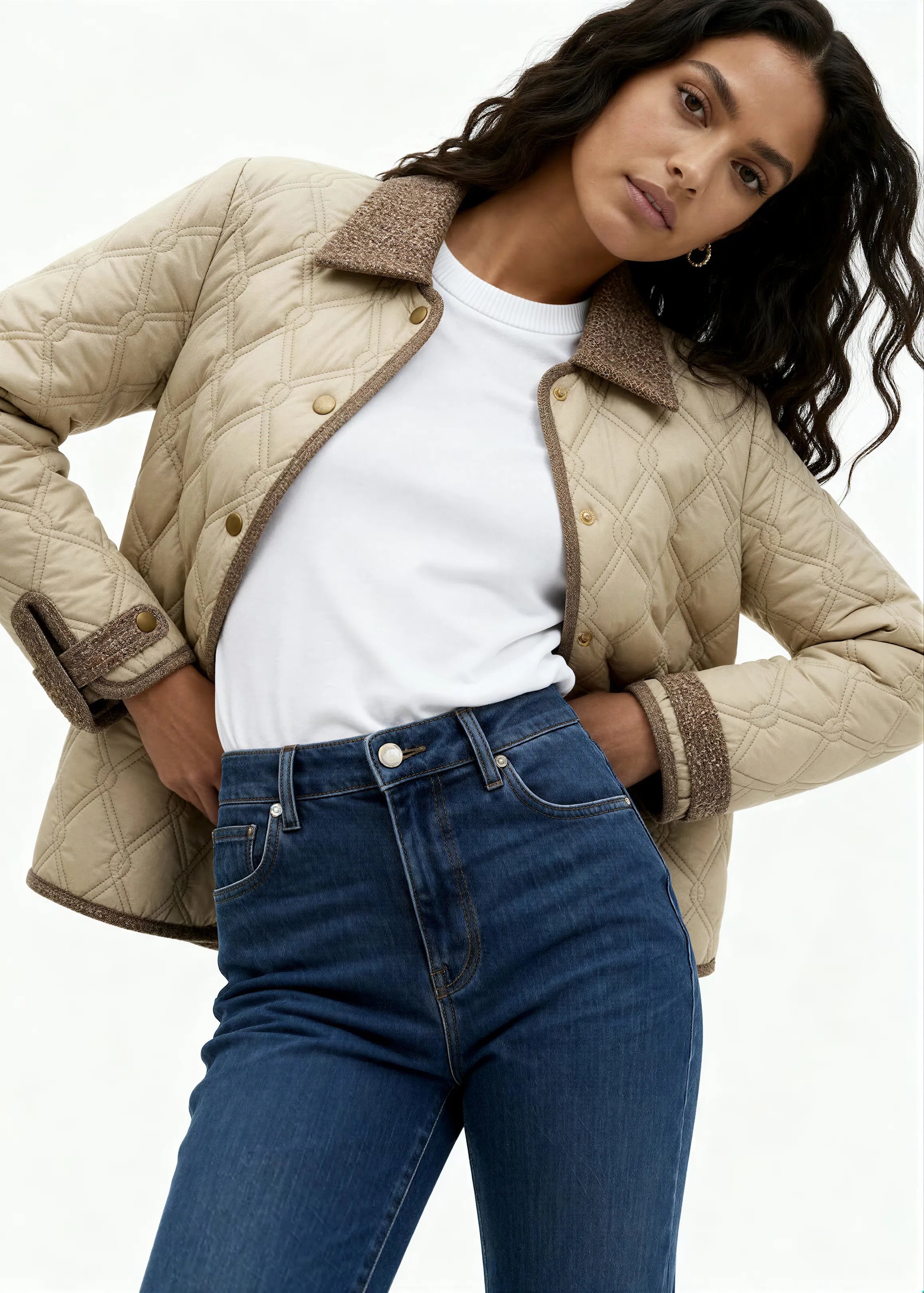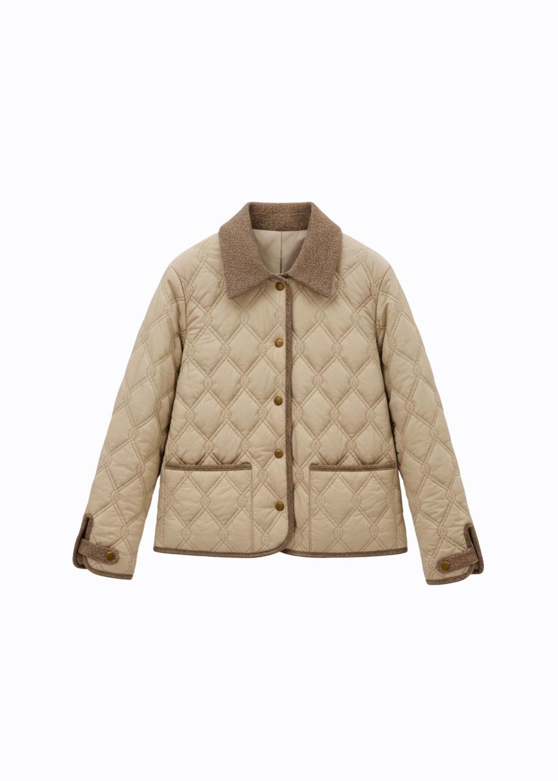 A lightly padded jacket with diamond quilting and textured tweed trim. The collar, cuffs, and edges are finished in contrast tweed for added warmth and structure. Snap button closure through the front keeps the lines clean, while patch pockets offer practical detail. The fit sits just above the hip, balancing comfort with shape.