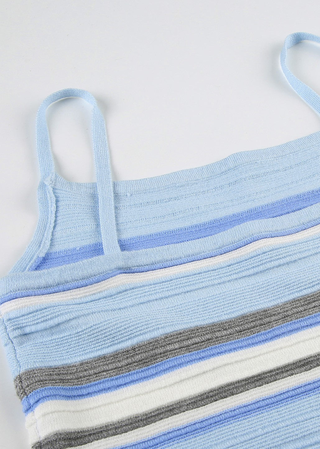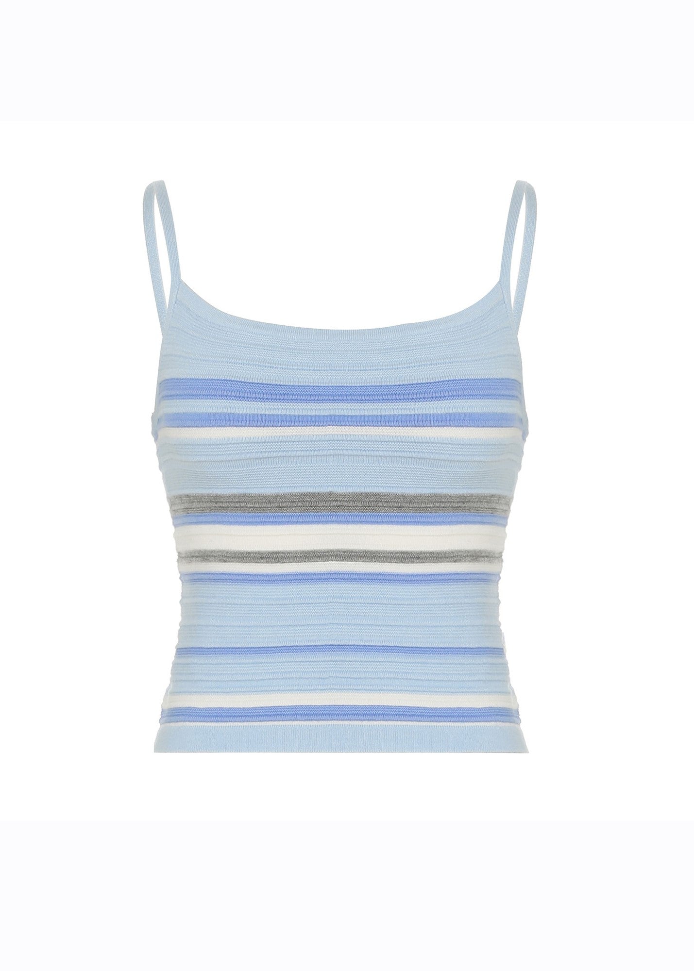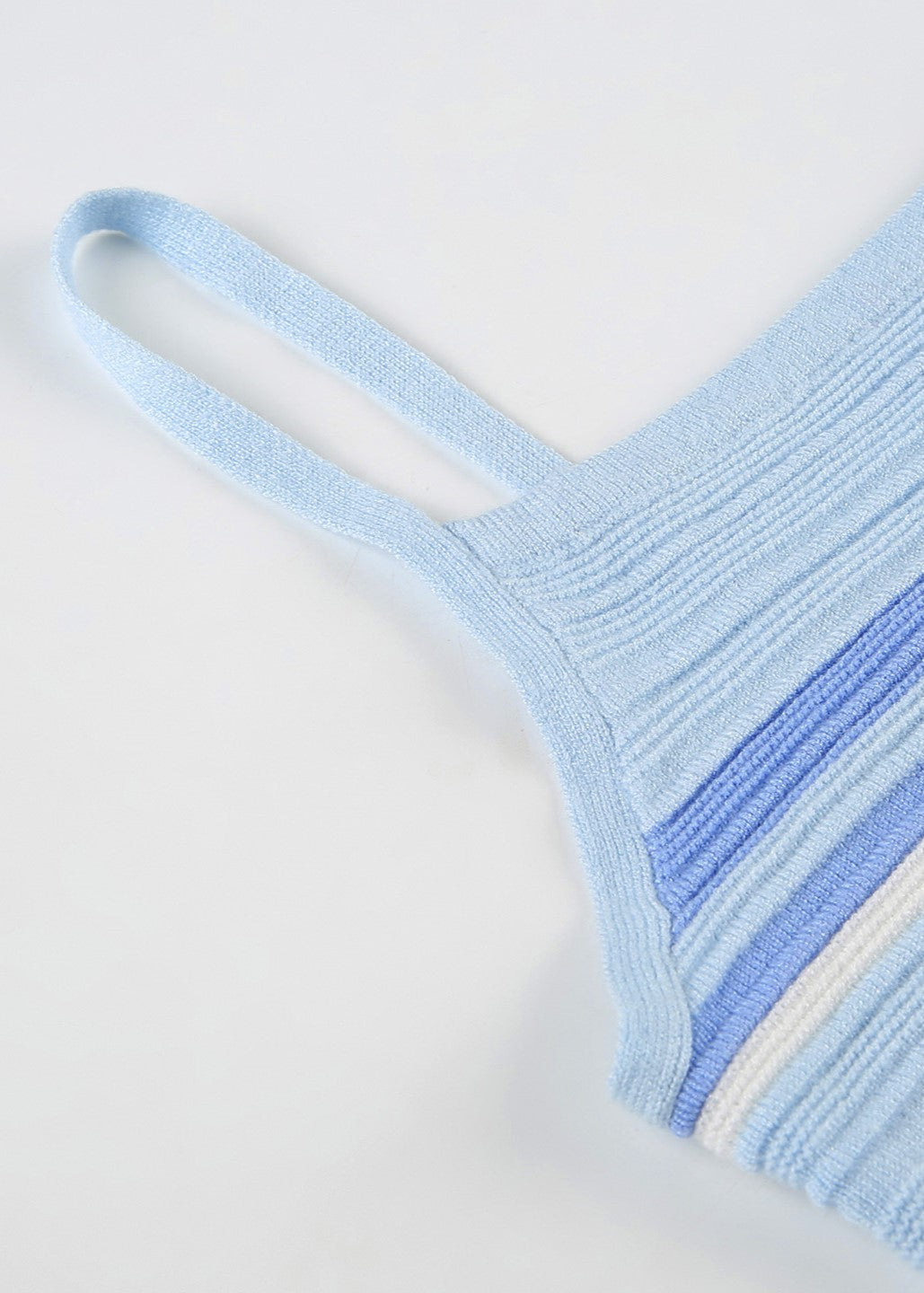 A small, playful top with a sense of its own proportion. It is a garment designed for confident movement, with a simple, decisive cut that ends high on the torso. Its tight, ribbed knit holds a form both classic and modern, with a series of precise stripes in varying shades of blue, lavender, gray, and white.