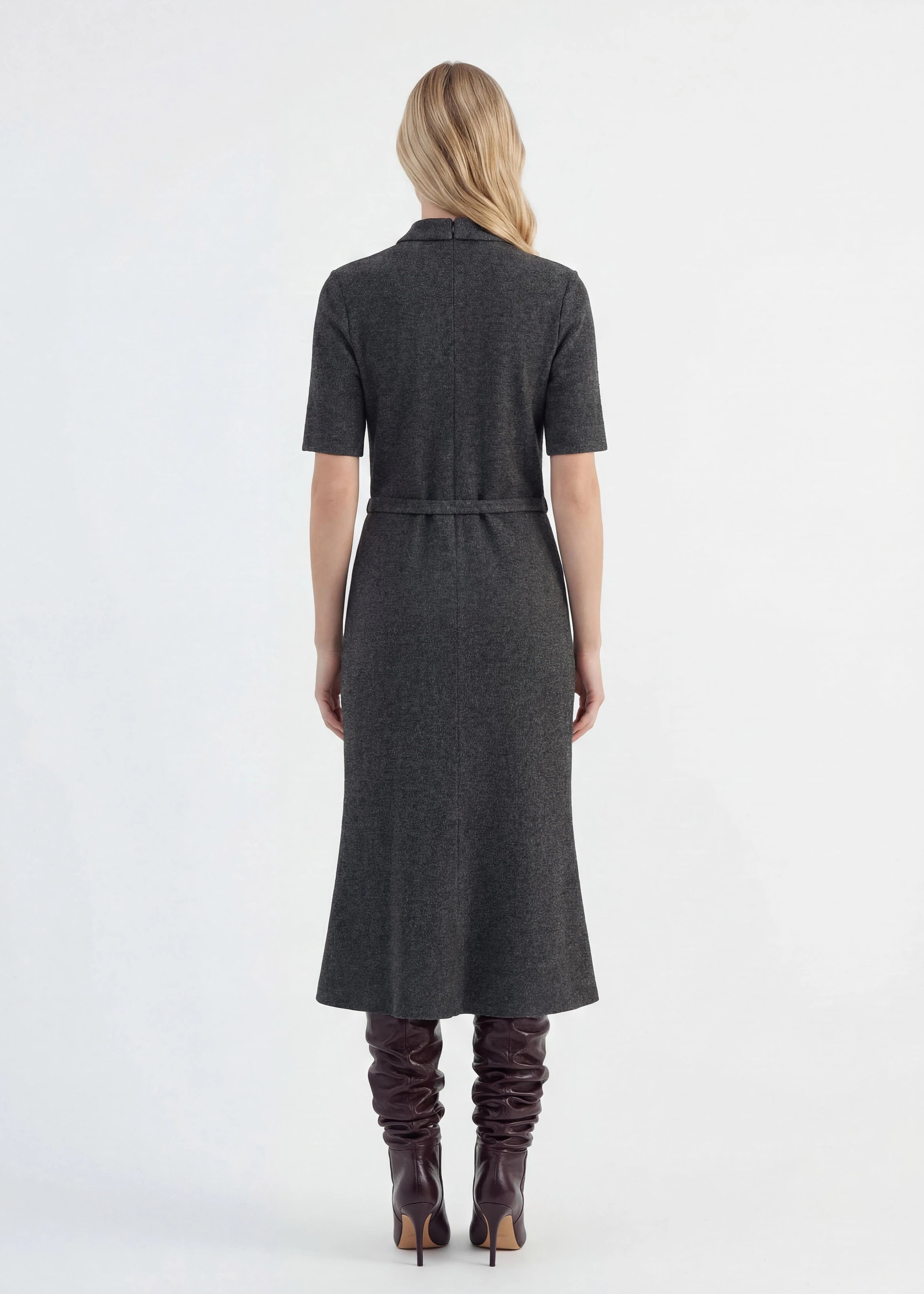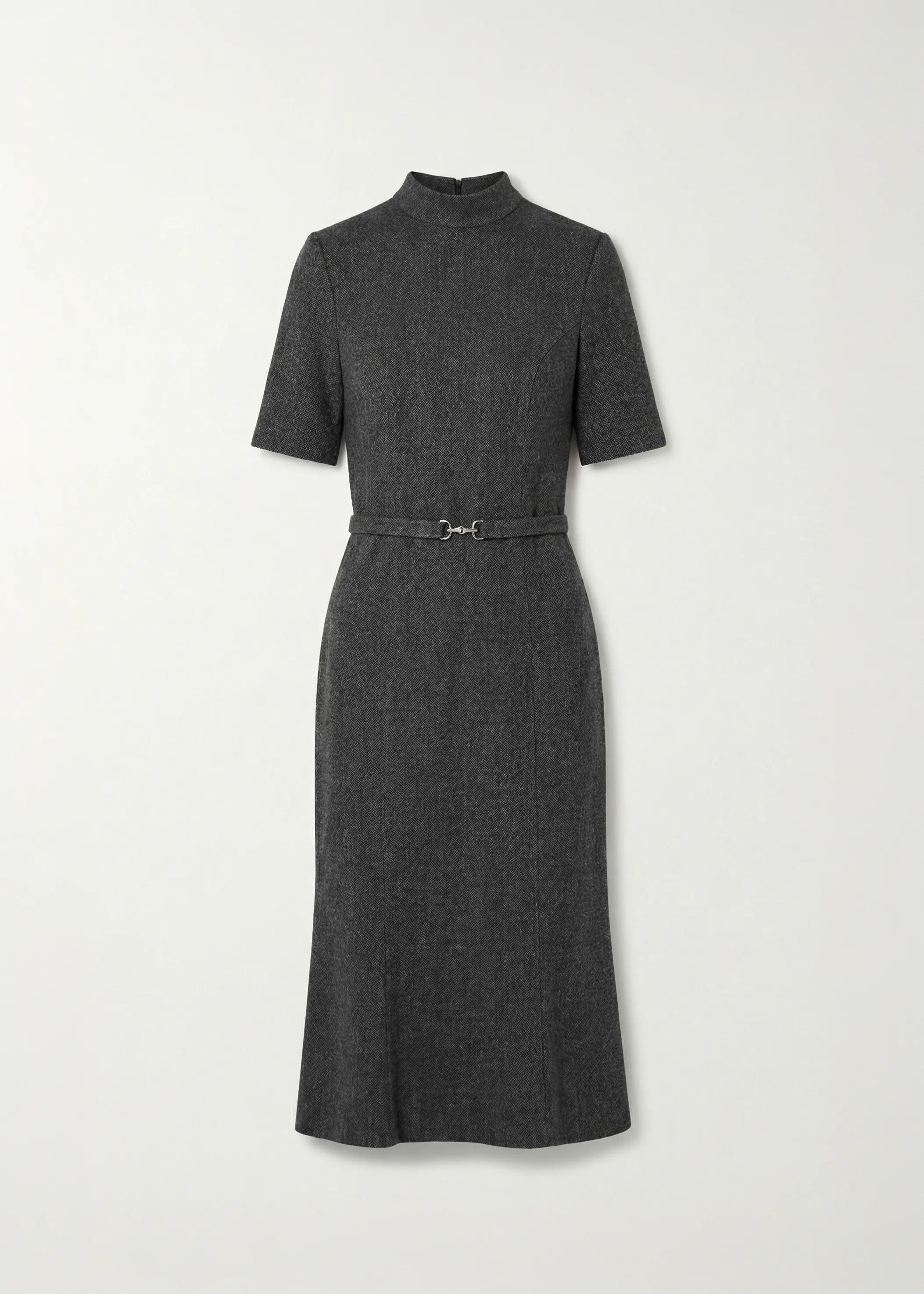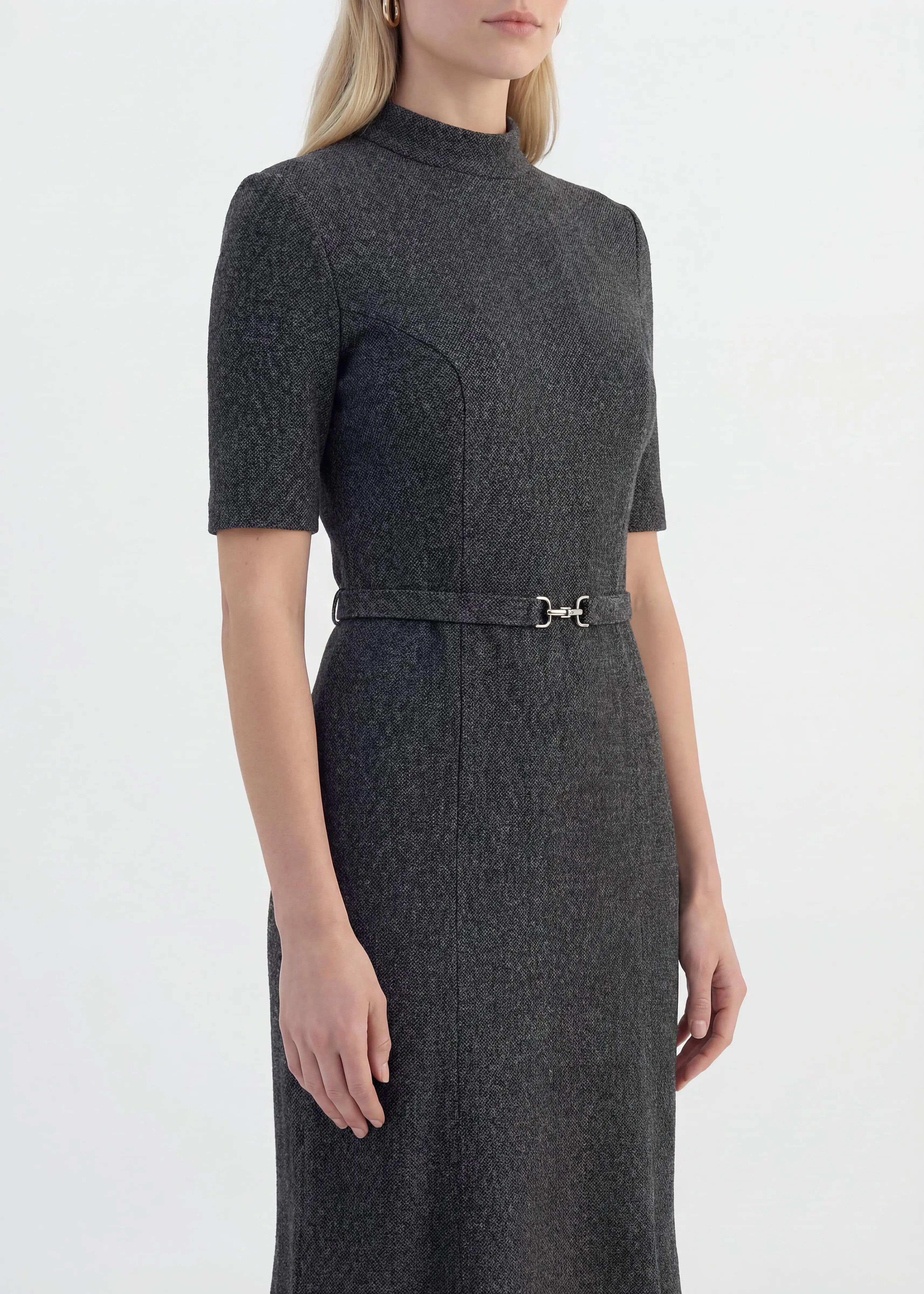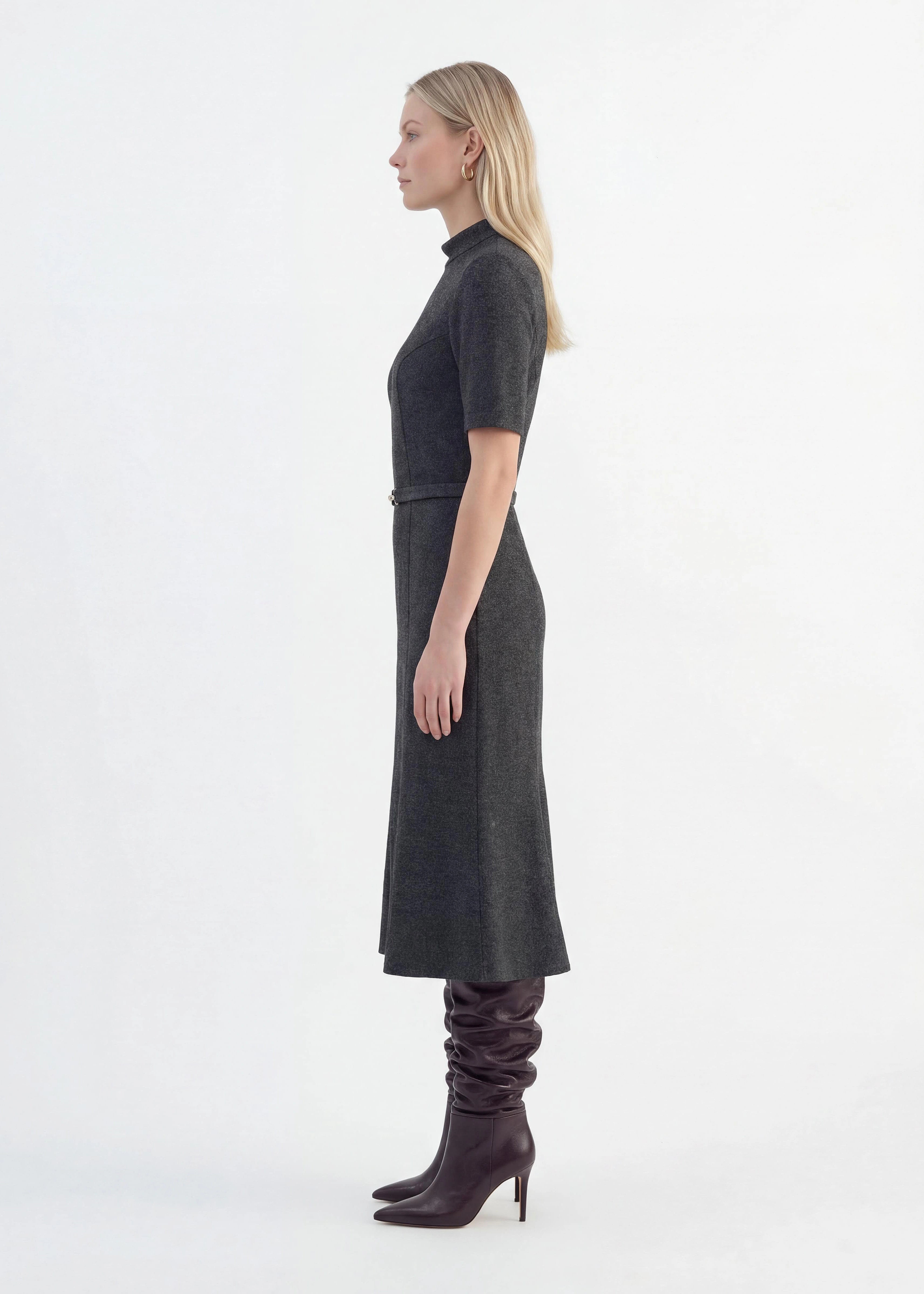 The dress is featuring a mock neck and contoured princess seams that map the torso with surgical precision. The elbow-length sleeves offer a sensible counterpoint to the flared mermaid hem.