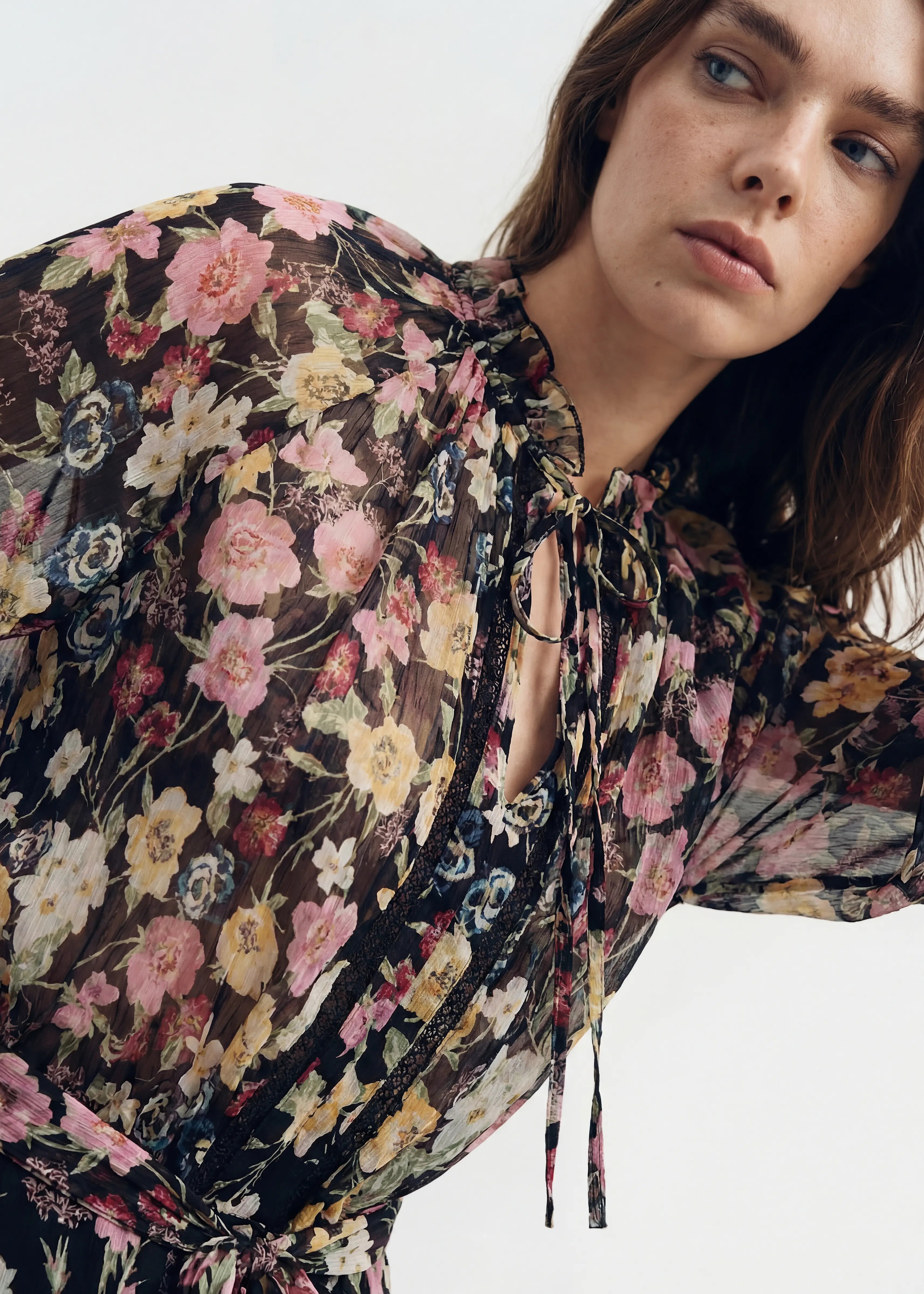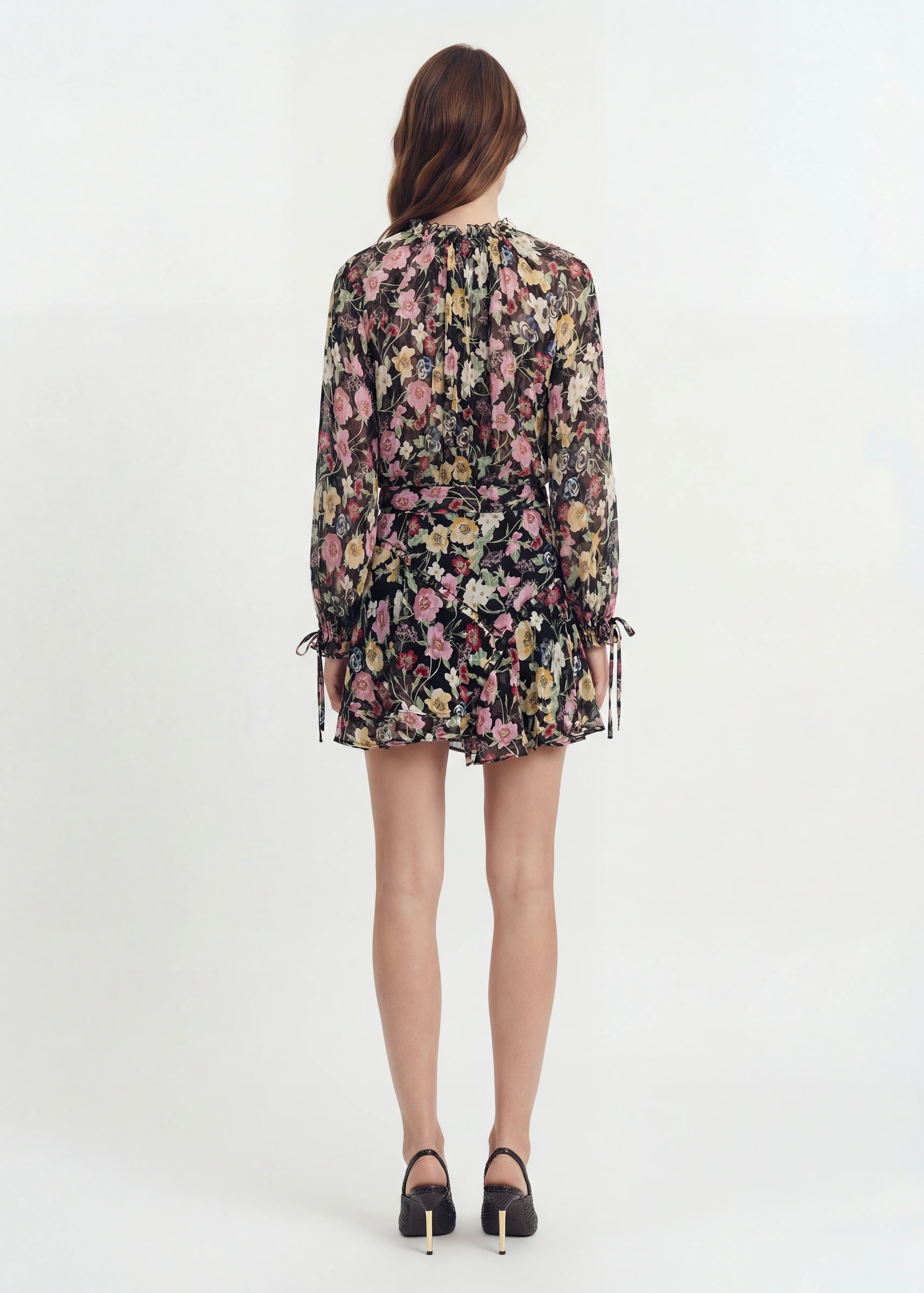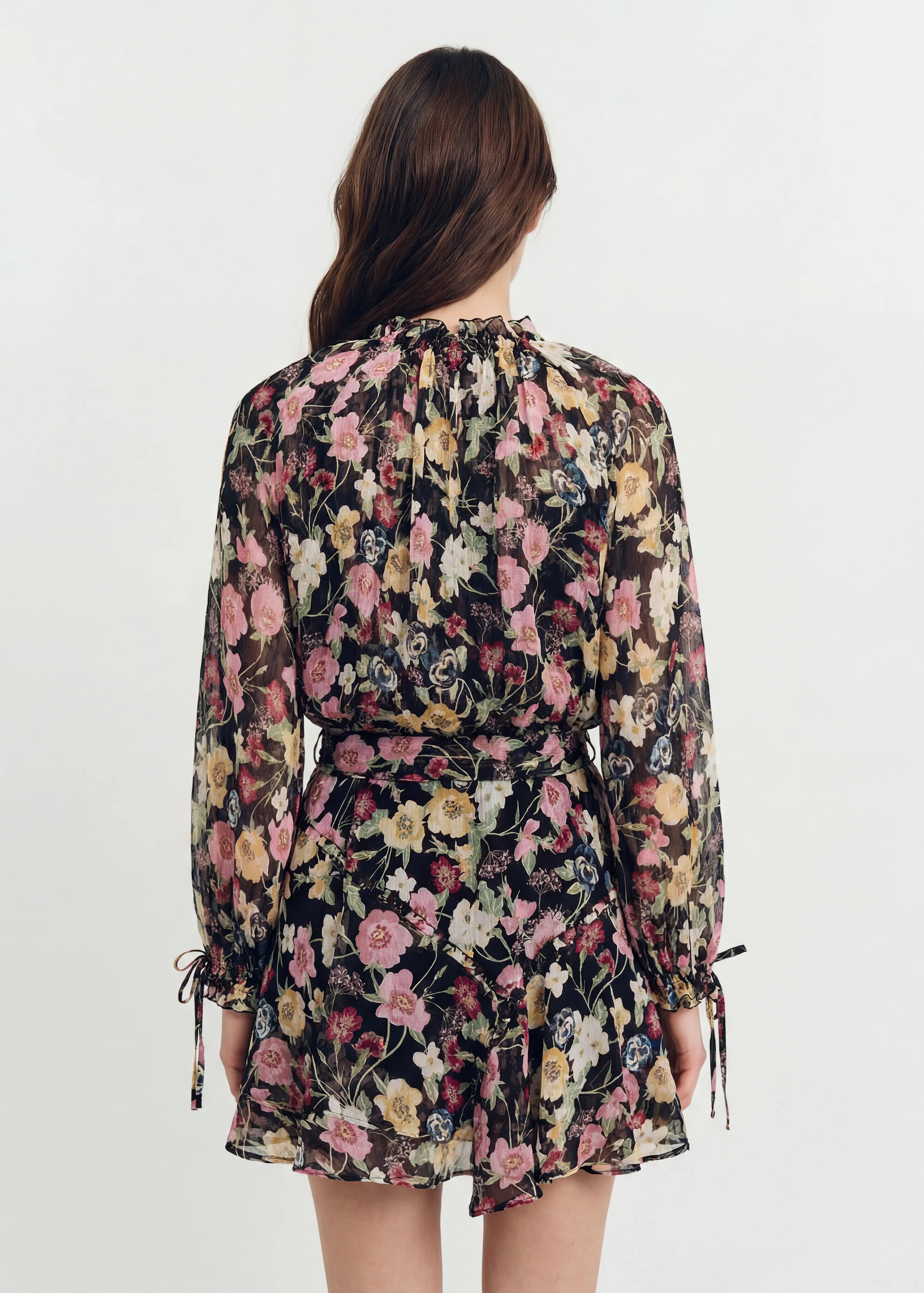 A romantic sheer mini dress in a soft floral print, designed with a ruffled high neckline and subtle front slit. Features long blouson sleeves with tie cuffs, a self-tie waist for a flattering fit, and a lightweight, flowy silhouette perfect for day-to-night styling.