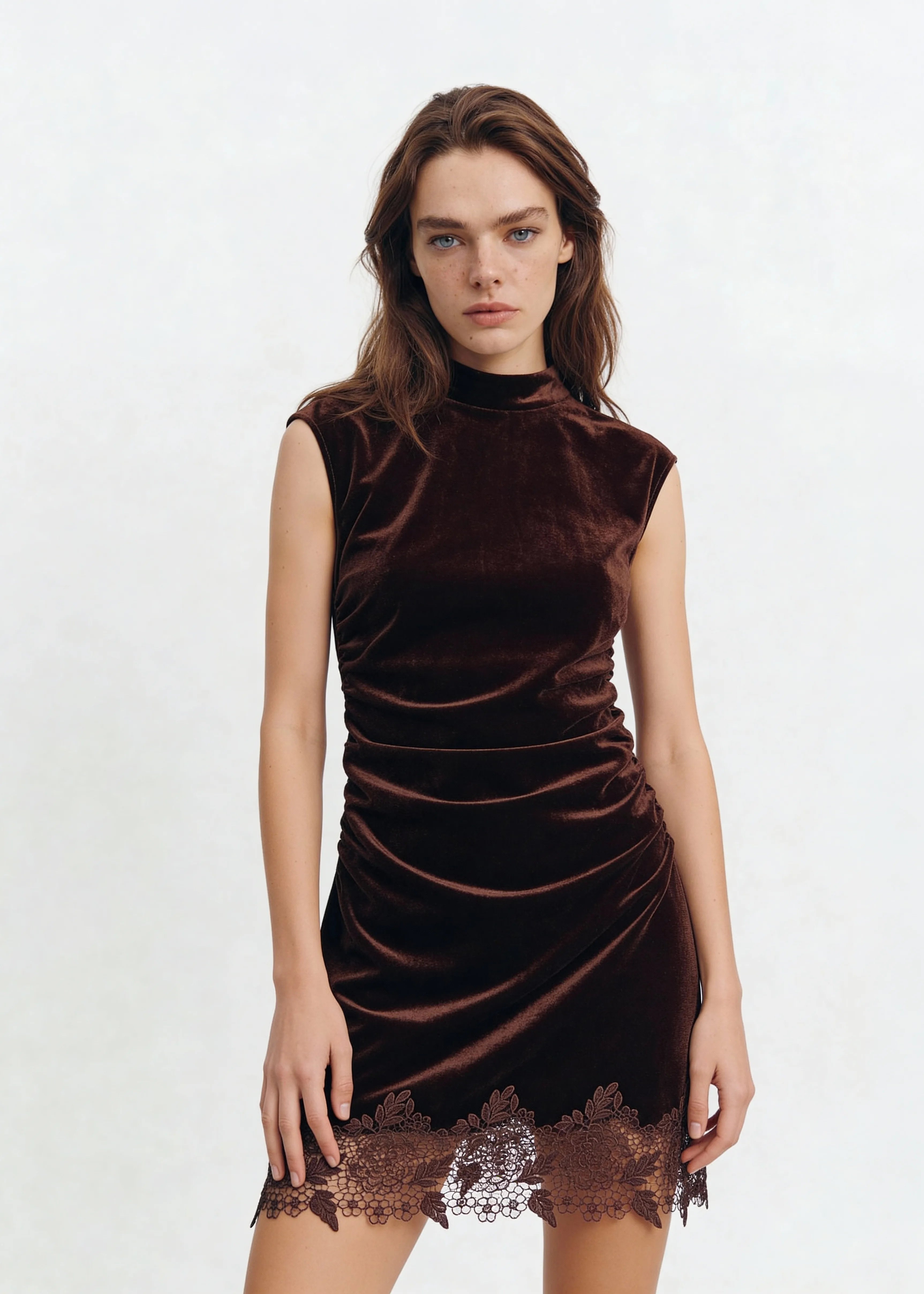 A sleek velvet mini dress designed with a high neckline and sleeveless silhouette. Soft ruching flatters the body, while a delicate lace-trim hem adds a romantic finish. Finished with a concealed back zipper.