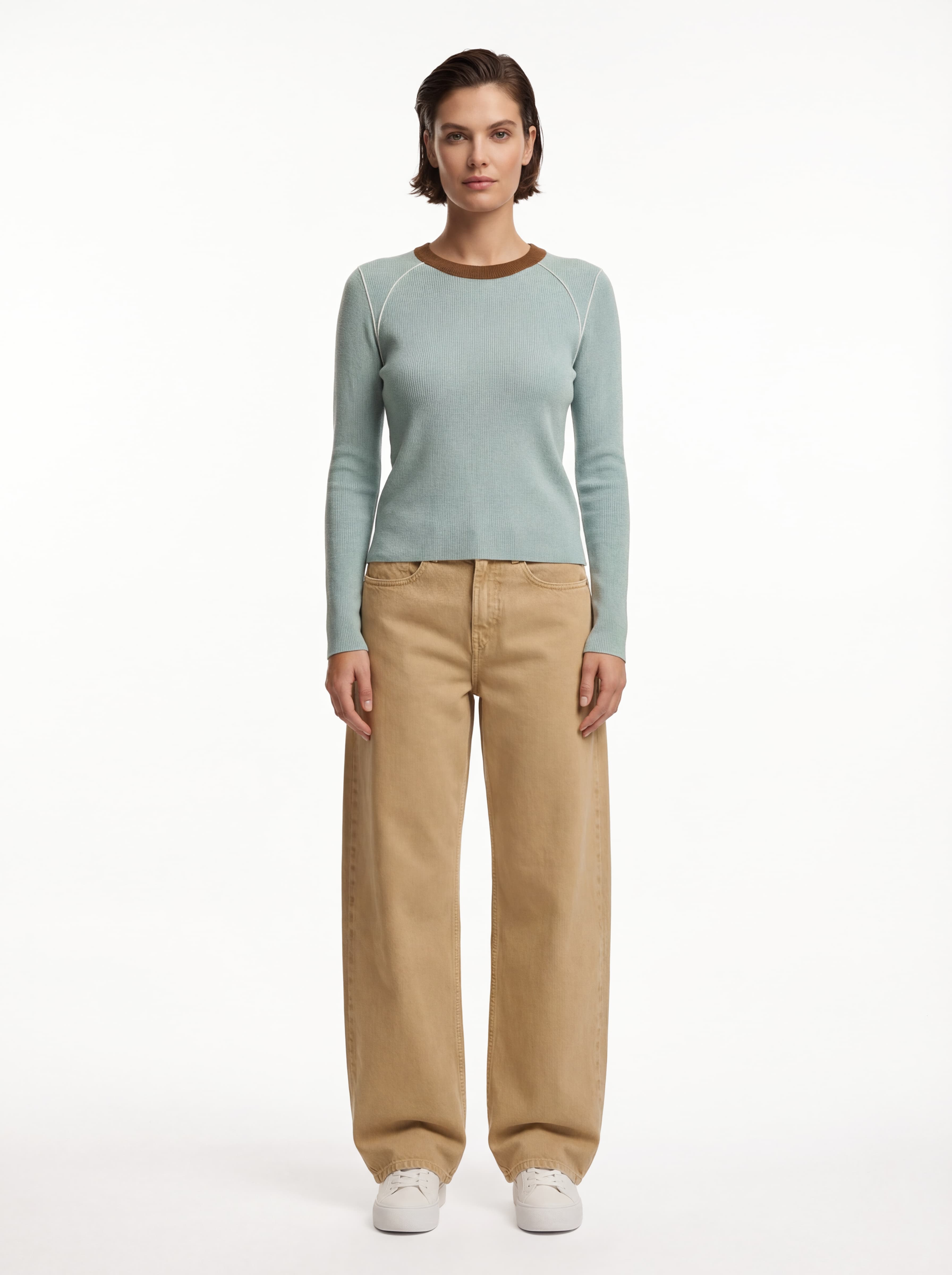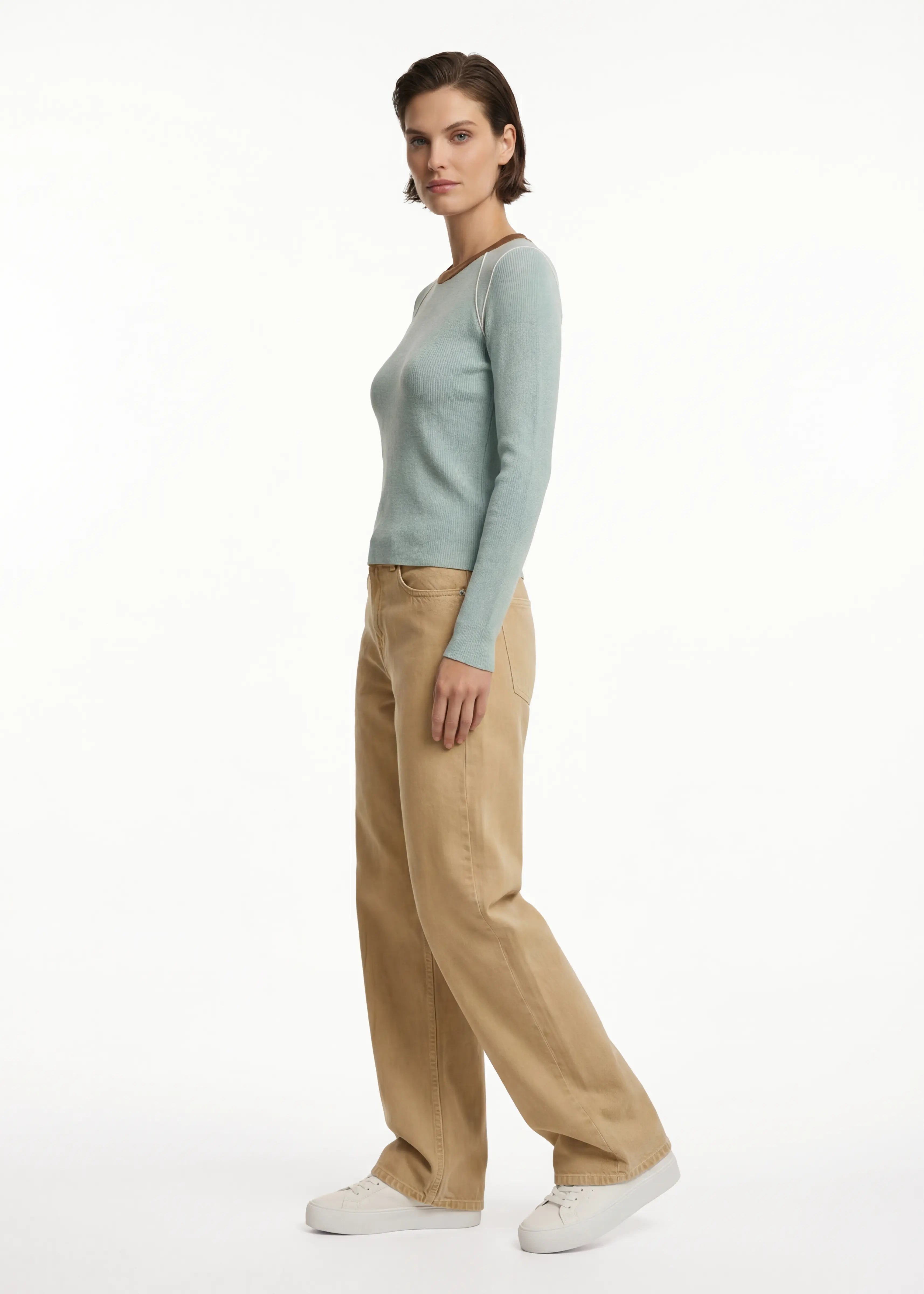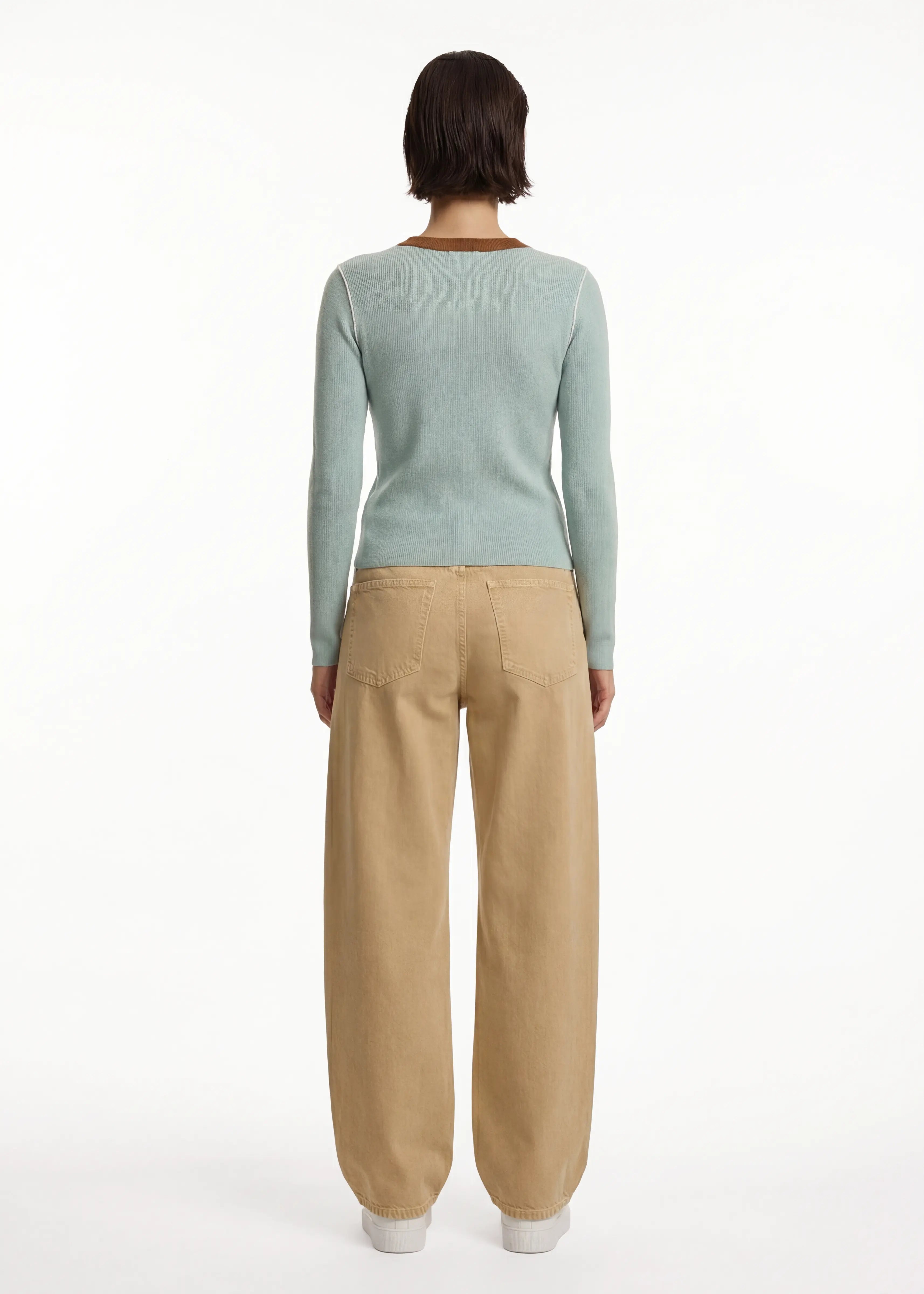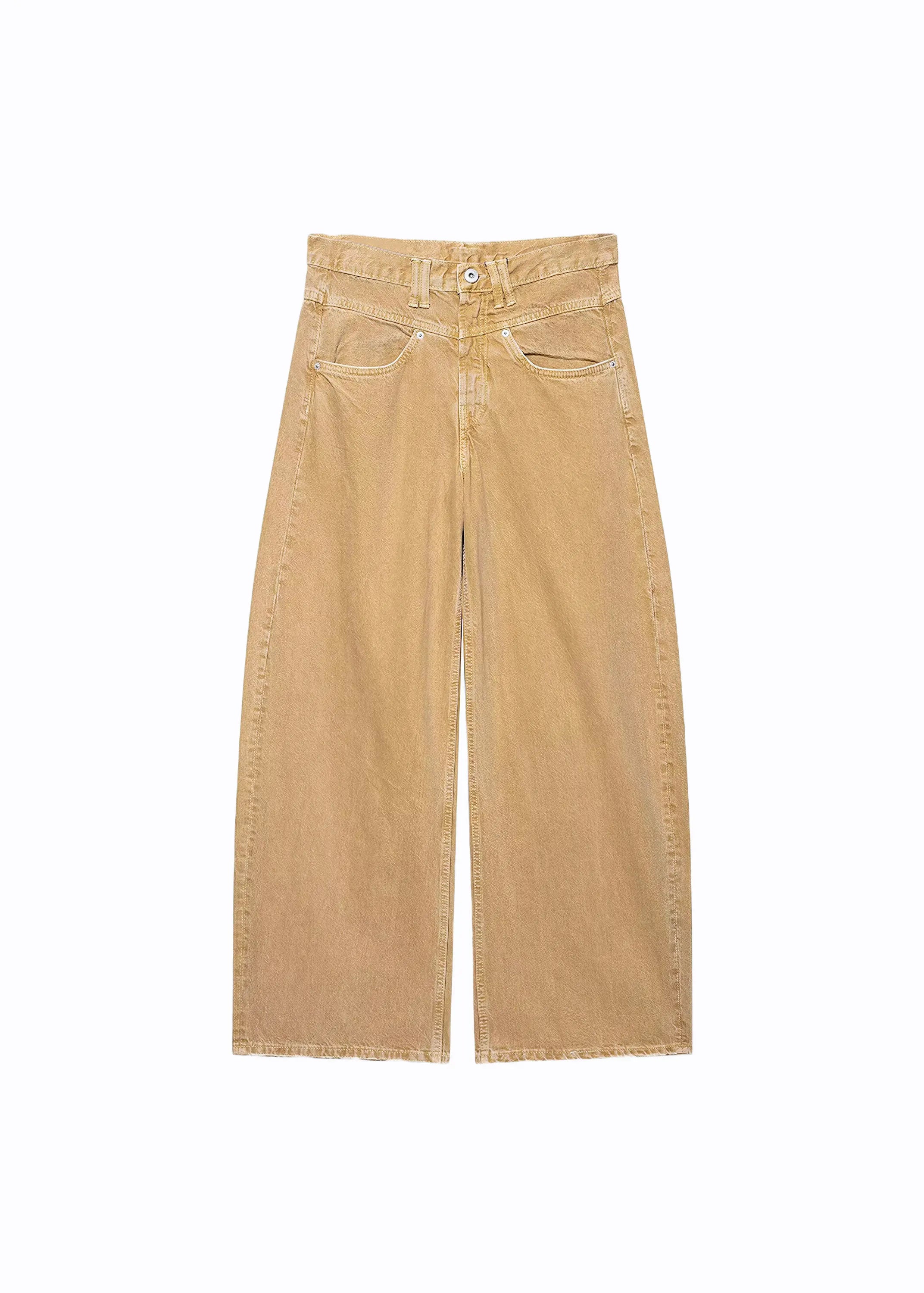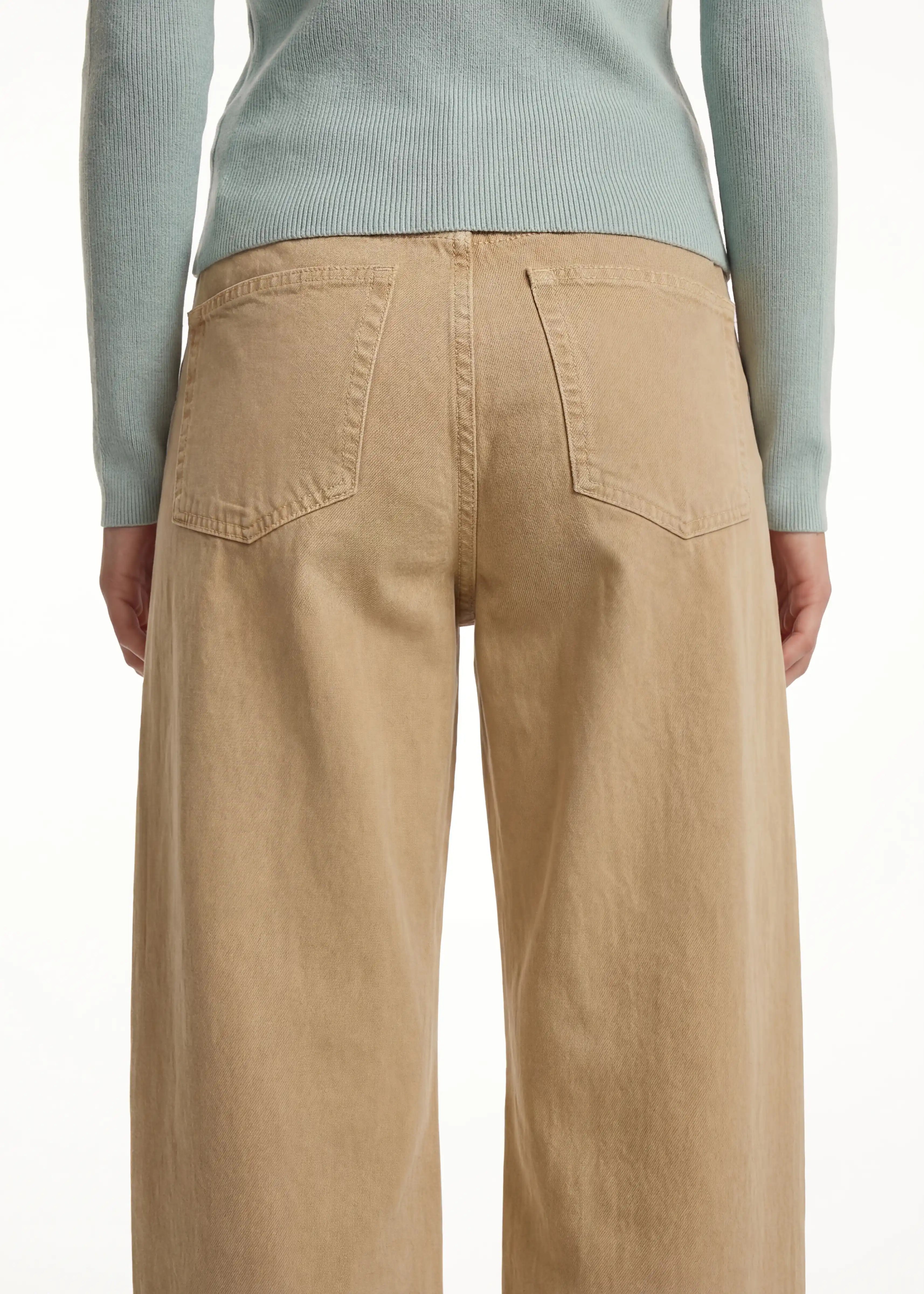 A proper barrel-leg jeans in distinct hue. The shade is reminiscent of a well-dunked biscuit. Generously cut to avoid the tyranny of the skinny jean, yet structurally sound thanks to a clever, architectural front yoke. Slouchy, substantial, and reassuringly wide.