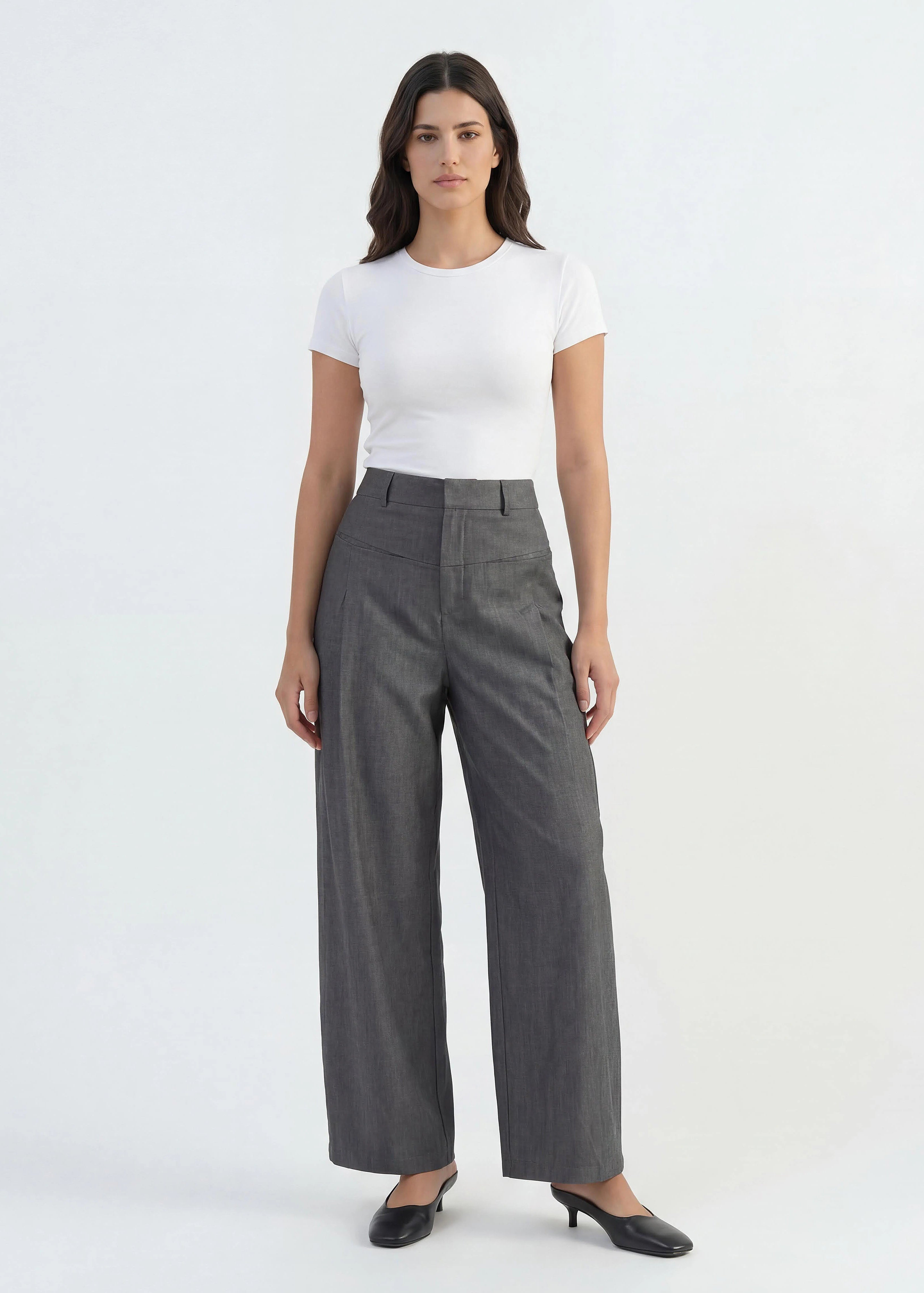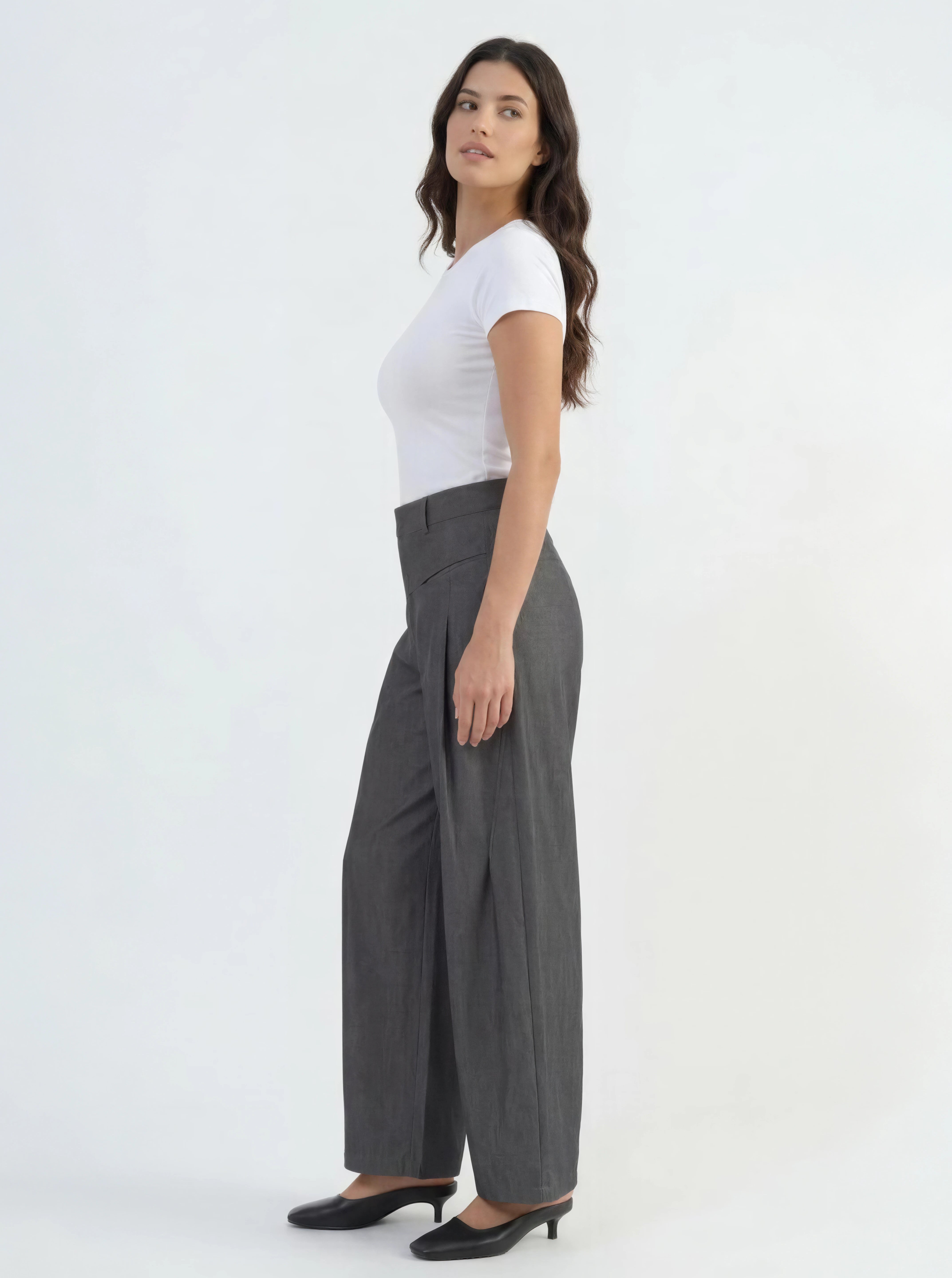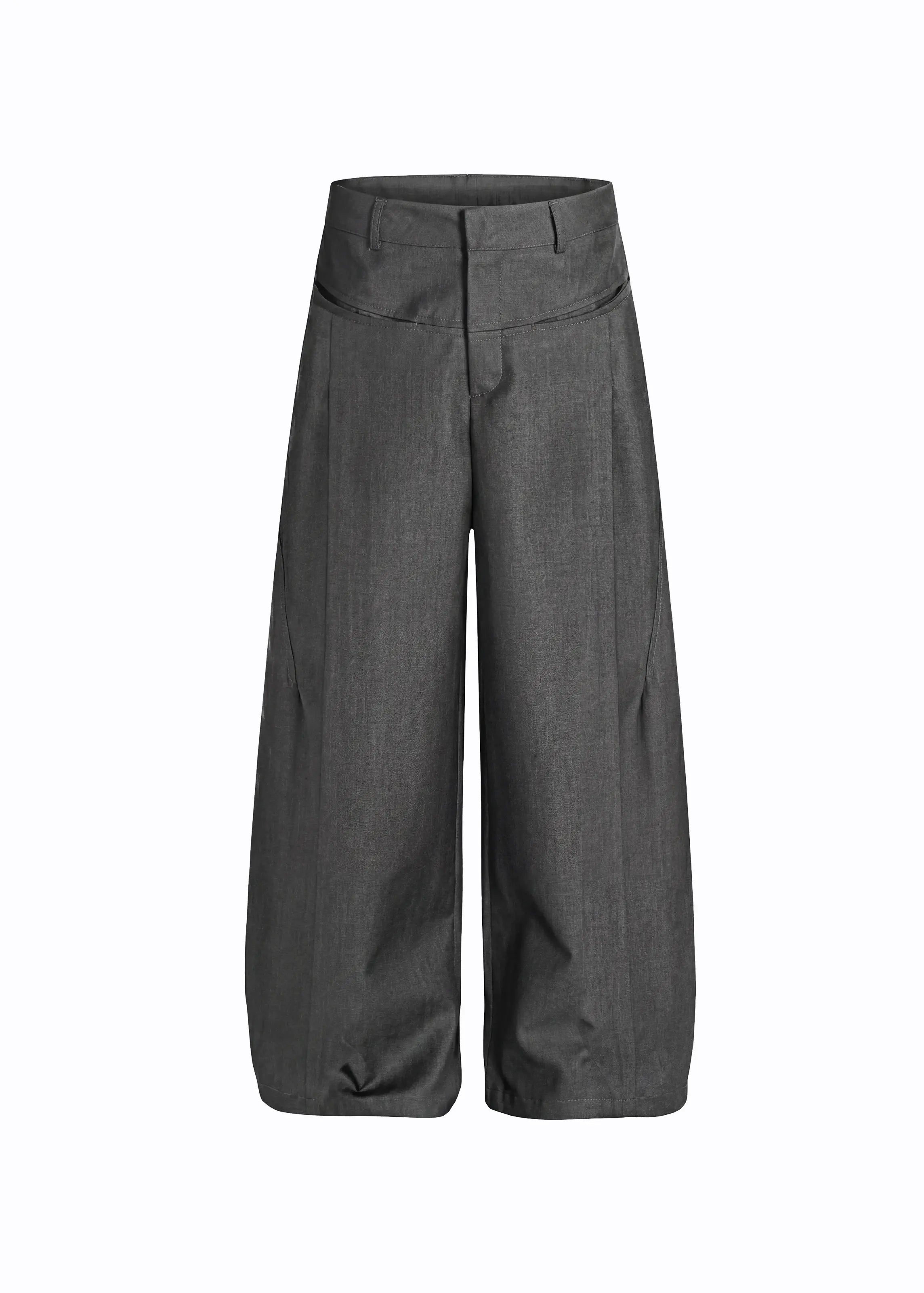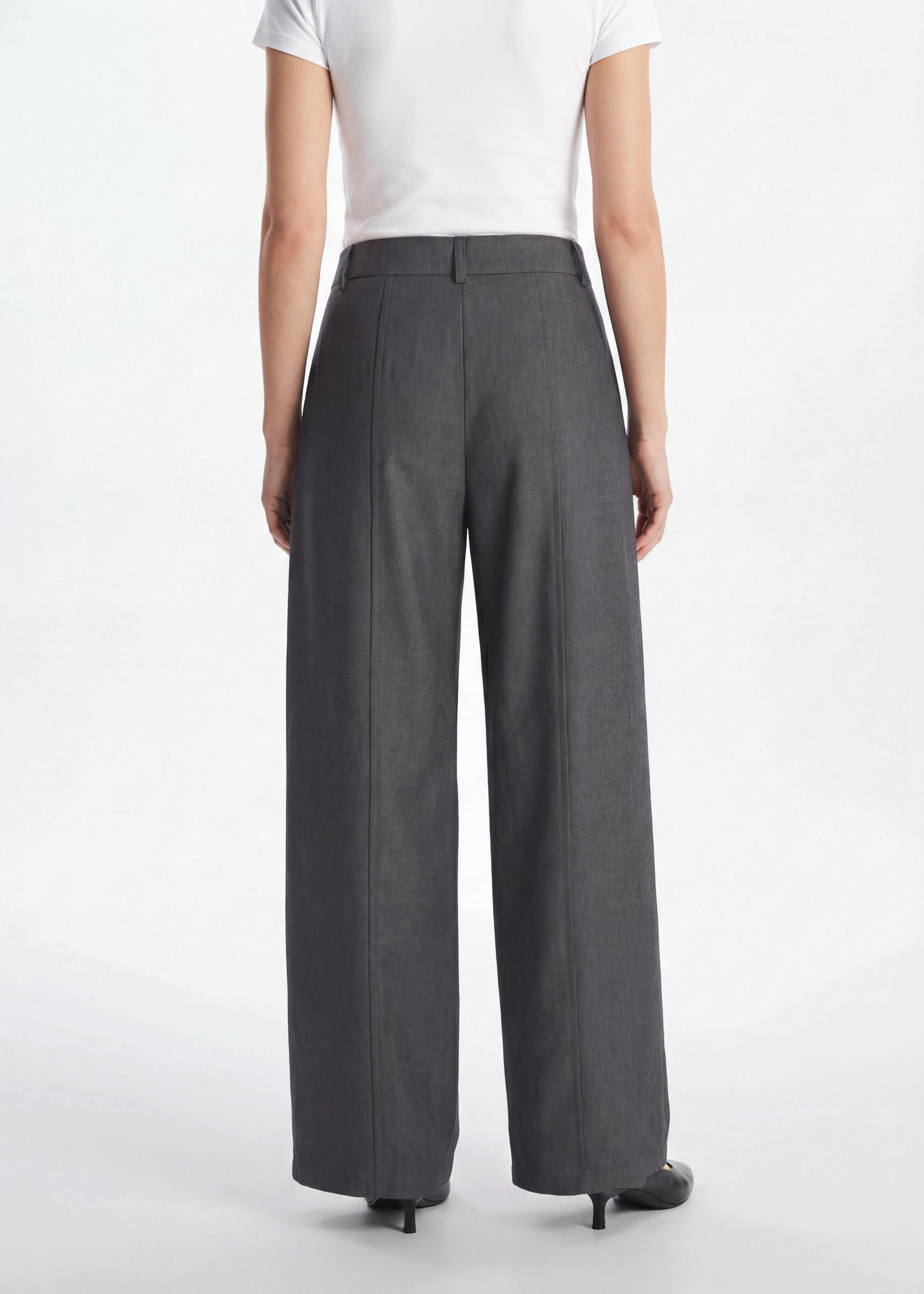 Anchored by a sharp V-yoke instead of pleats, these pants contour the waist before sweeping into a wide column.