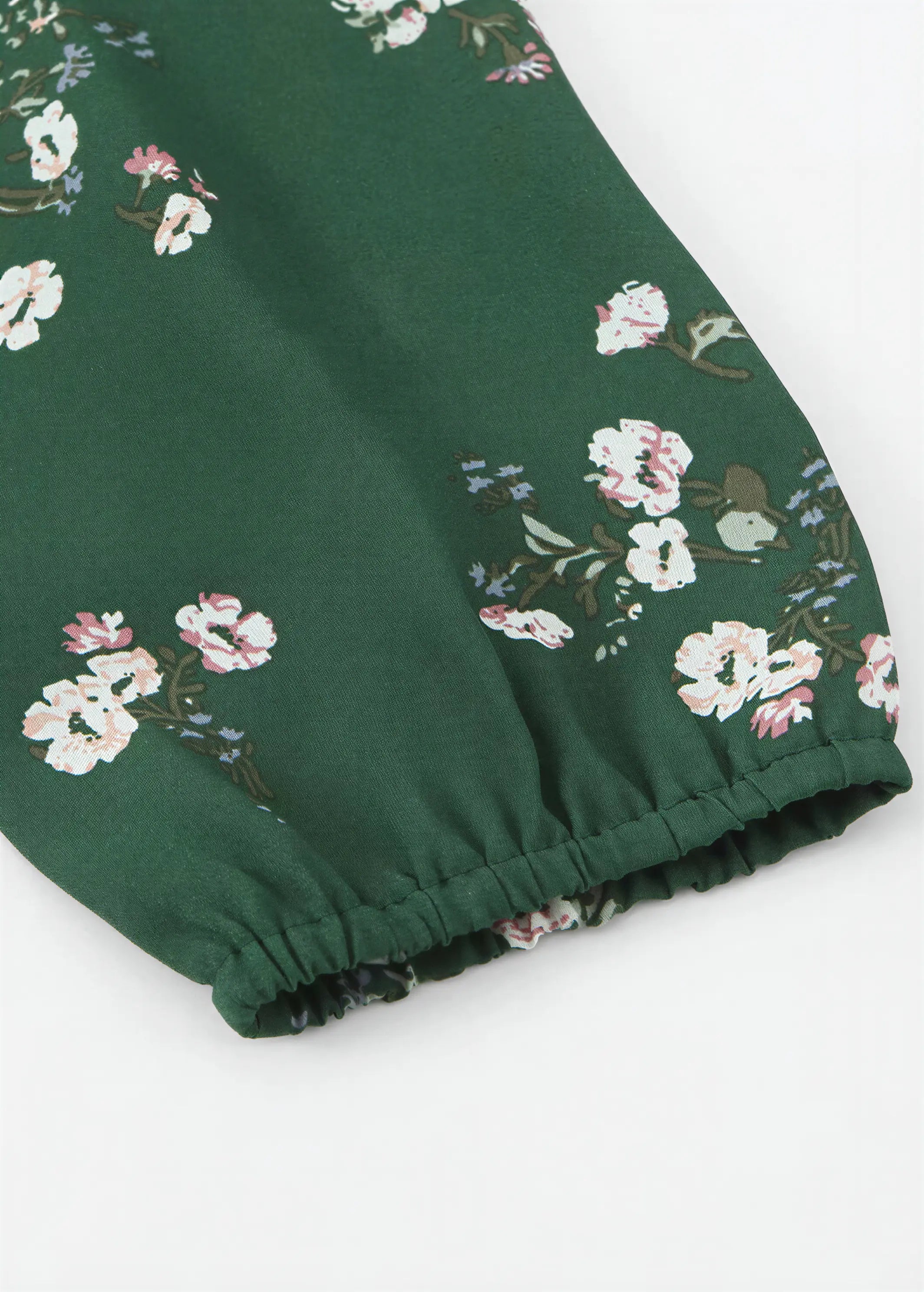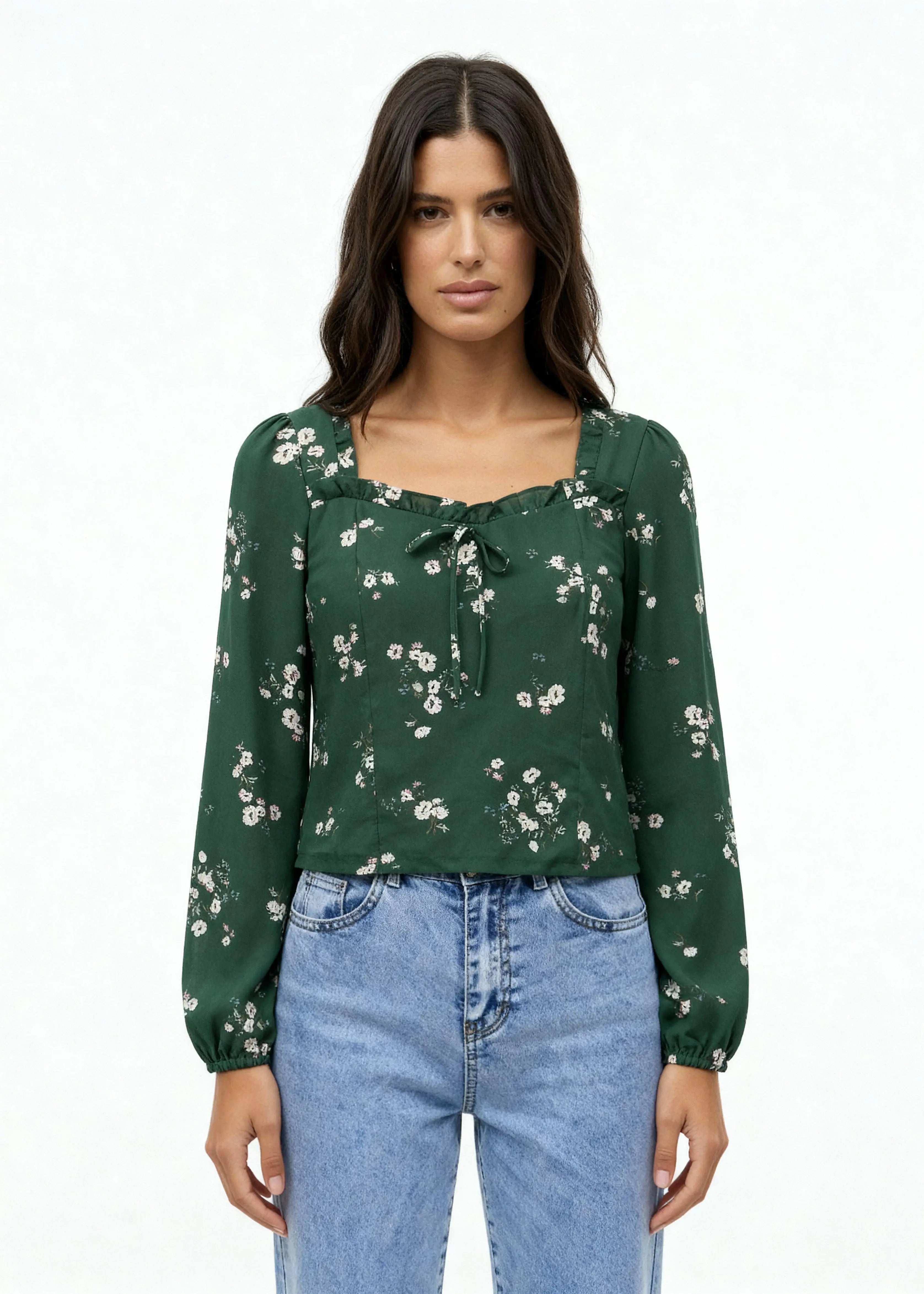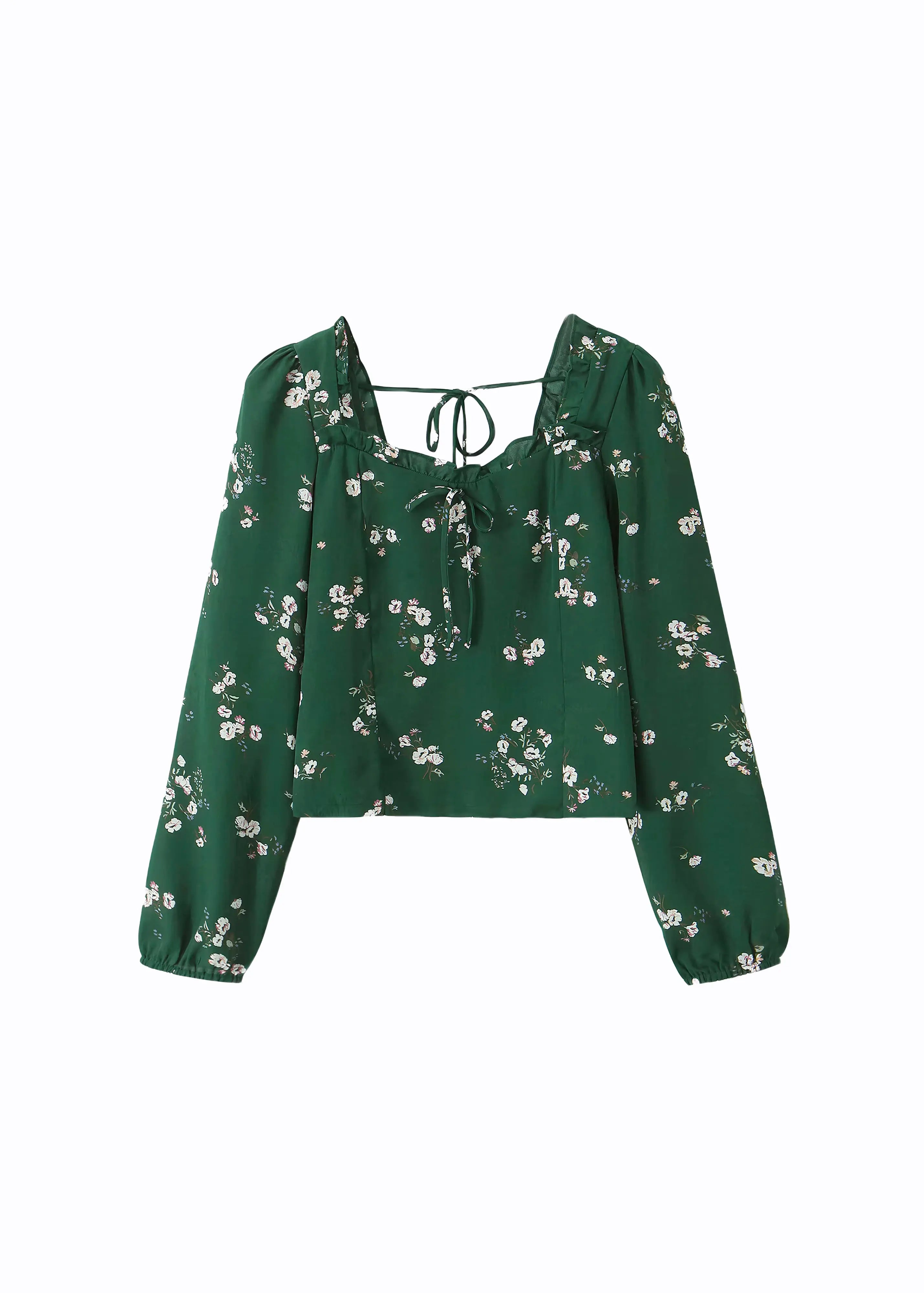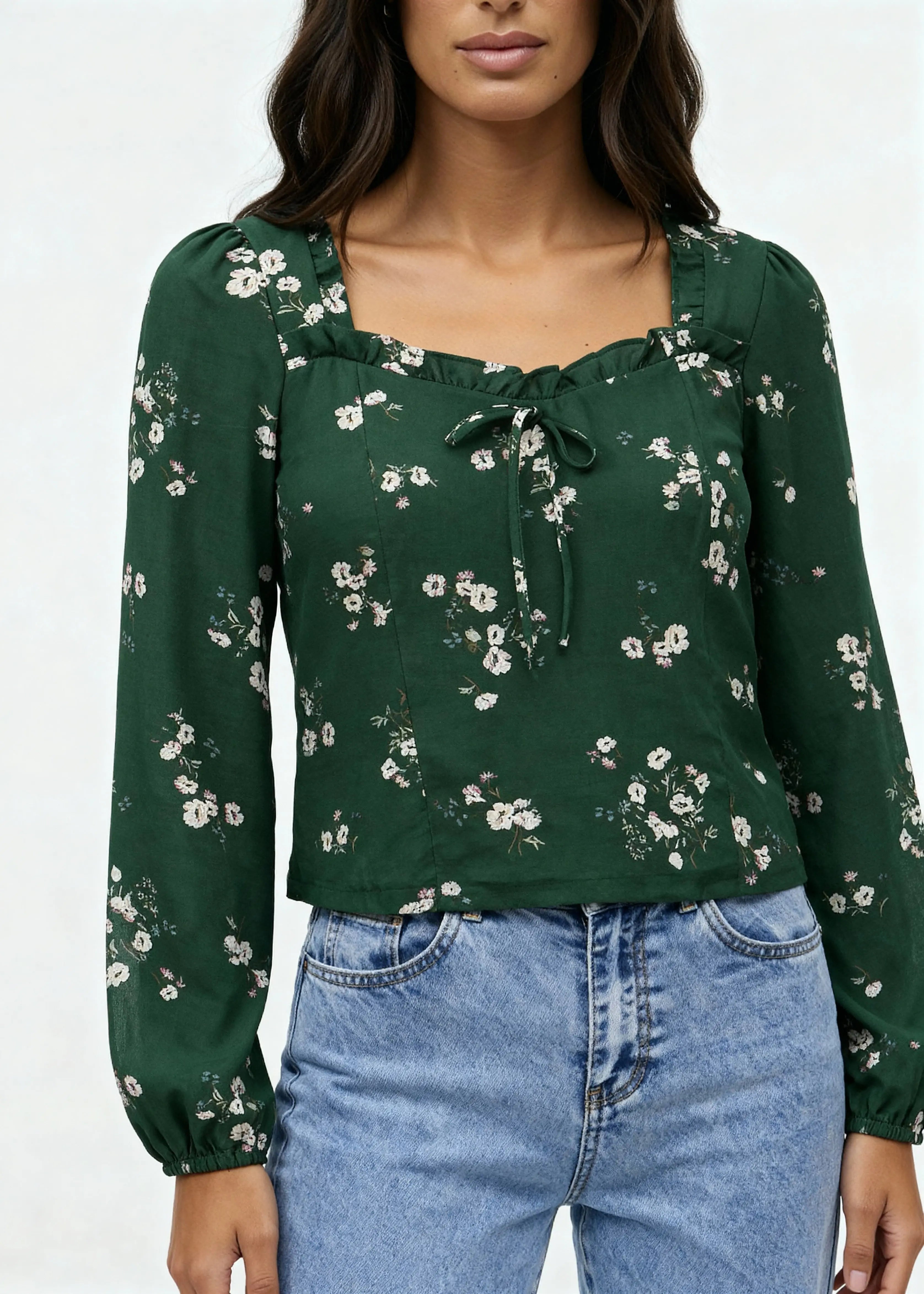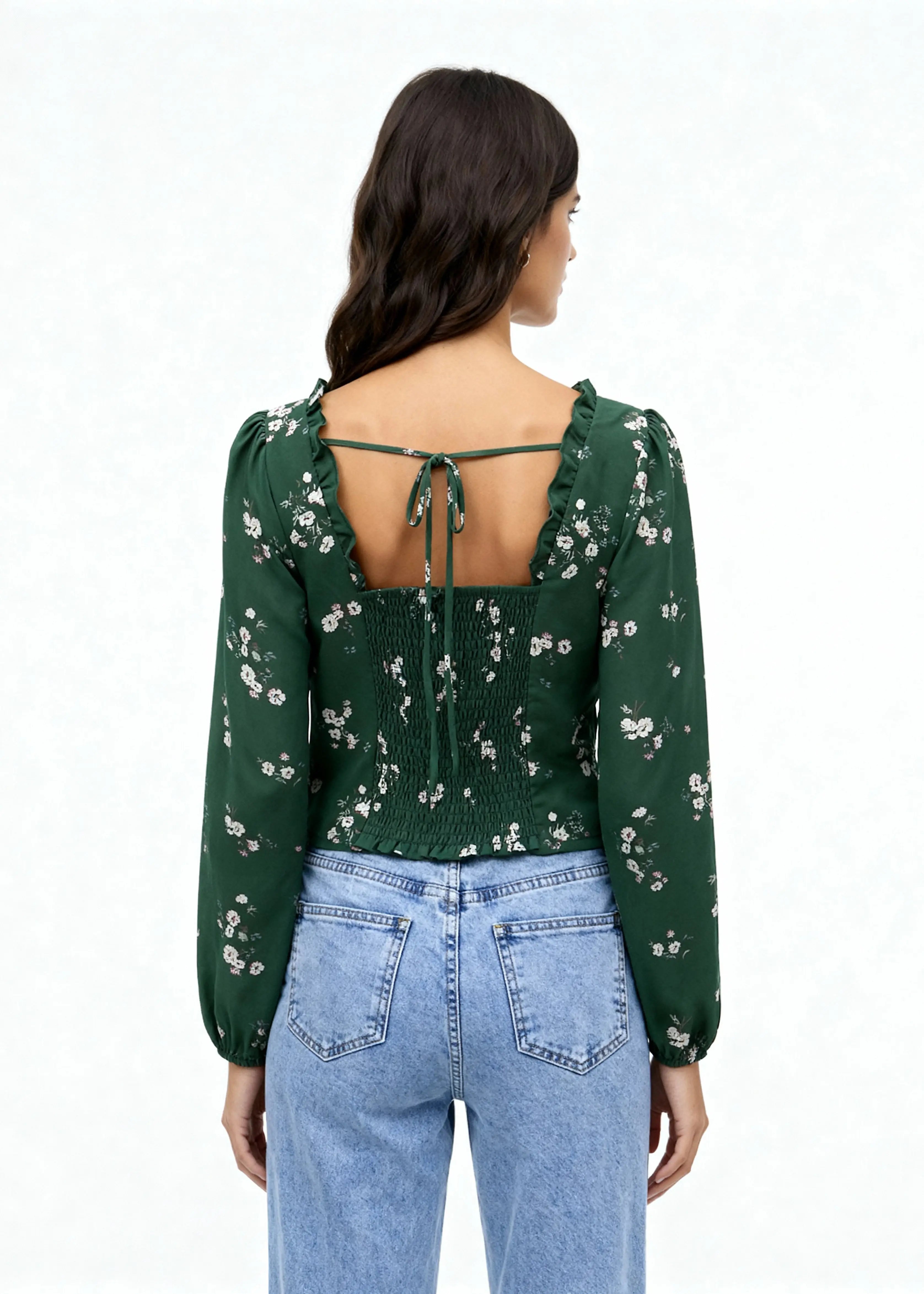 A charming floral blouse that practically demands a garden party. The square neckline frames the collarbones with a polite frill, while the clever smocked back ensures a forgiving fit without sacrificing the silhouette. Finished with romantic sleeves and delicate ties that keep things secure.