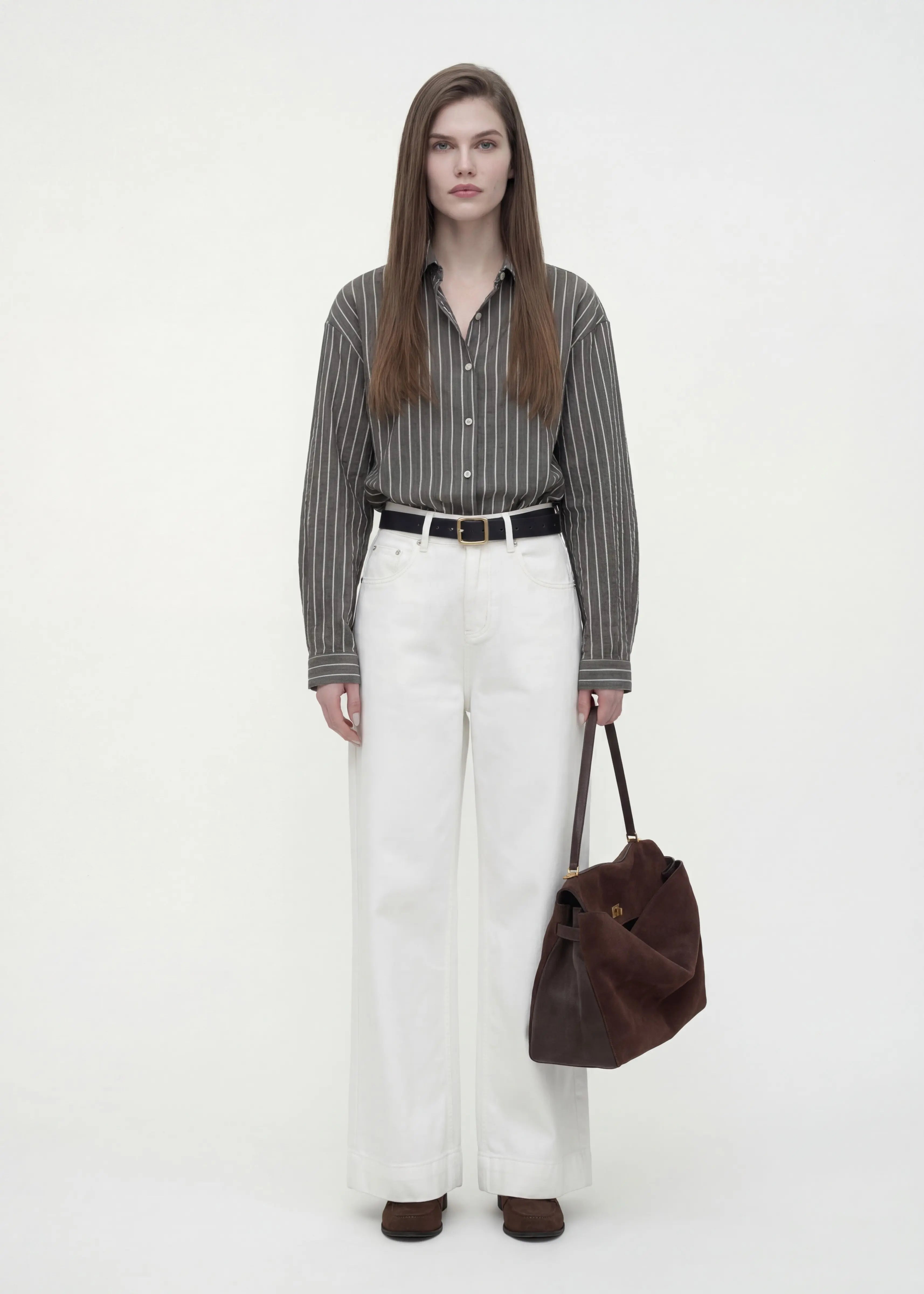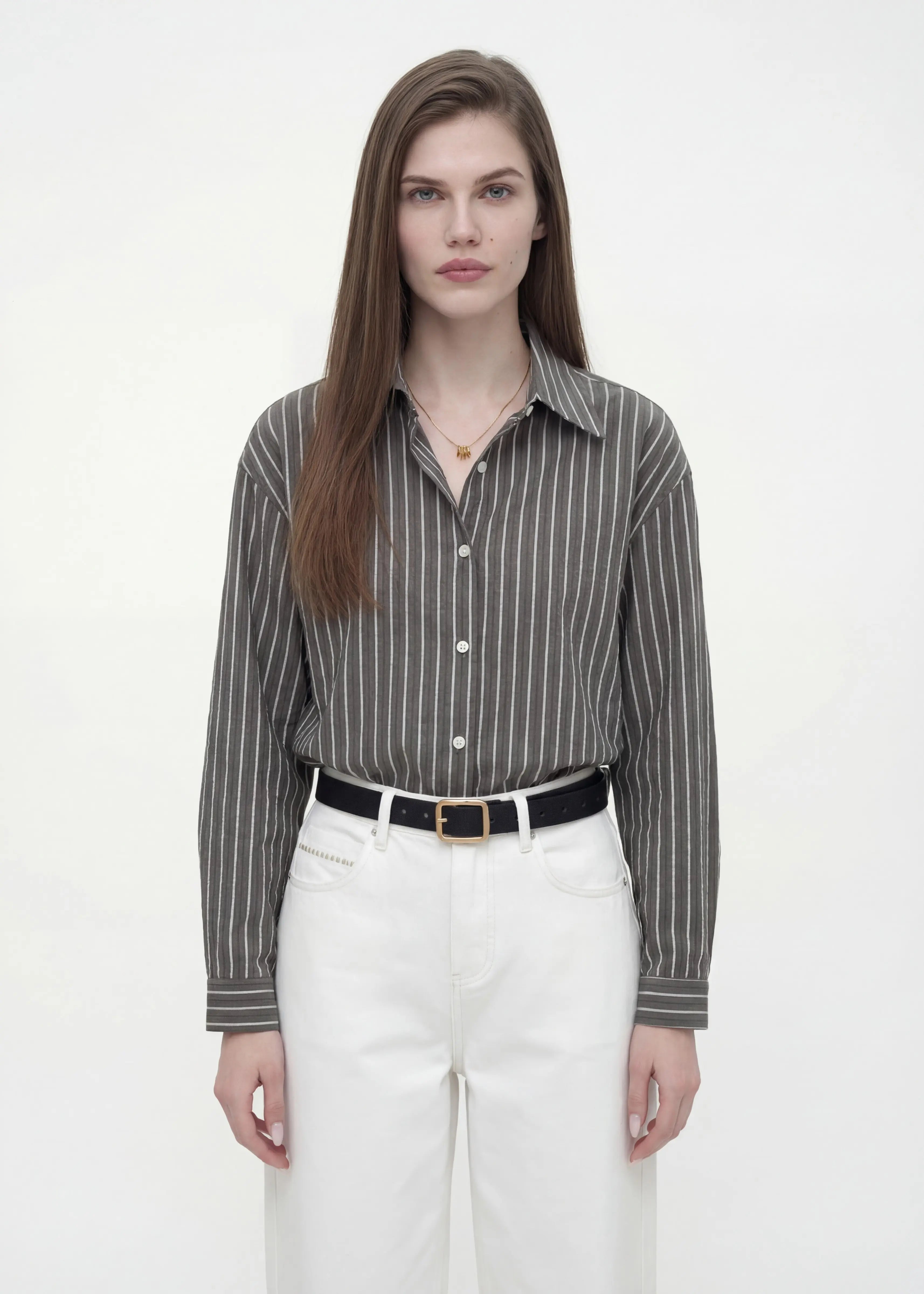 A relaxed button-down shirt in soft striped fabric. Features a point collar, curved hem, and unique back yoke.