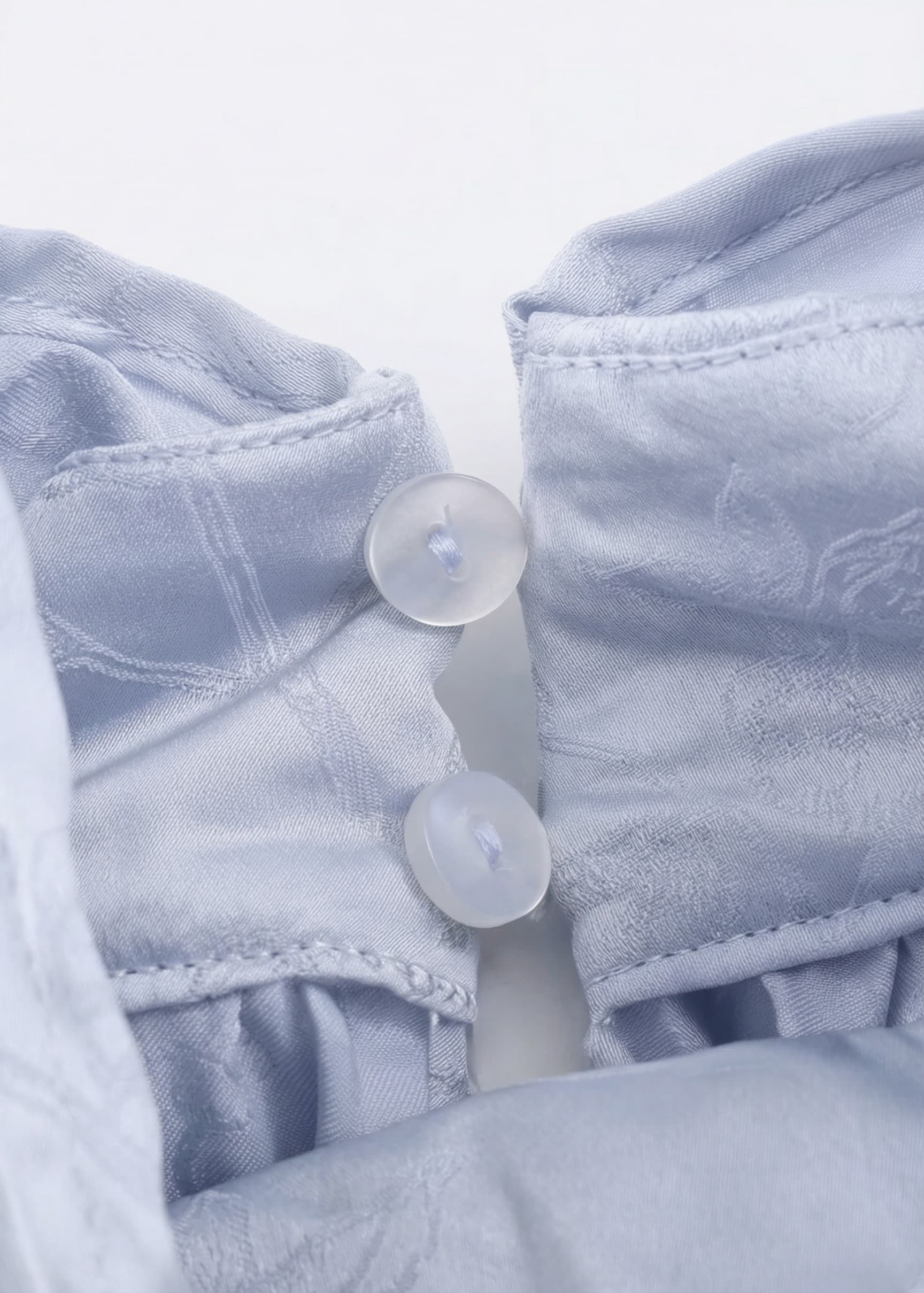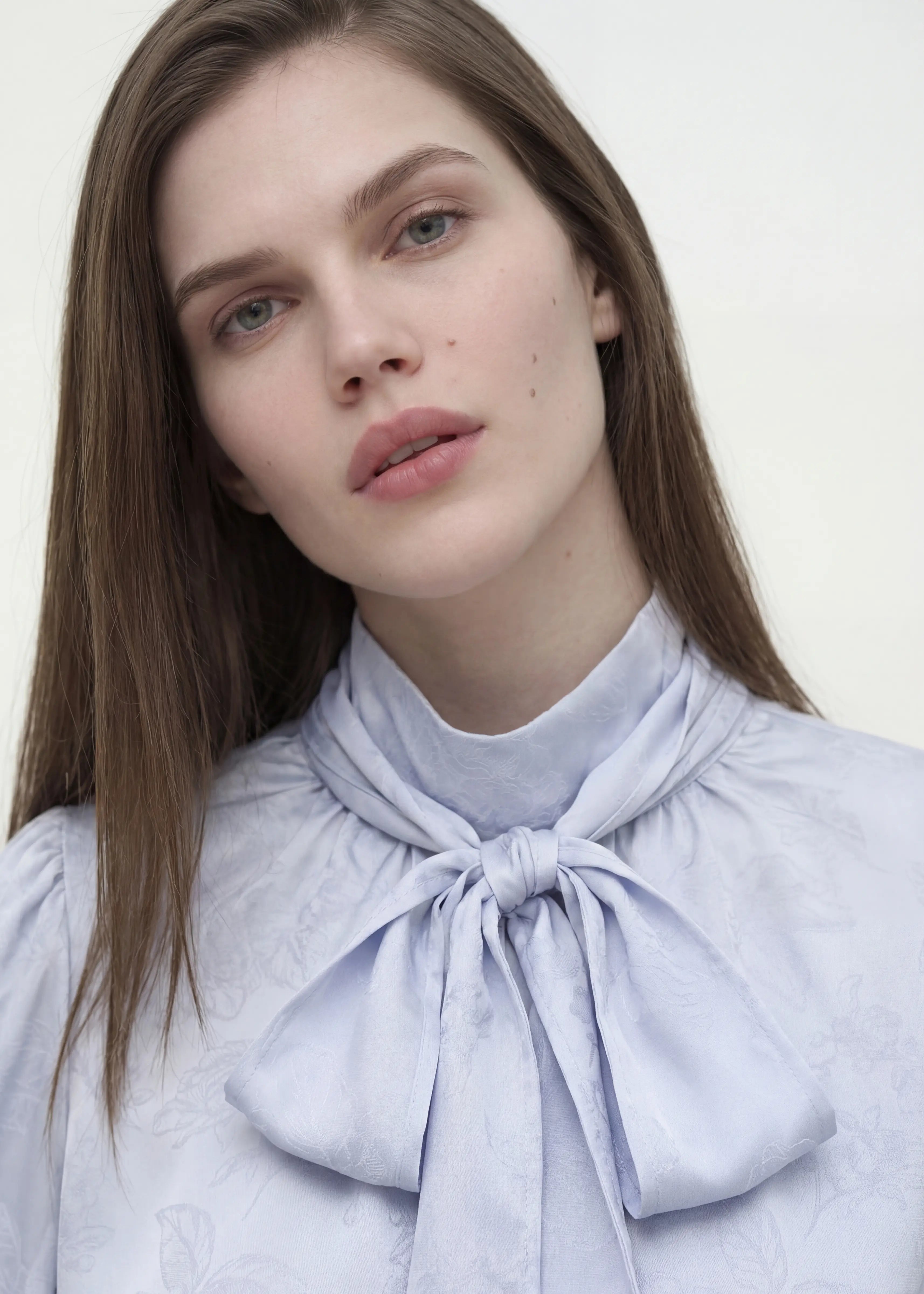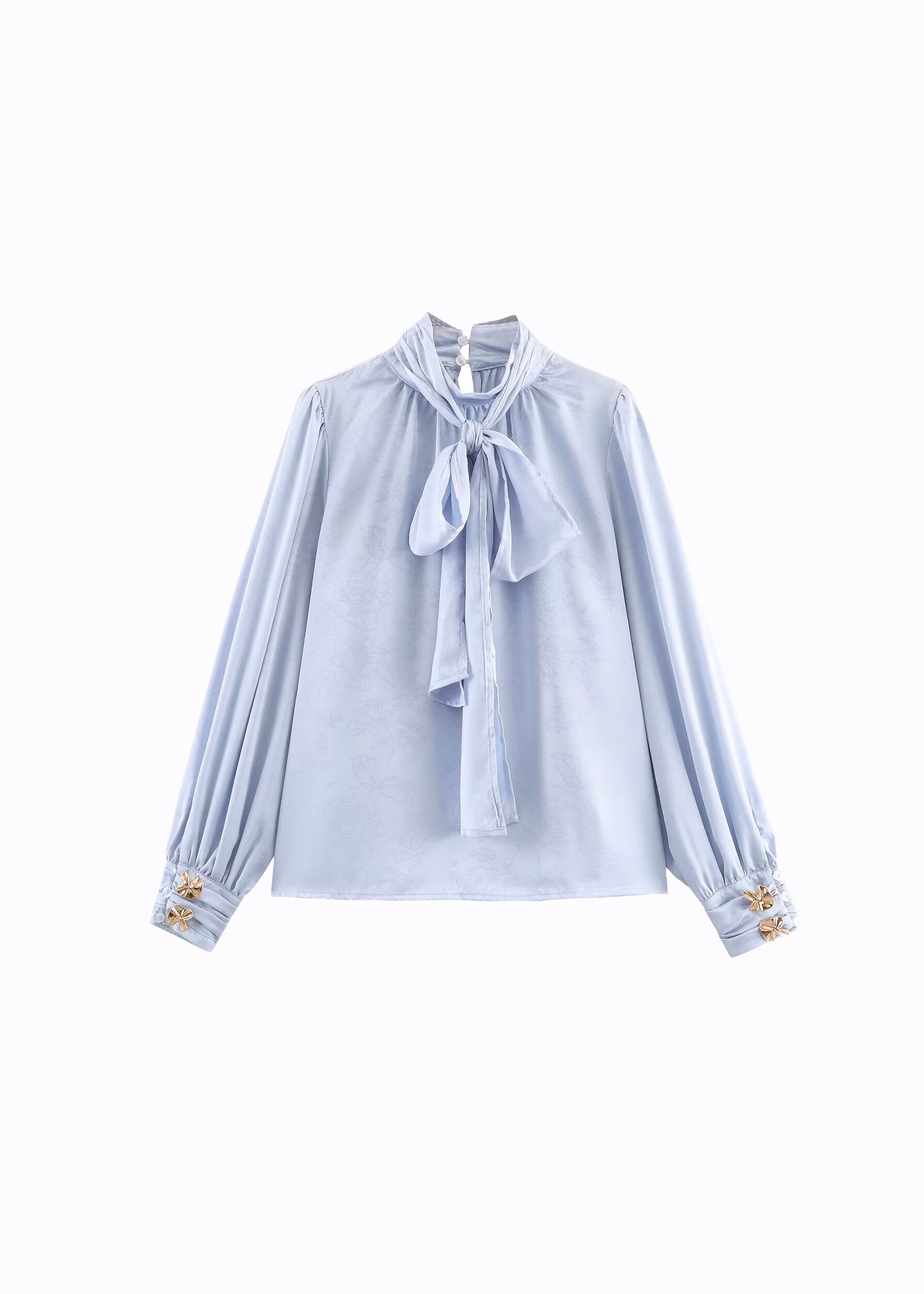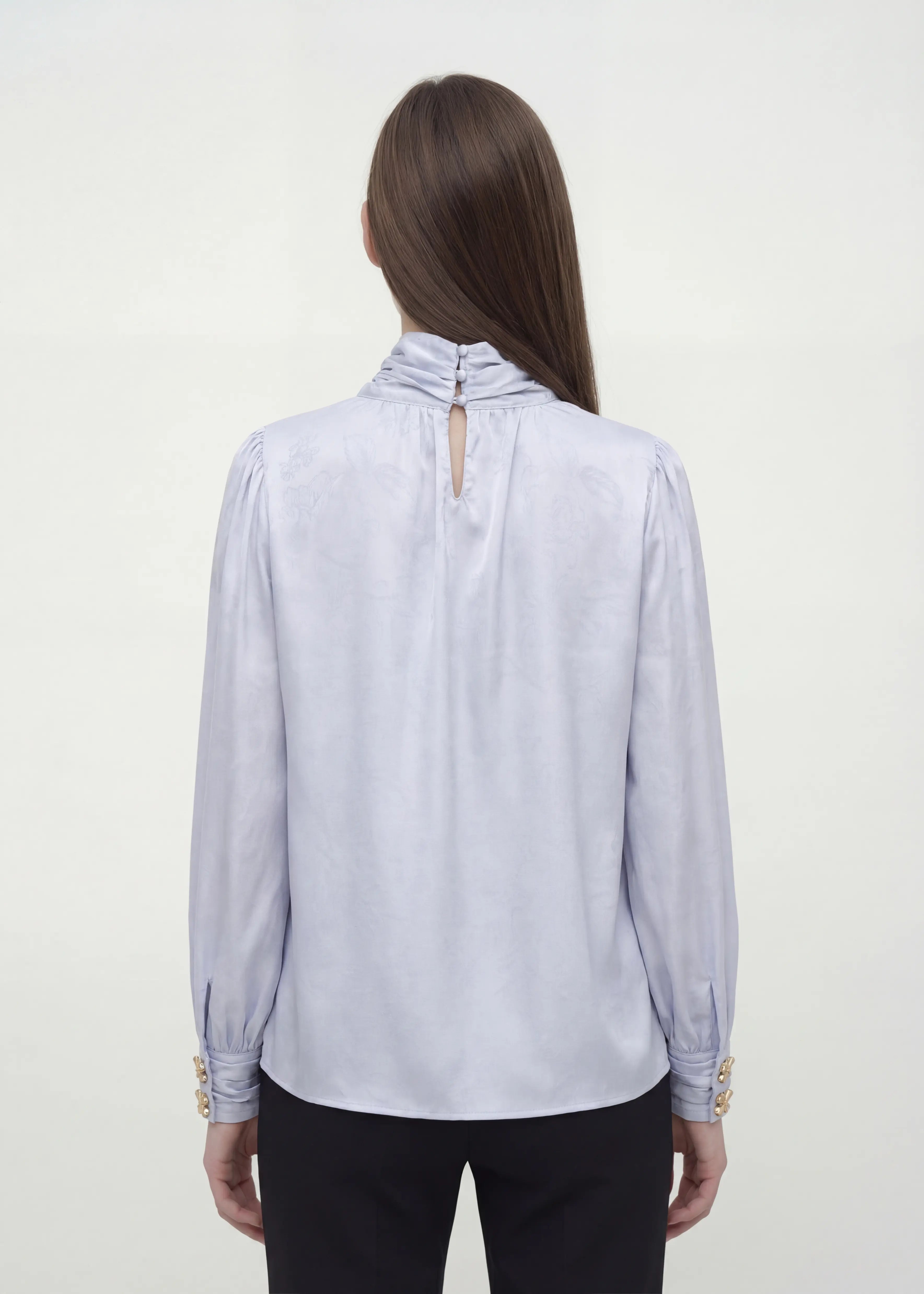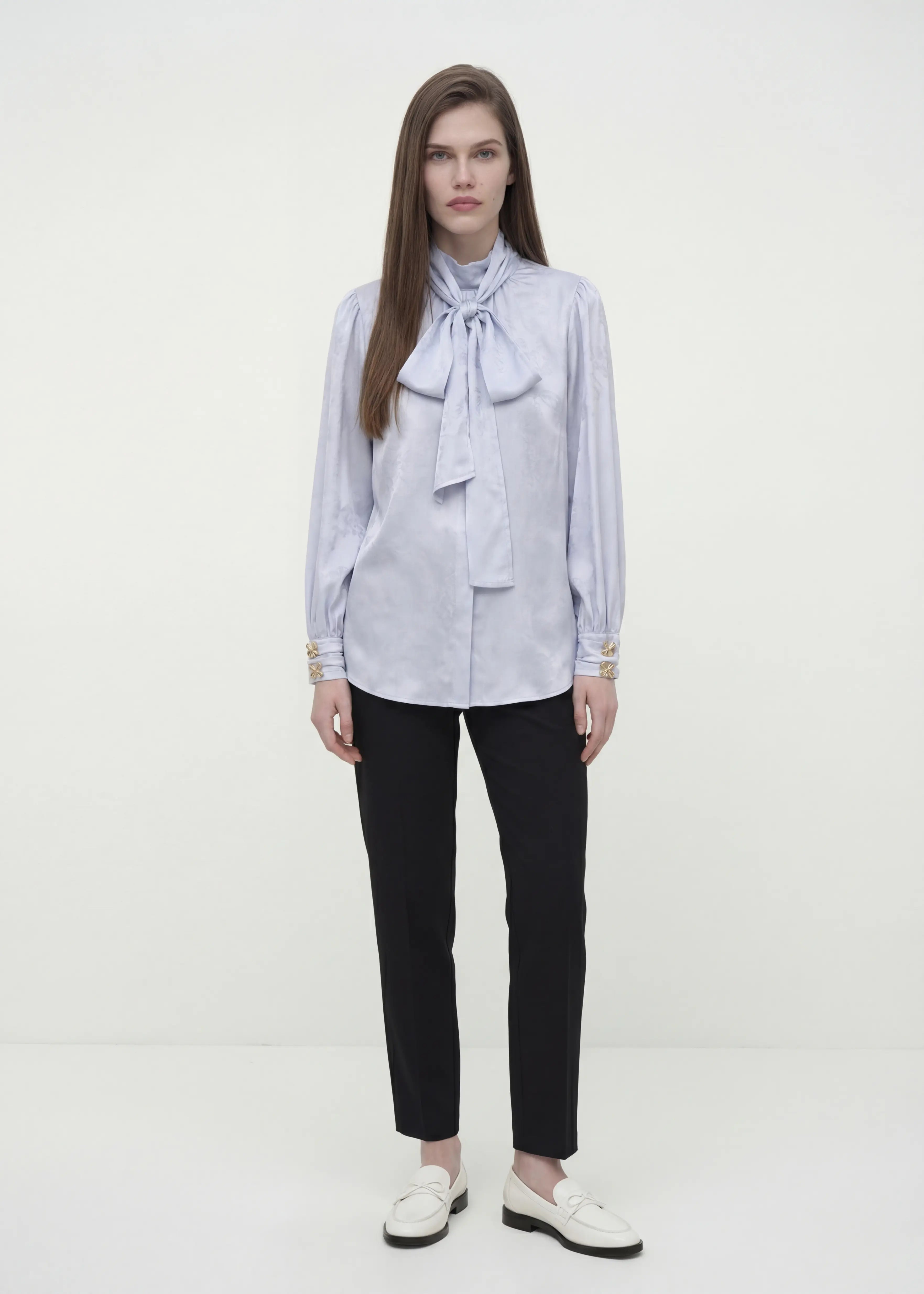 This blouse is made in a tonal floral jacquard that catches the light with a ghostly, satin-like shimmer, it balances a high, prim neckline with a theatrical lavallière tie that demands to be knotted with intention. The silhouette is dominated by bishop sleeves which taper dramatically into elongated, ruched cuffs adorned with gold-tone buttons.