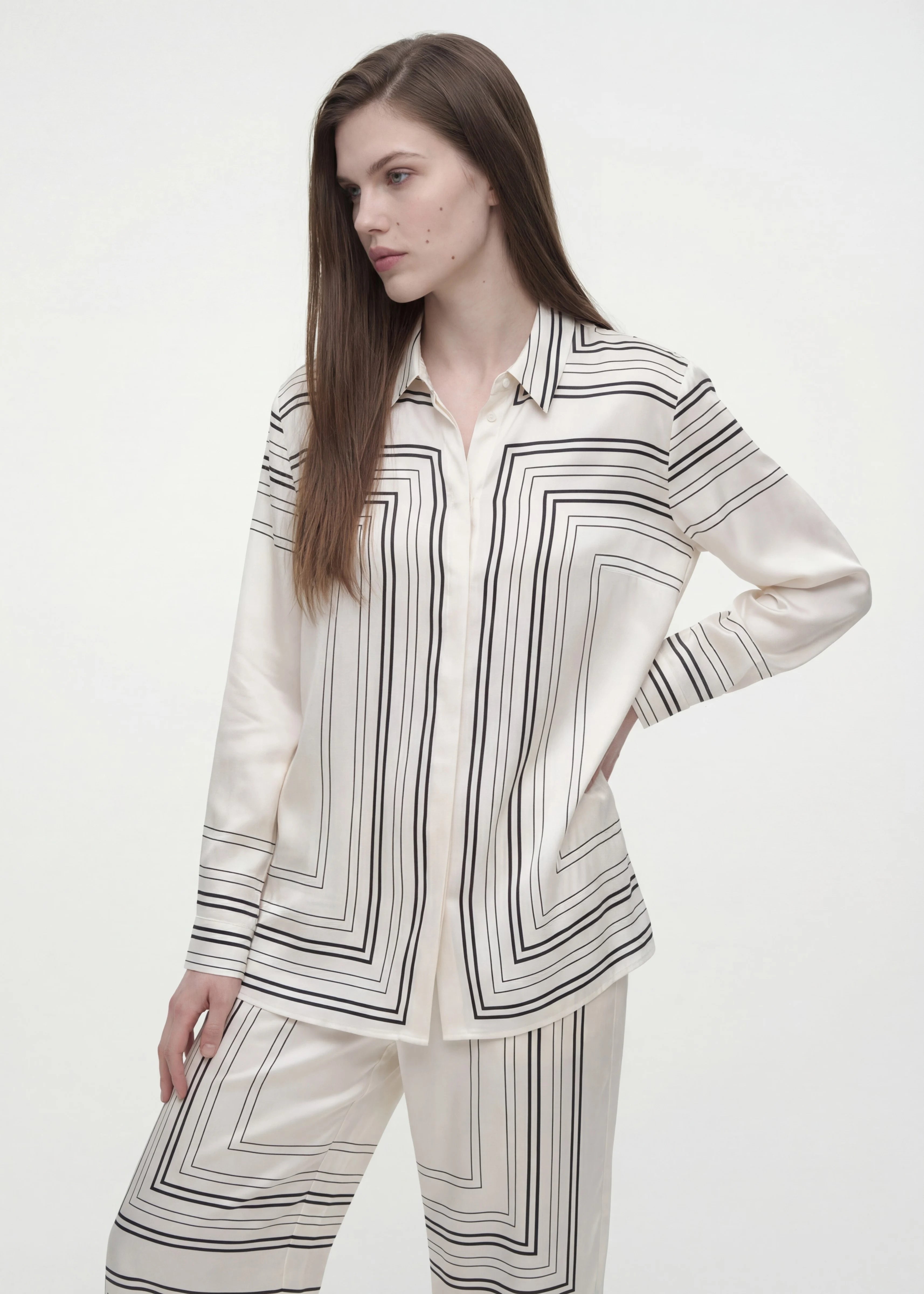 Most stripes are content to simply run parallel, but these prefer to take a tour of the torso. Arranged in a mitred, concentric formation that recalls Art Deco architecture or perhaps a very stylish labyrinth, the pattern turns a standard silhouette into a study in linear perspective. To ensure the optical illusion remains unbroken, the front fastening is tucked away behind a concealed placket, leaving the geometric precision to speak for itself.