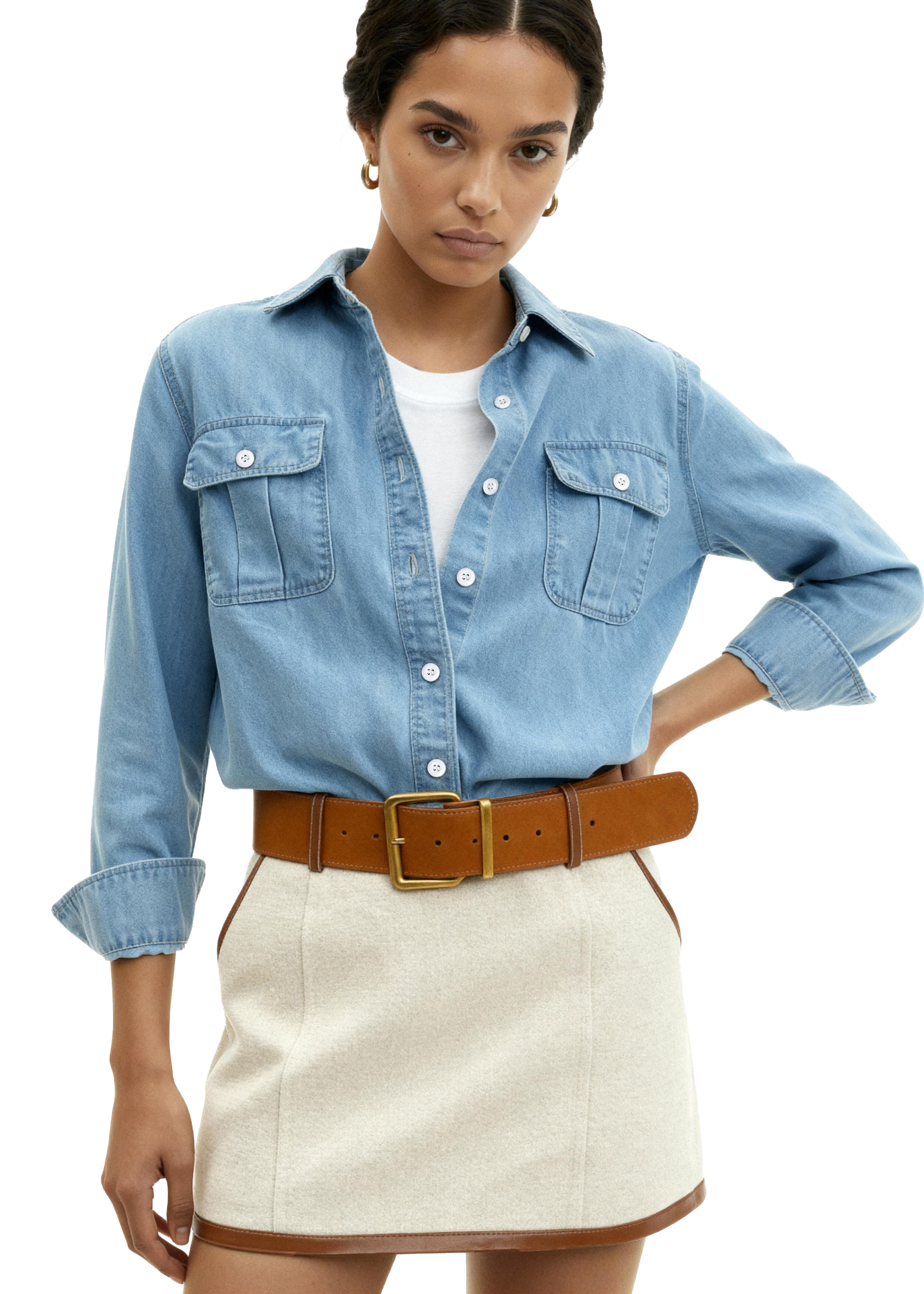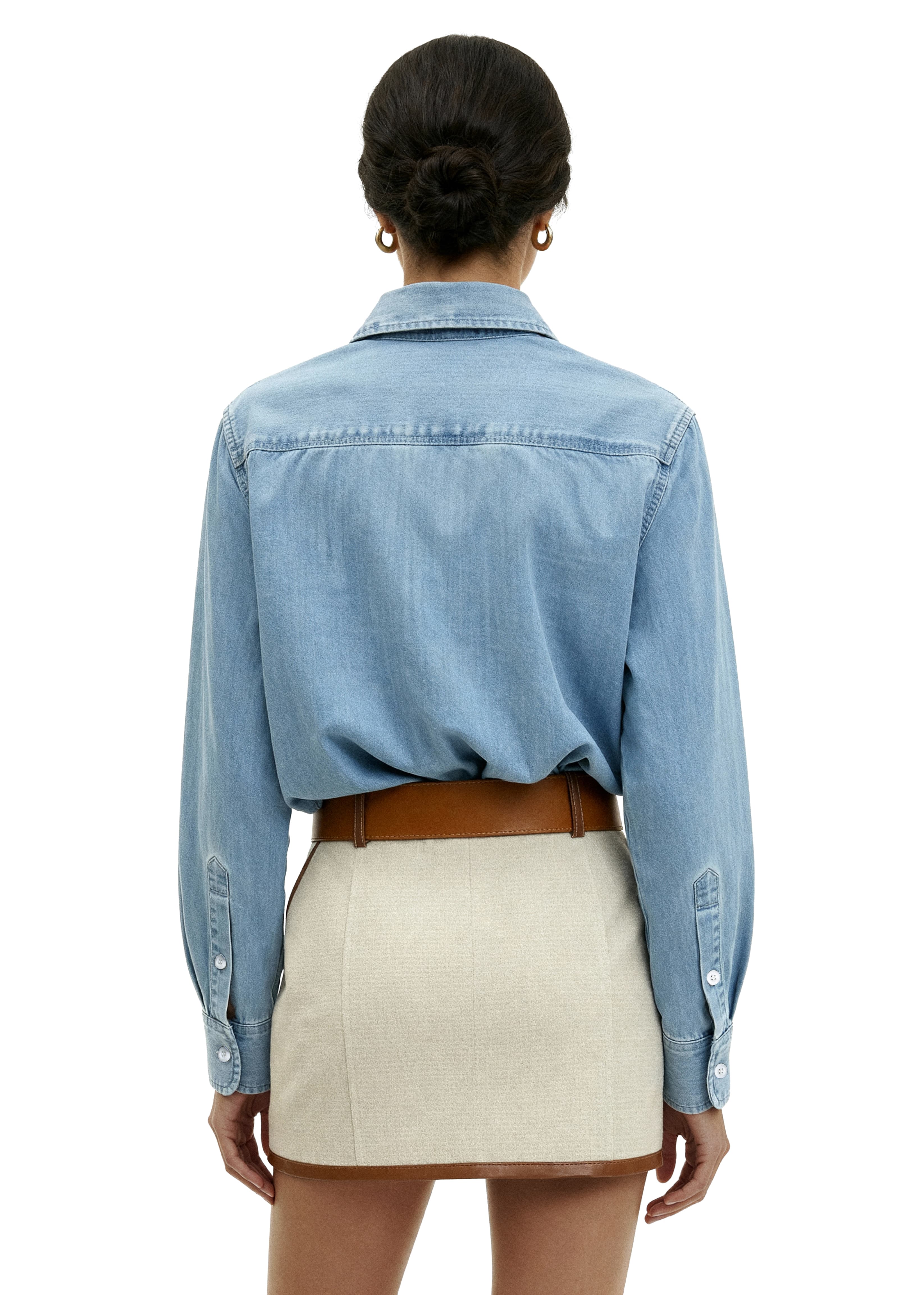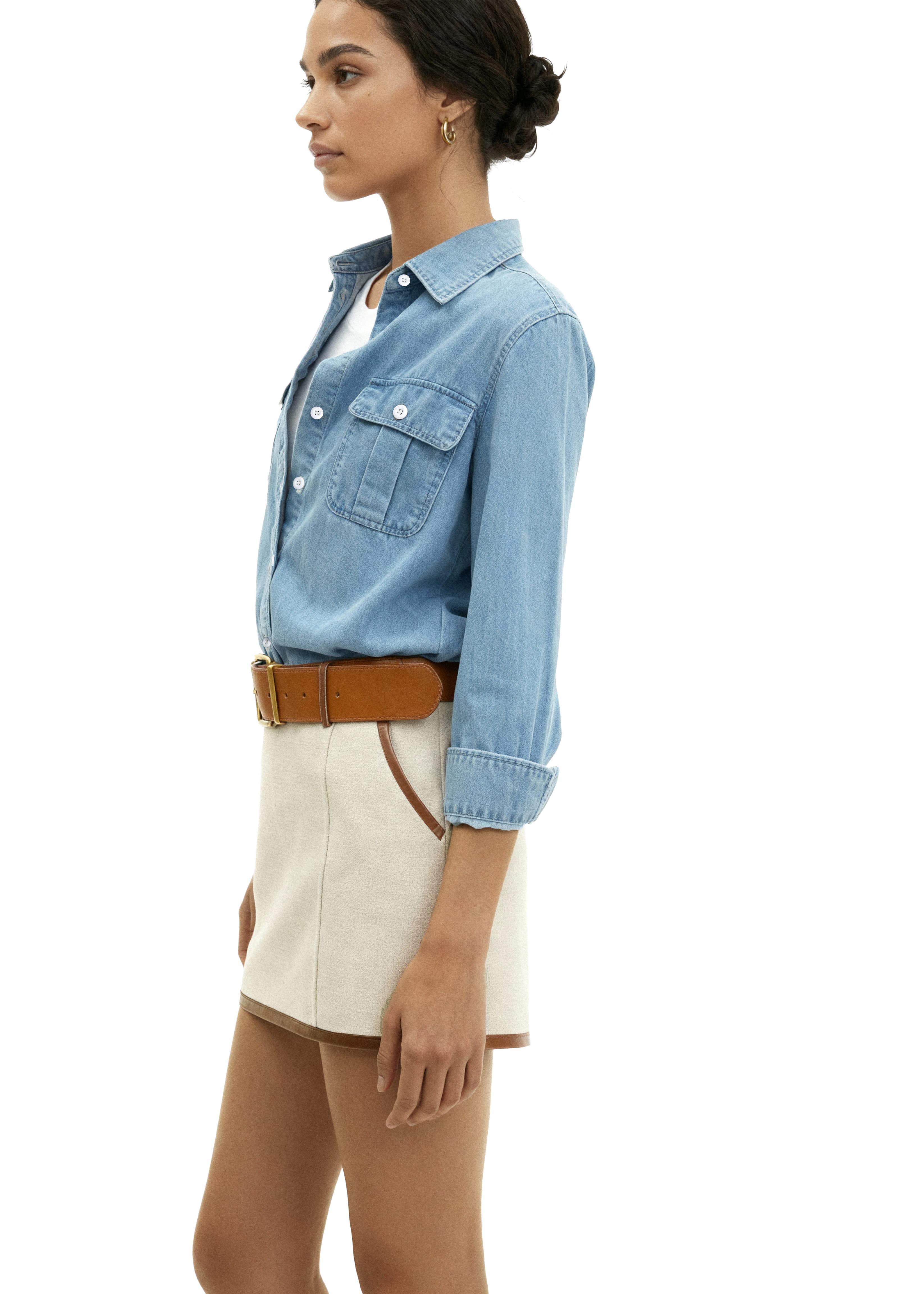 Soft from the first wear, this denim shirt carries the easy drape of a long-worn favorite. The cotton weave has a smooth, lived-in texture that makes it sit neatly whether layered over a tee or tucked into trousers. It takes cues from classic workwear with patch pockets, buttoned cuffs, and contrast stitching, but feels more refined in its finish and fit.