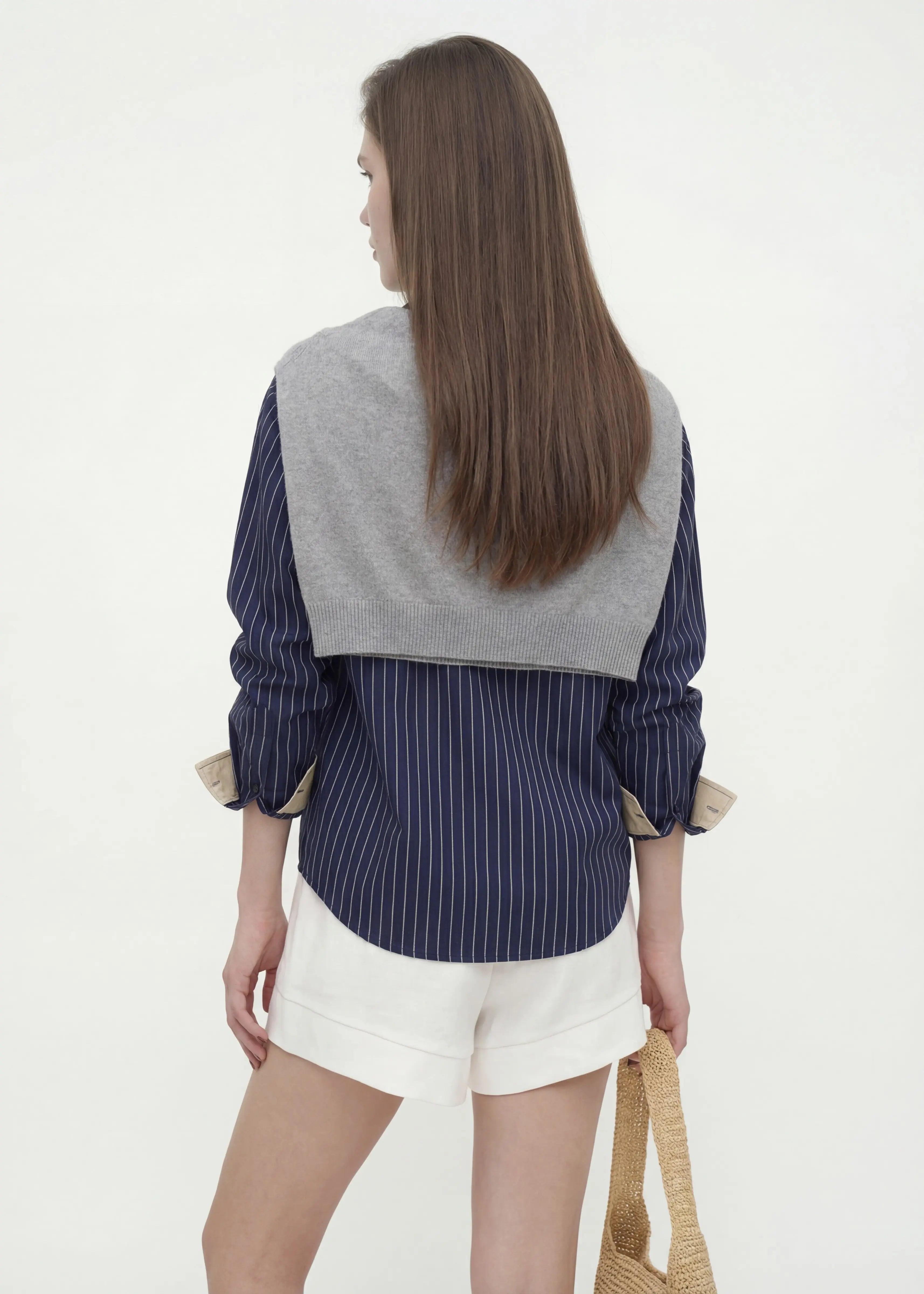 This crisp navy stripe shirt arrives with a detached grey knit shawl, offering the nonchalance of a sweater-drape without the commitment.