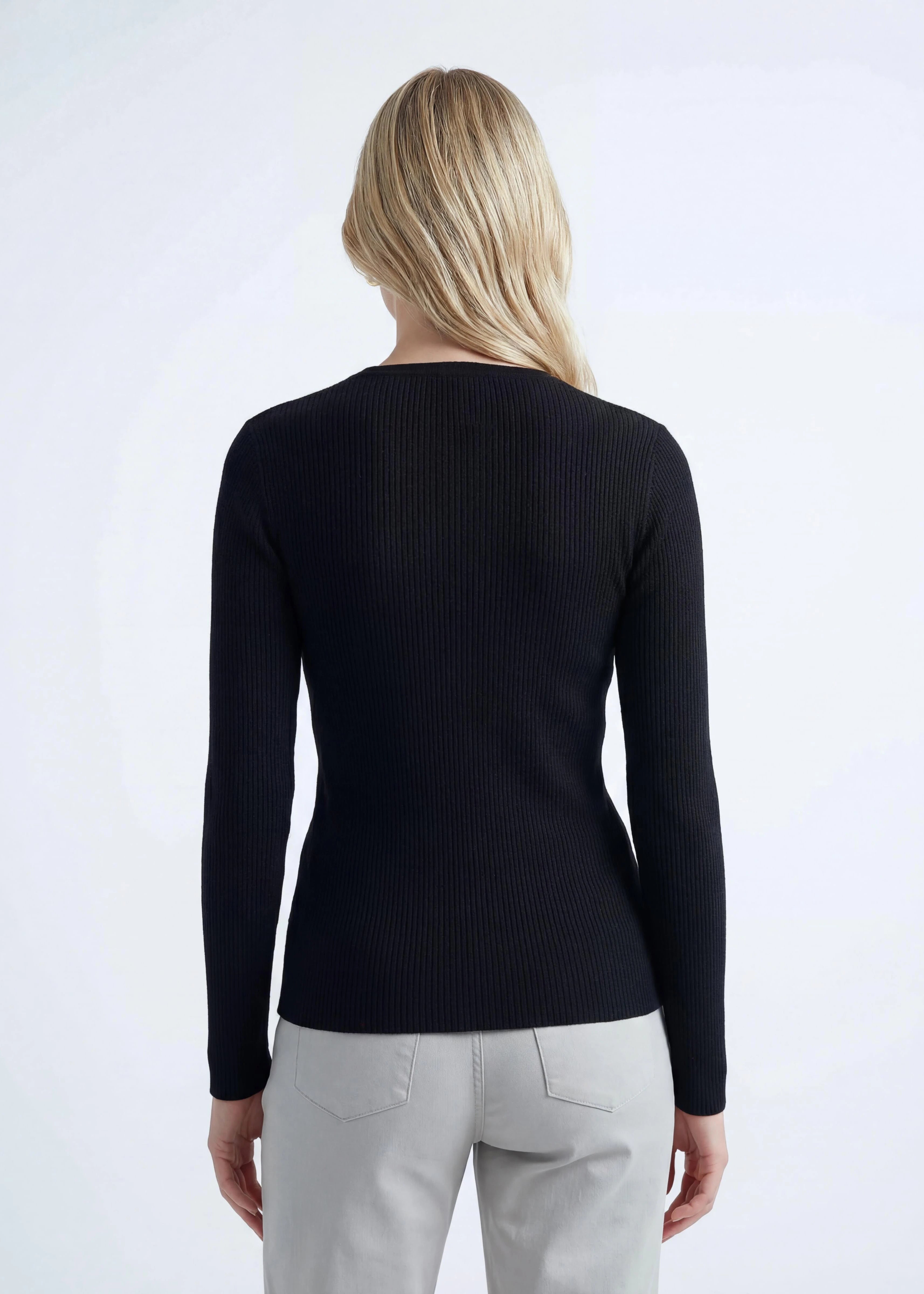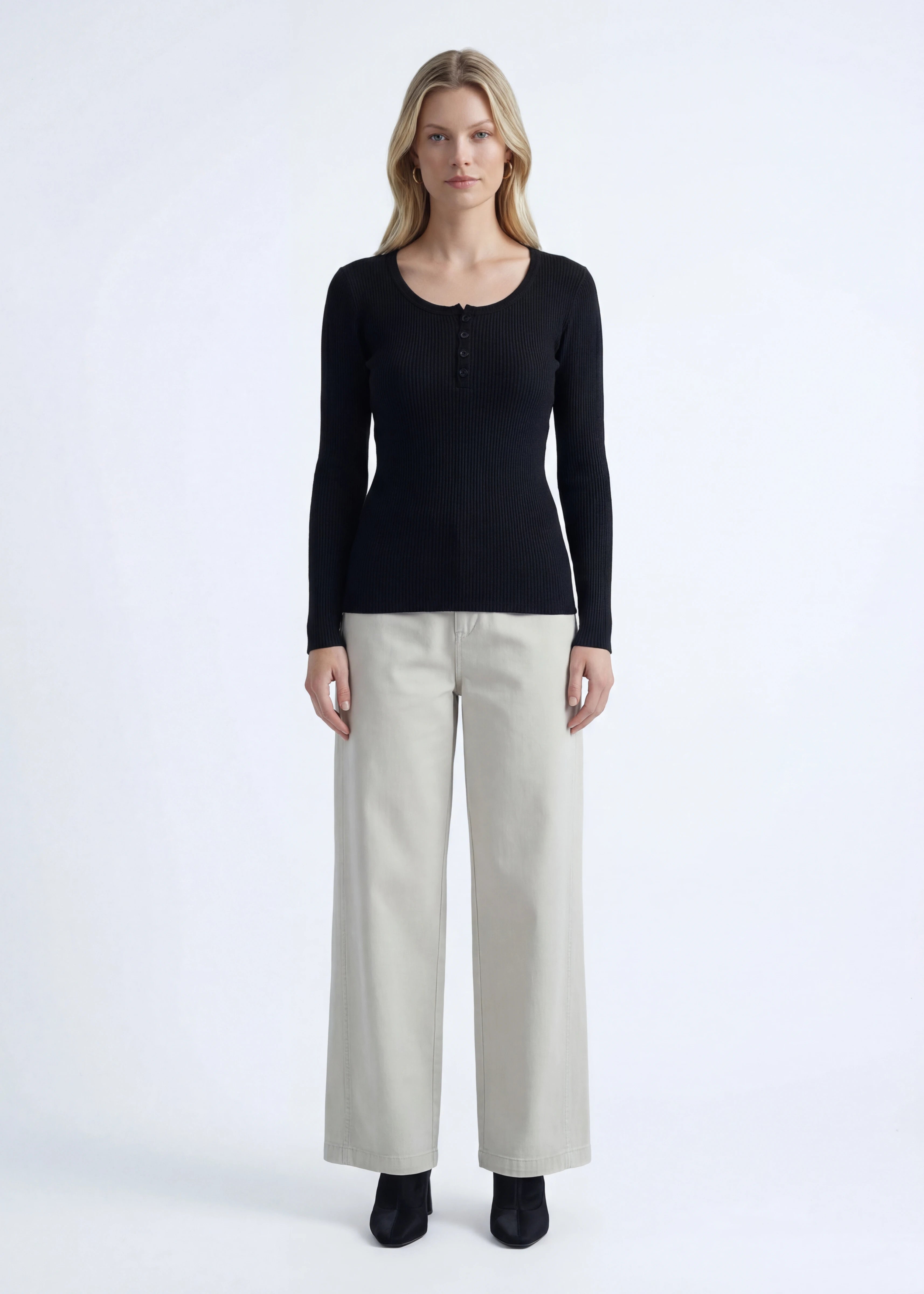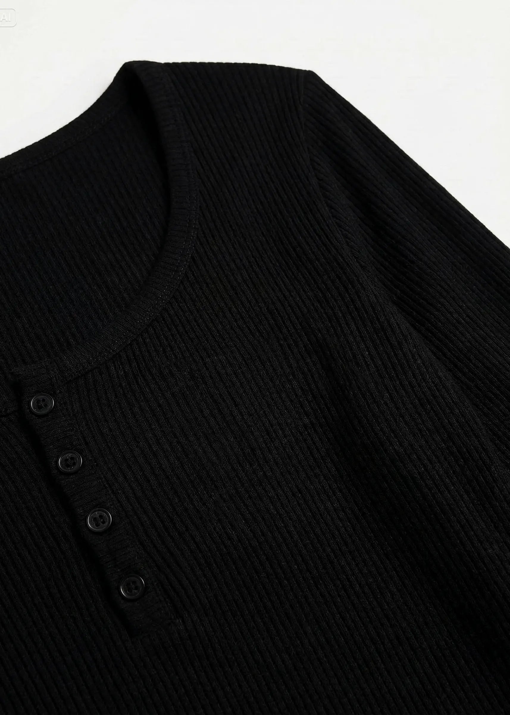 A long-sleeved Henley cut from a soft, medium-weight cotton rib. The fabric has an even, vertical stretch that sits close without constriction. The neckline is gently scooped, finished with a short, four-button placket. Each button is securely stitched on a reinforced tape to prevent strain at the closure. The sleeve and body hems are neatly bound for a clean edge.