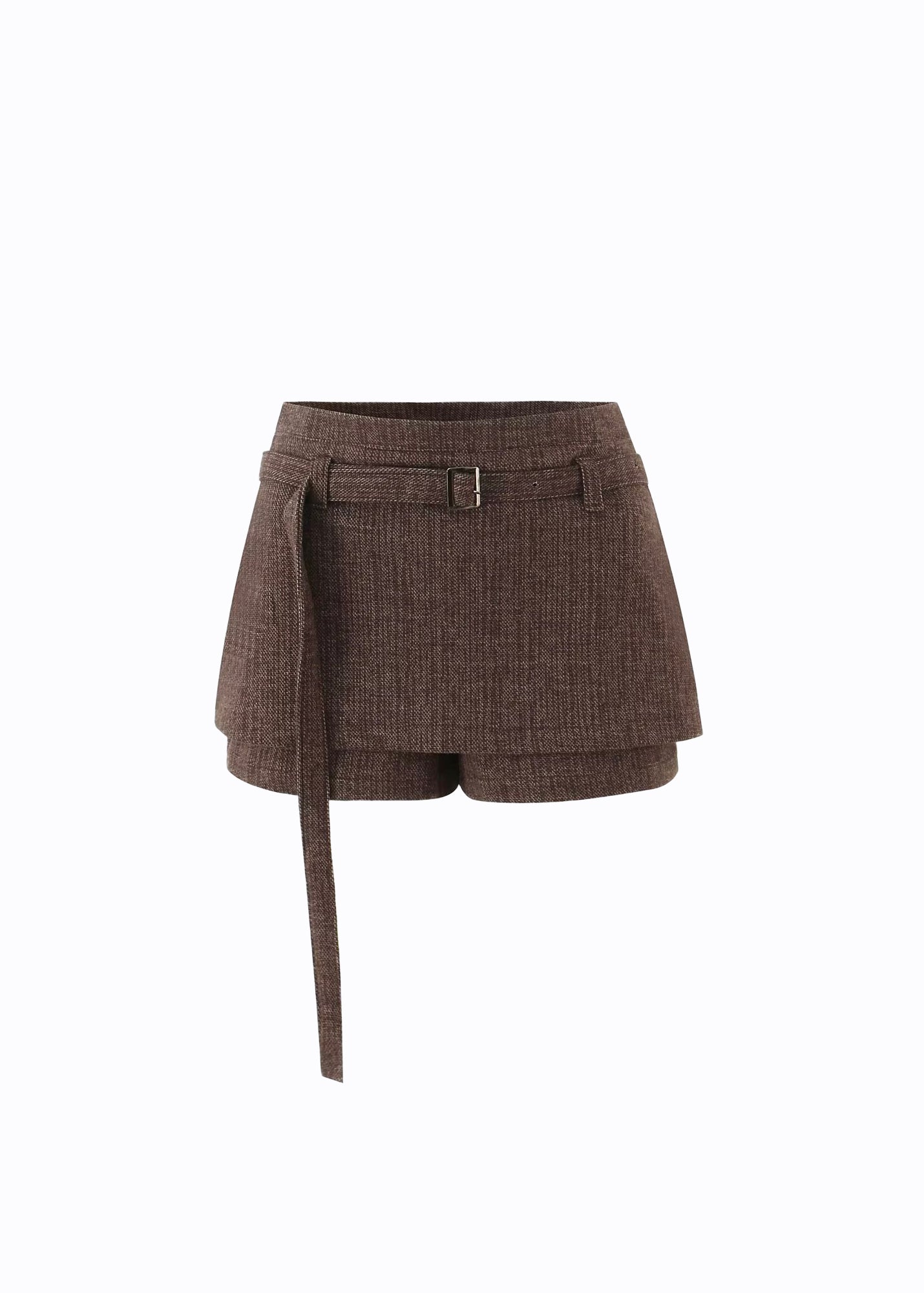 These tailored skort-meets-shorts are what happens when a mini skirt grows up, gets sensible, and still keeps its edge. Cut in a textured charcoal weave with a wrap-front illusion, they give you polish up front and freedom underneath. The long self-tie belt adds drama (and waist definition), while the structured shape works just as well with knits as crisp shirting. офис-core, but make it fun.