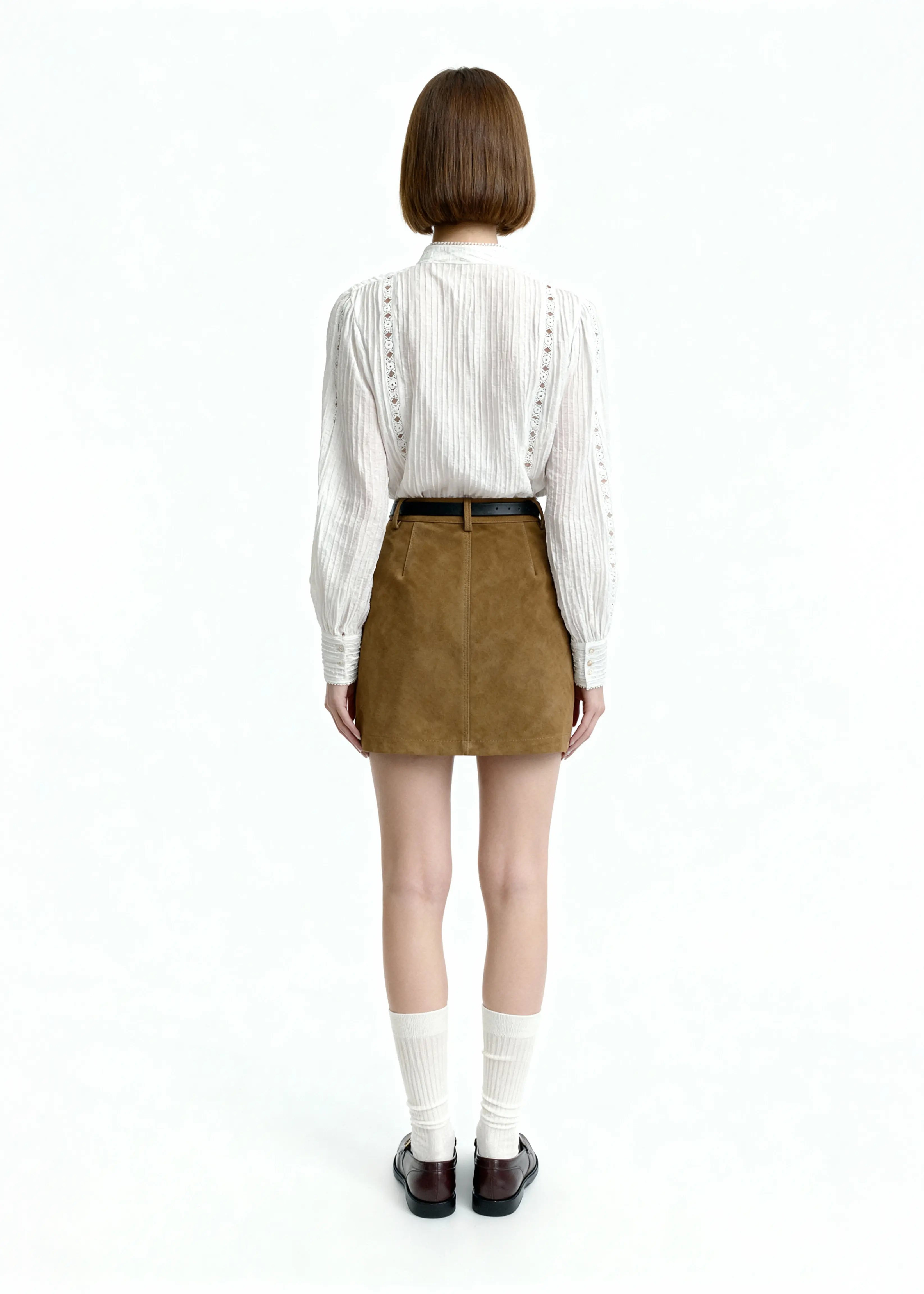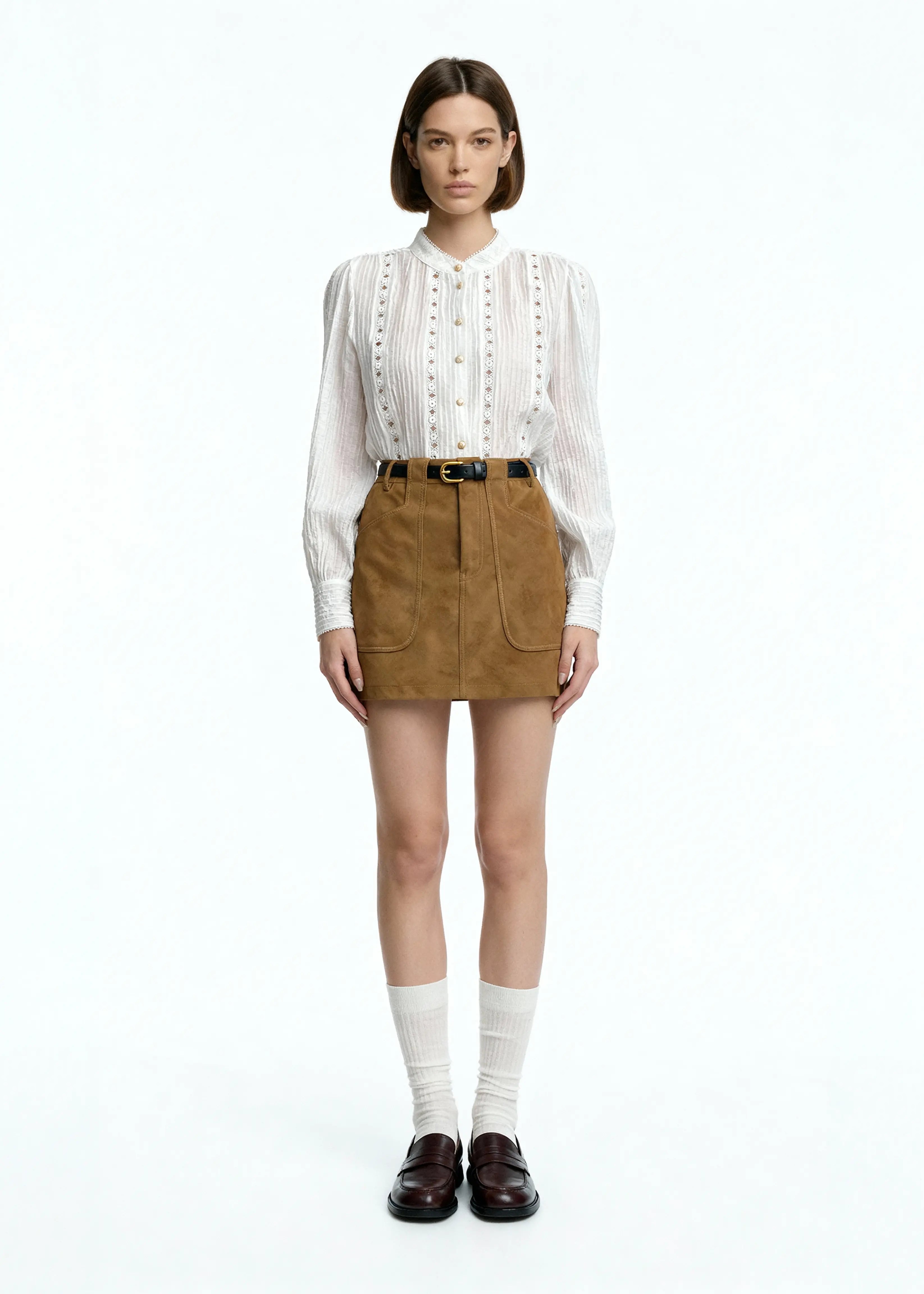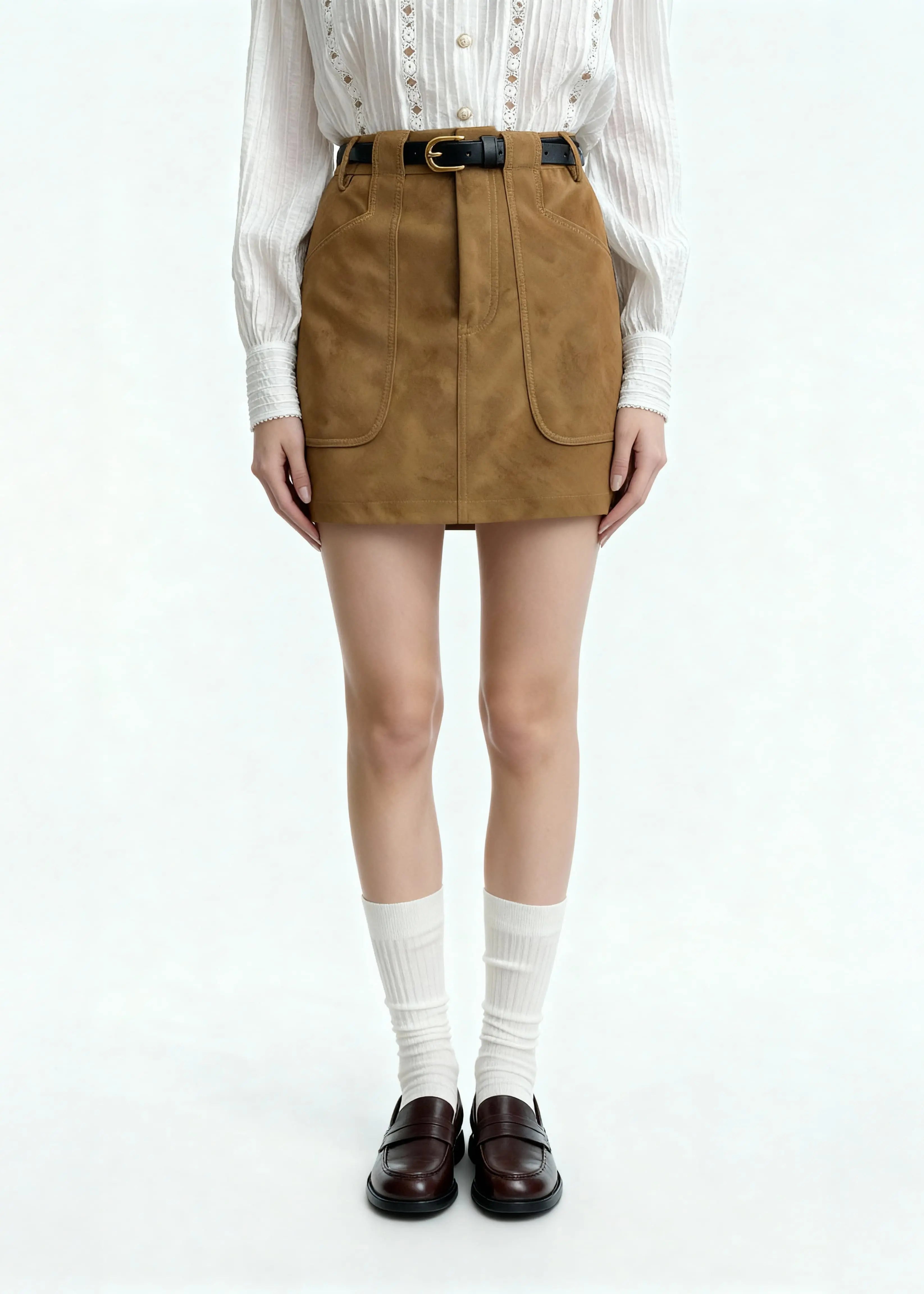 This is the skirt that manages to be both decidedly mini and unexpectedly substantial. It strikes a balance between 1970s texture and modern, clean tailoring. The design begins with a high-rise A-line silhouette, a shape that offers an automatic, flattering structure.