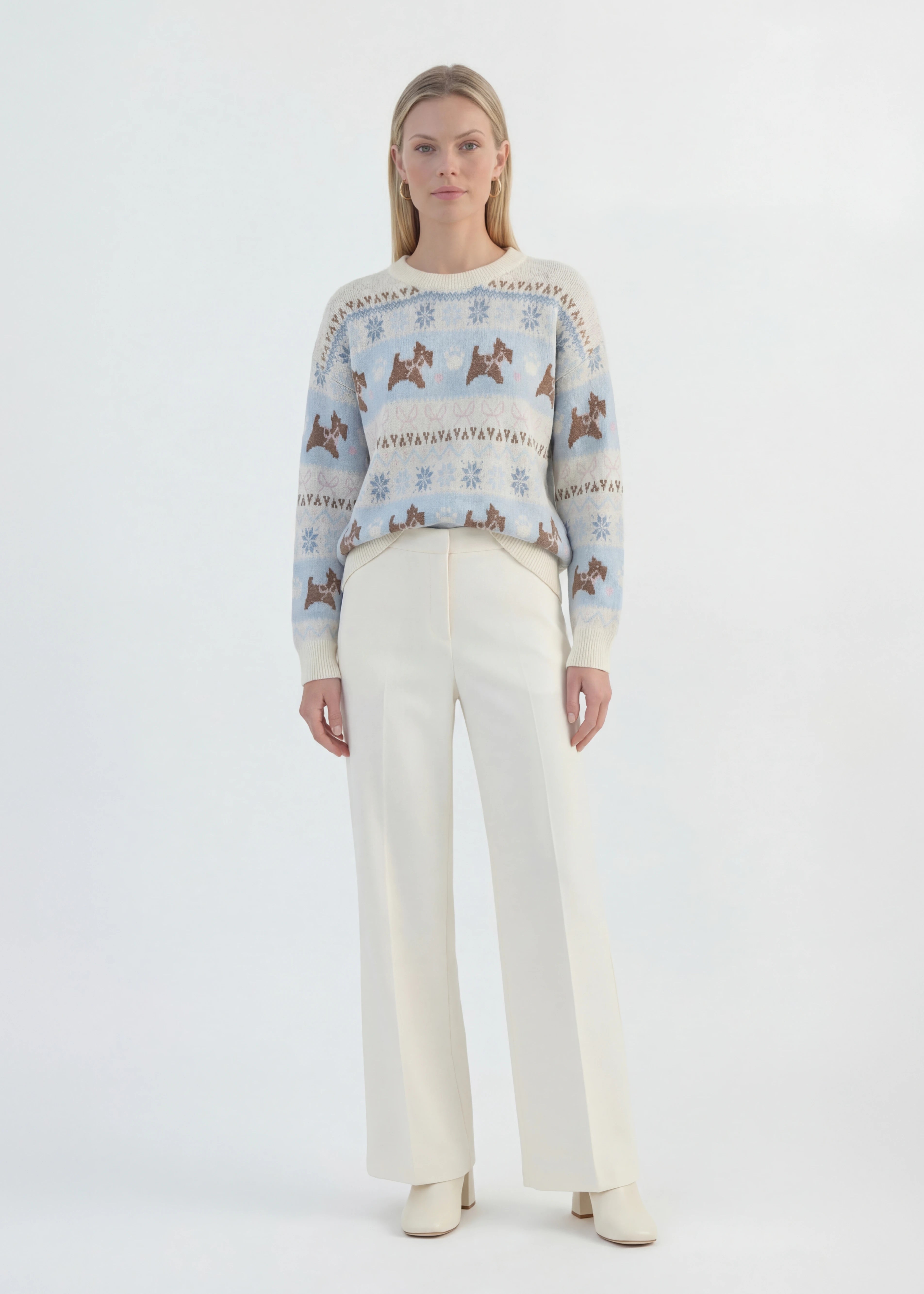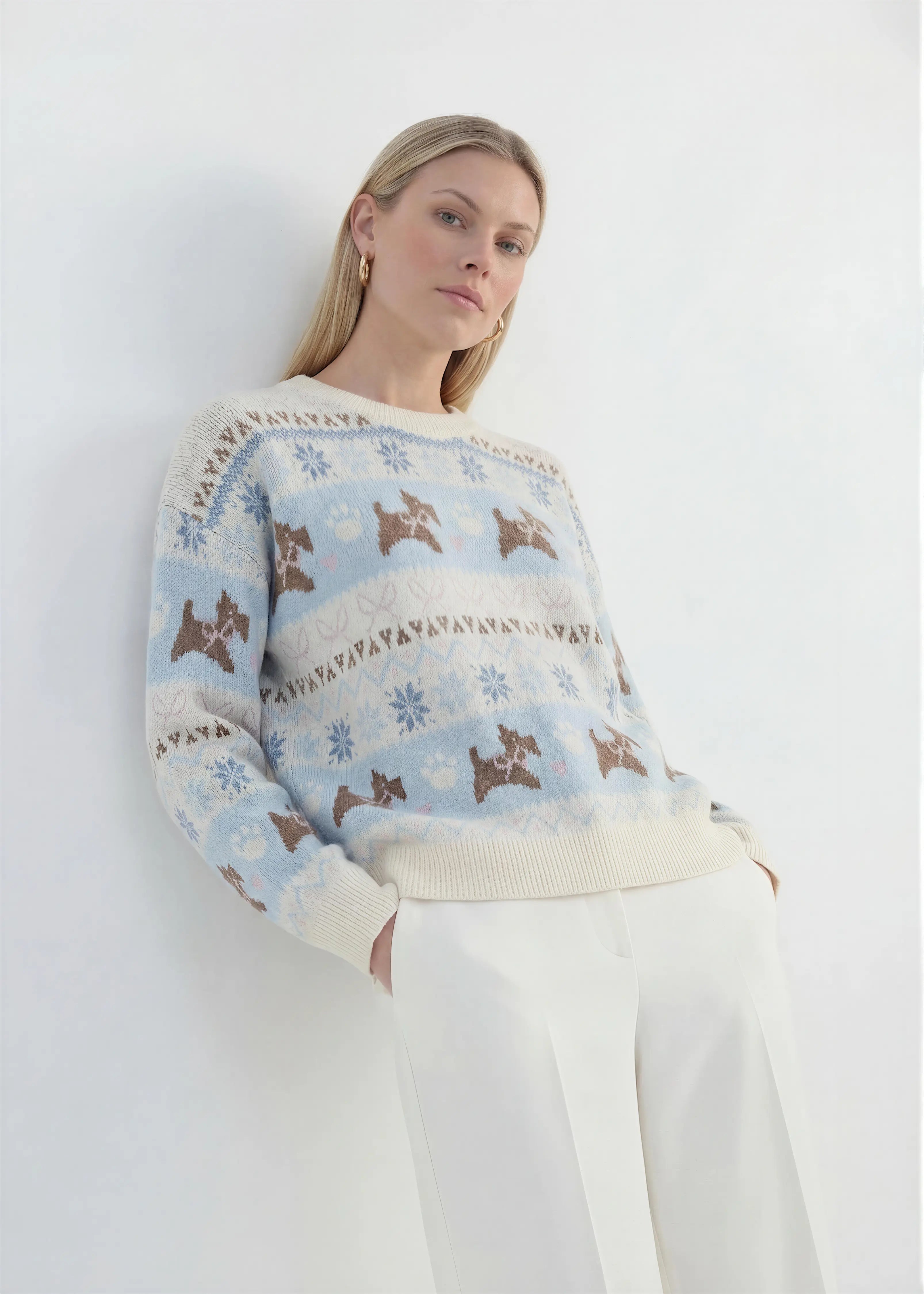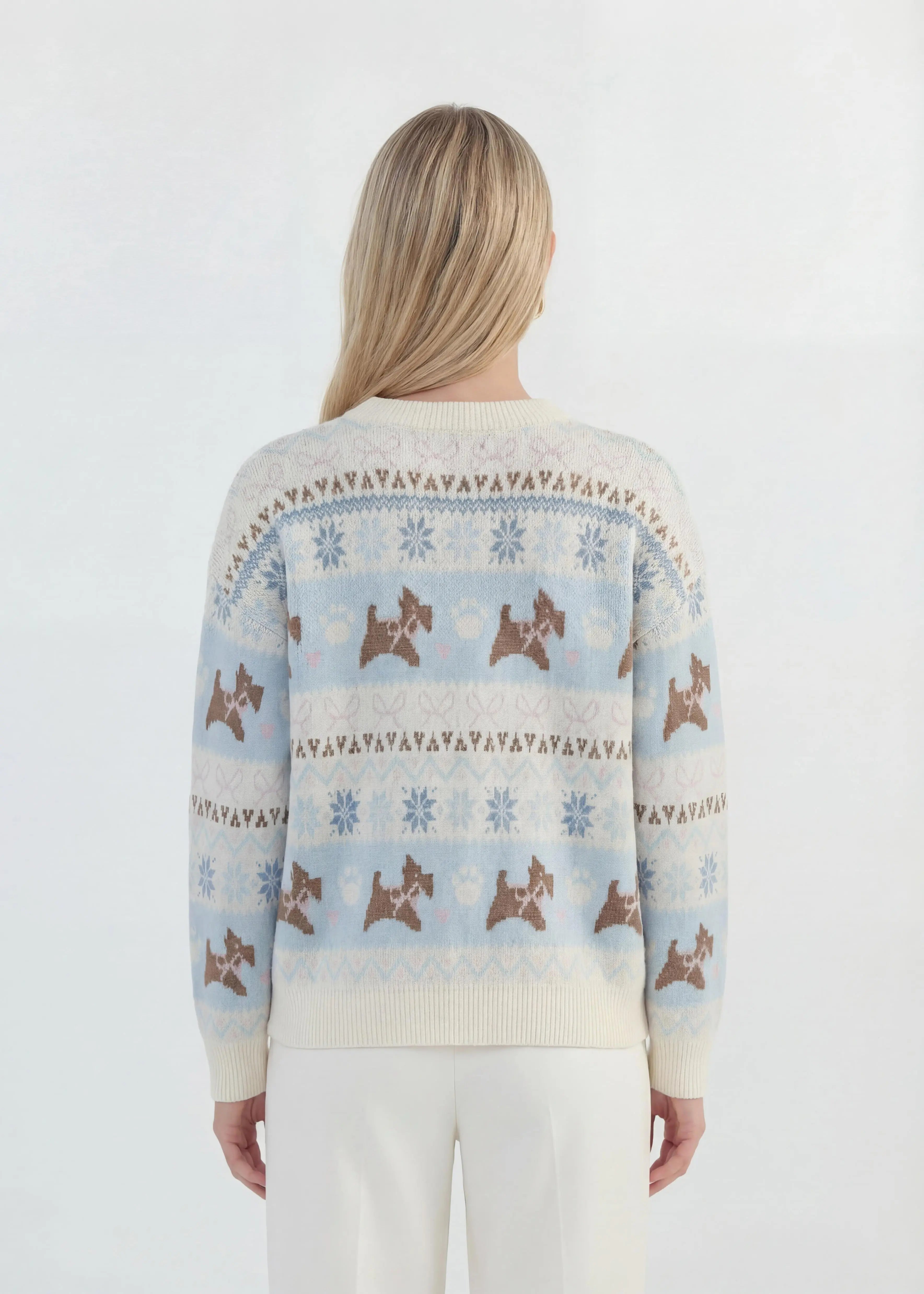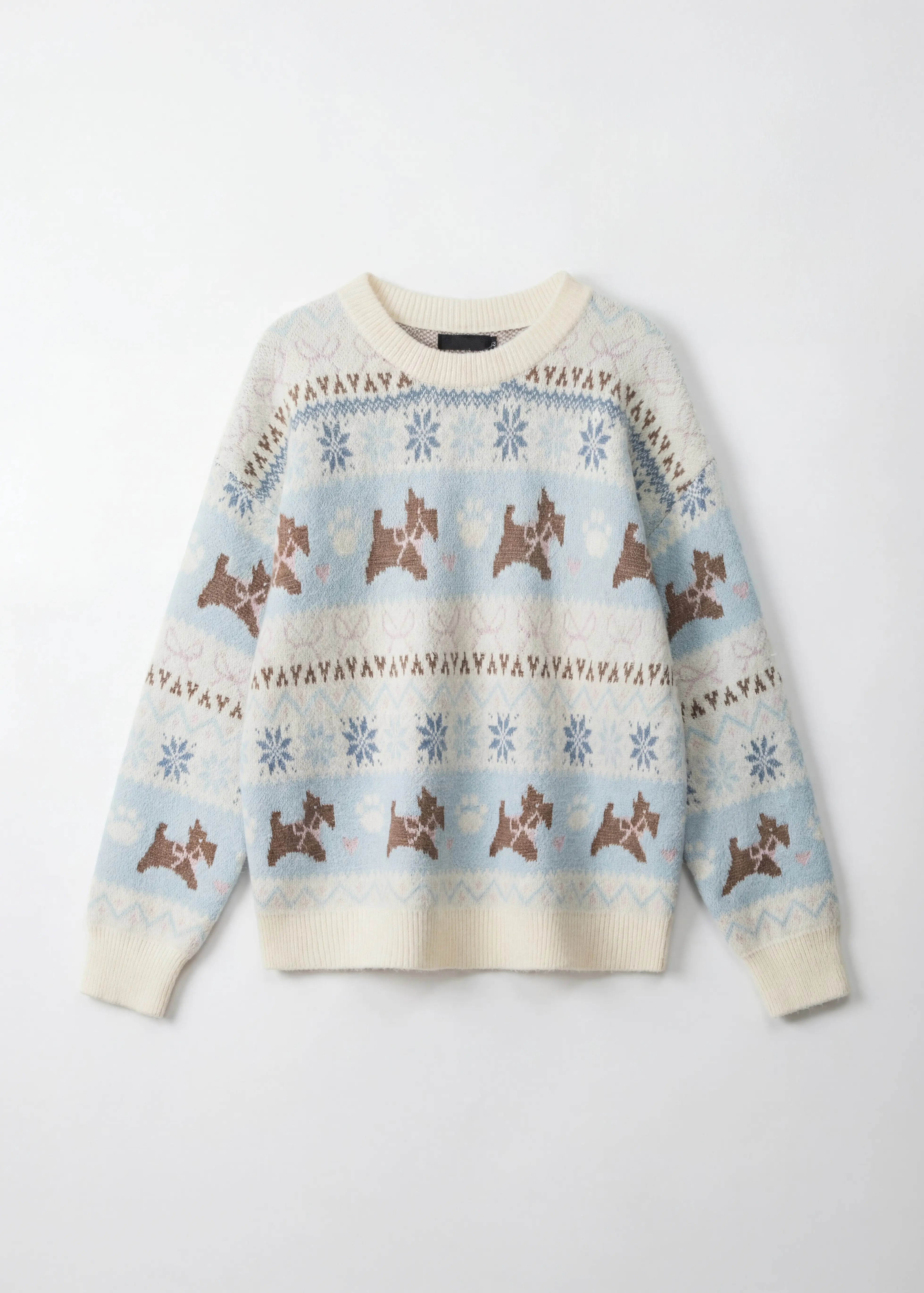 This jacquard knit pays homage to the Highland legend, weaving terriers, bows, and paw prints into a dense, double-knit structure. It offers the visual weight of a heritage piece with a brushed, cloud-like hand feel. A spirited layer for days that require a bit of dogmatic charm.
