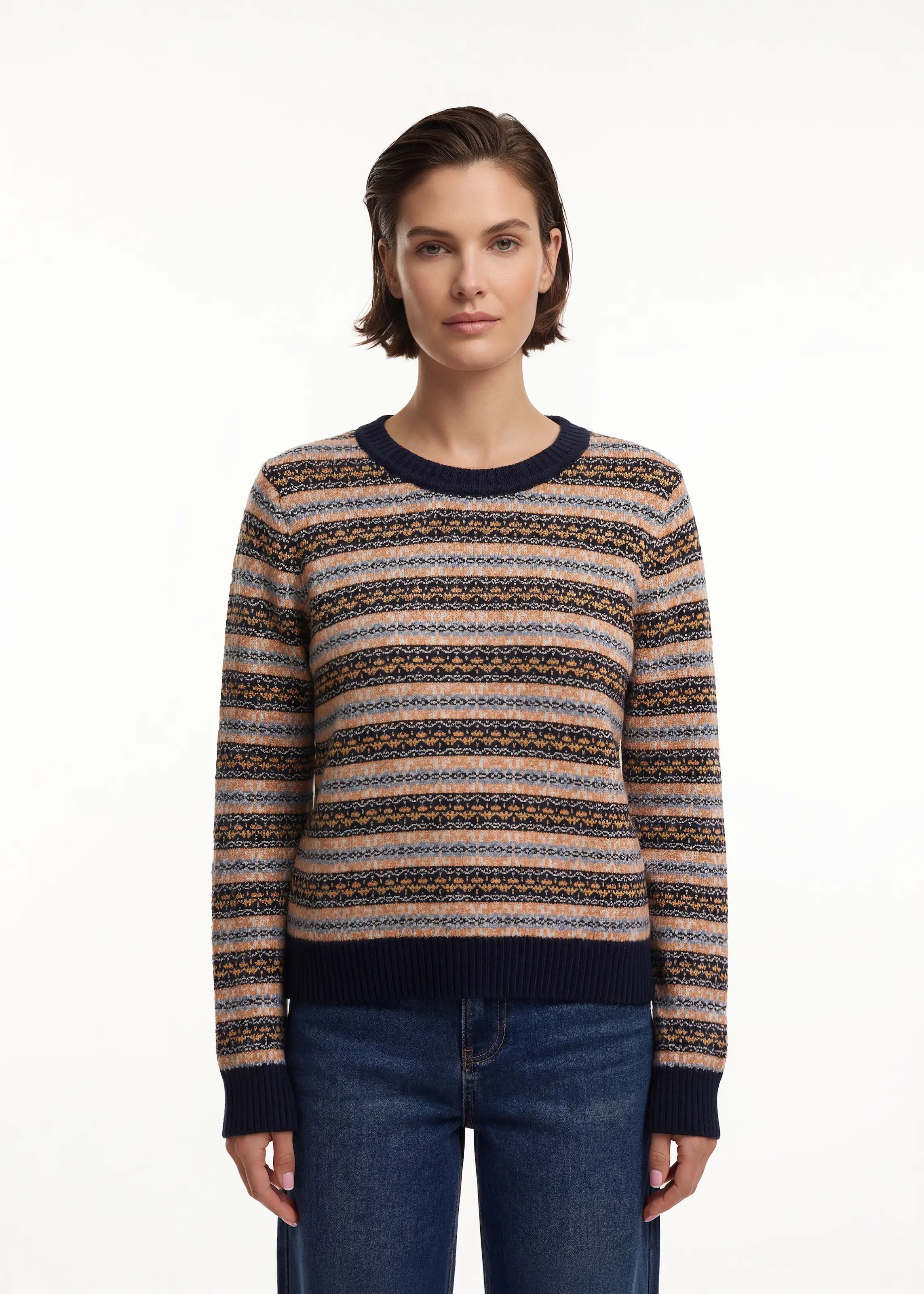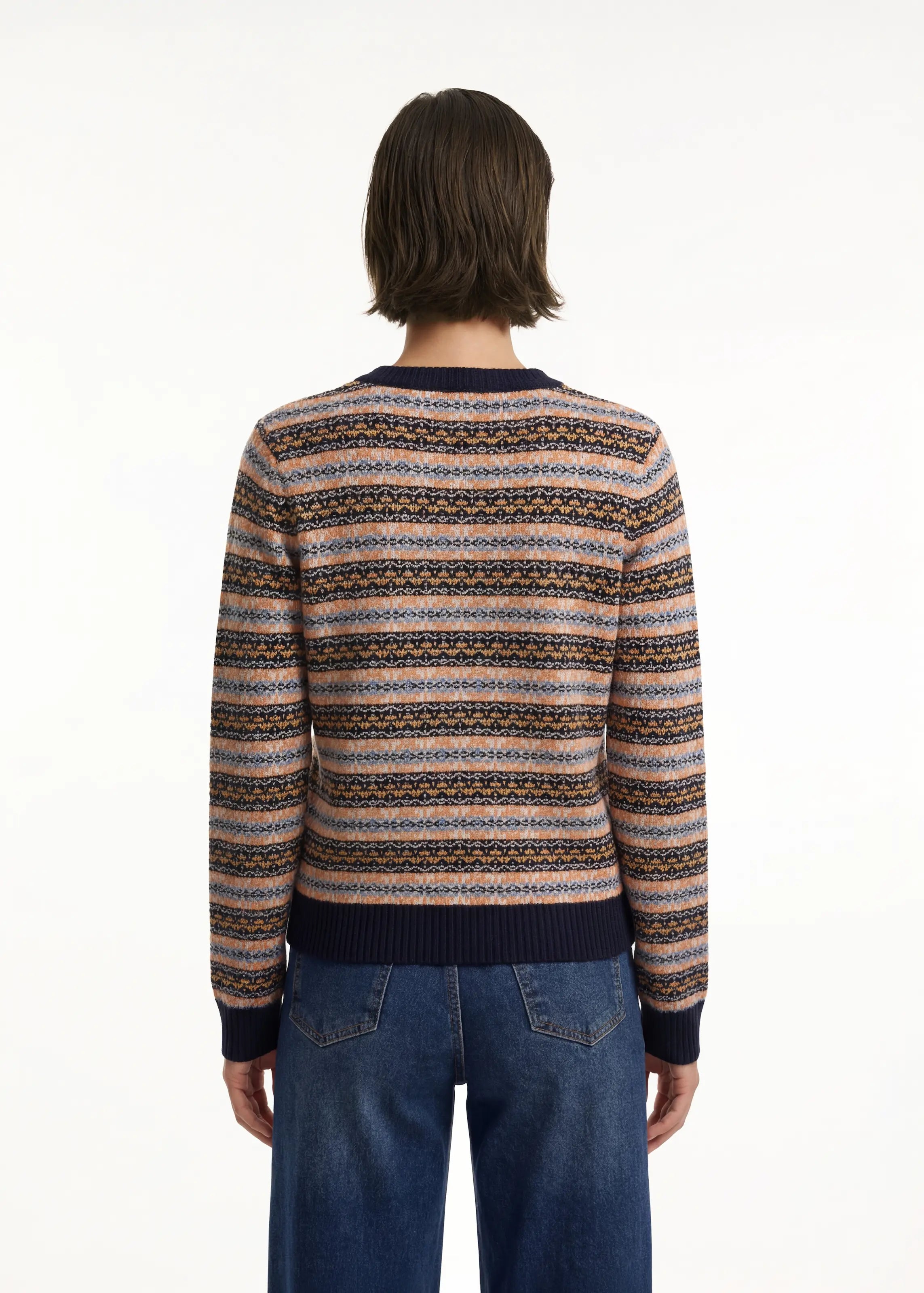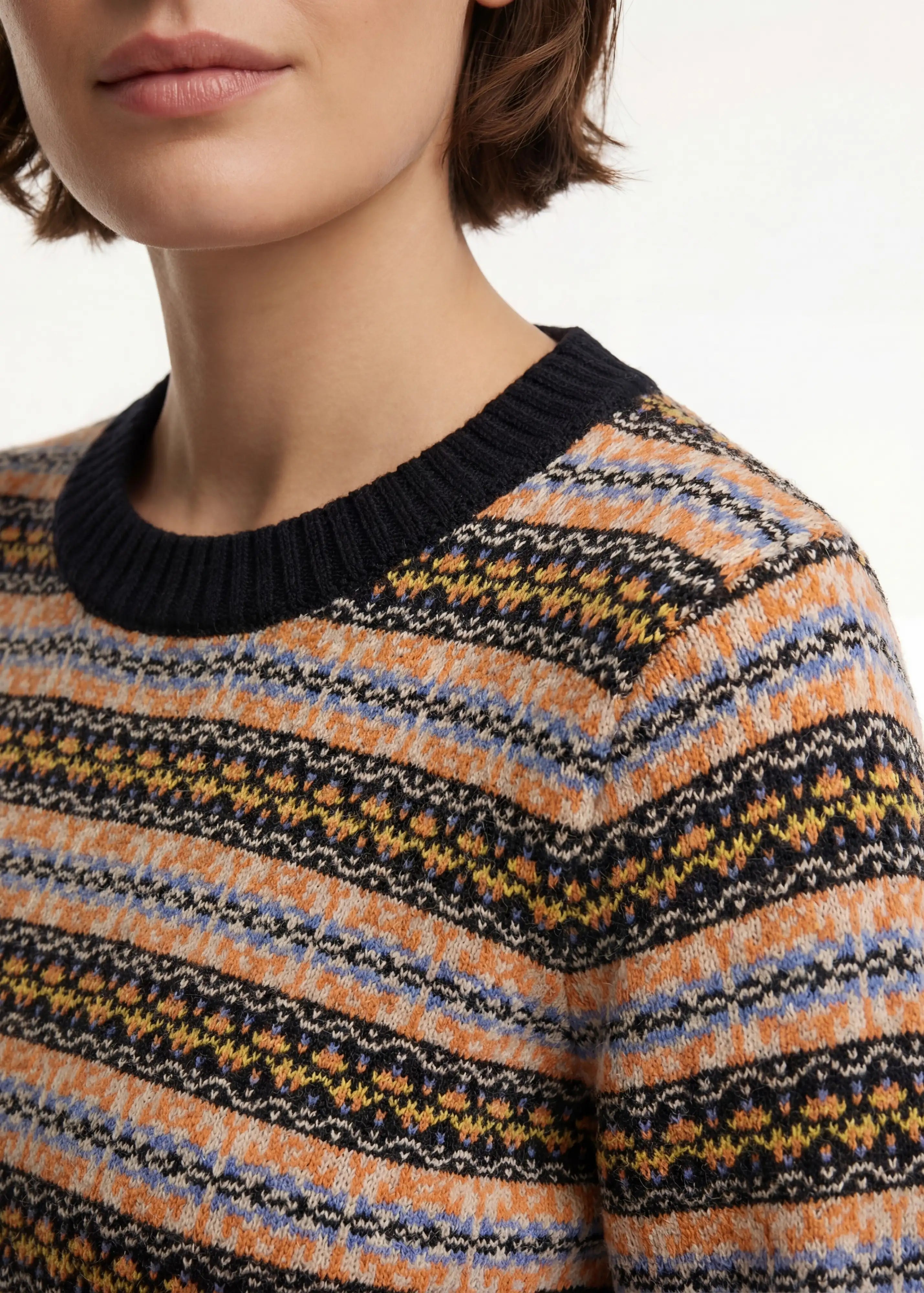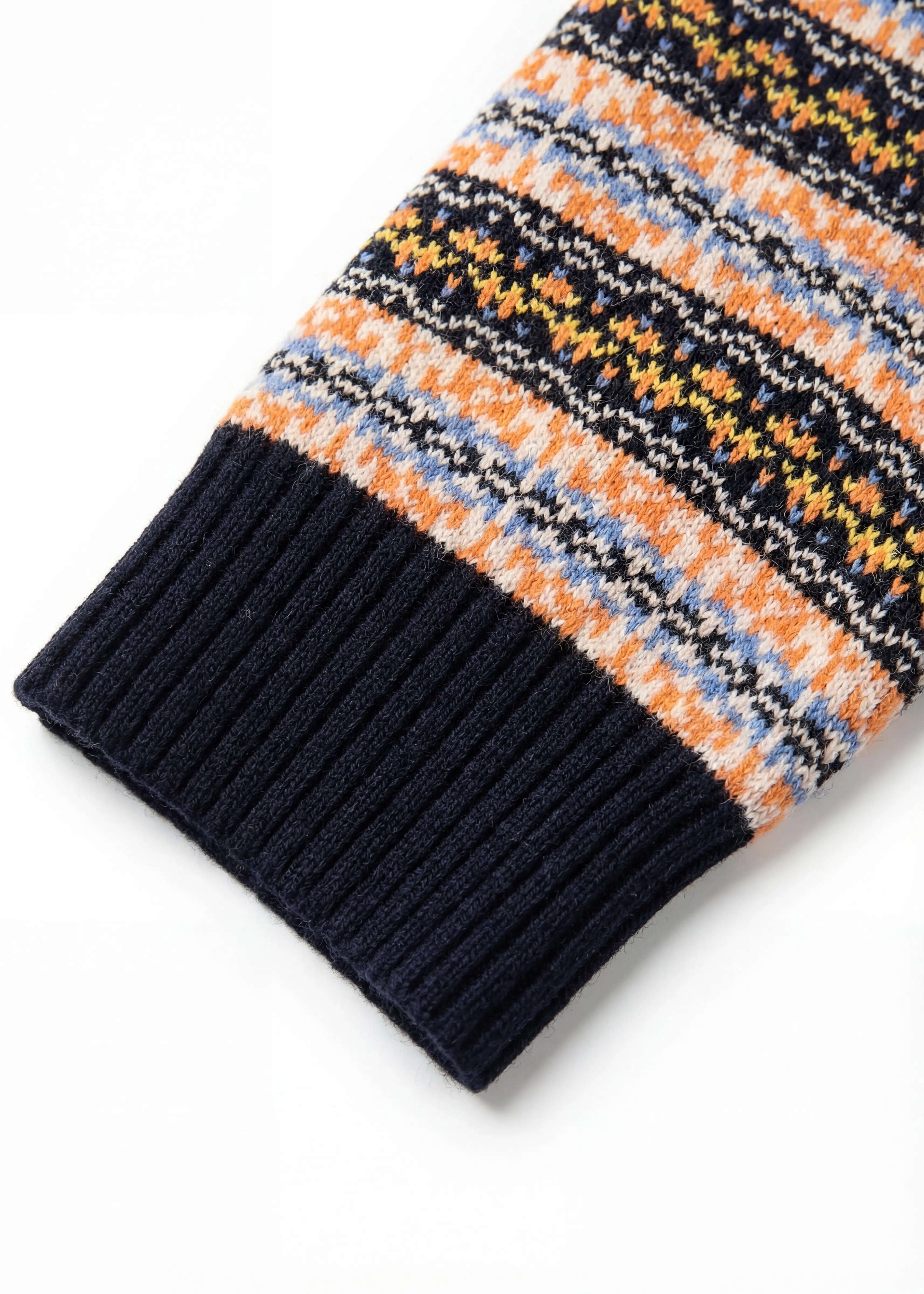 Crafted from a tactically soft wool blend, it features a substantial navy rib at the collar and cuffs to firmly ground the riot of orange and azure patterned stripes. It is the sort of knit that suggests you own a cabin, or at least a very reliable thermos.