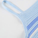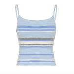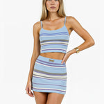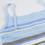 A small, playful top with a sense of its own proportion. It is a garment designed for confident movement, with a simple, decisive cut that ends high on the torso. Its tight, ribbed knit holds a form both classic and modern, with a series of precise stripes in varying shades of blue, lavender, gray, and white.