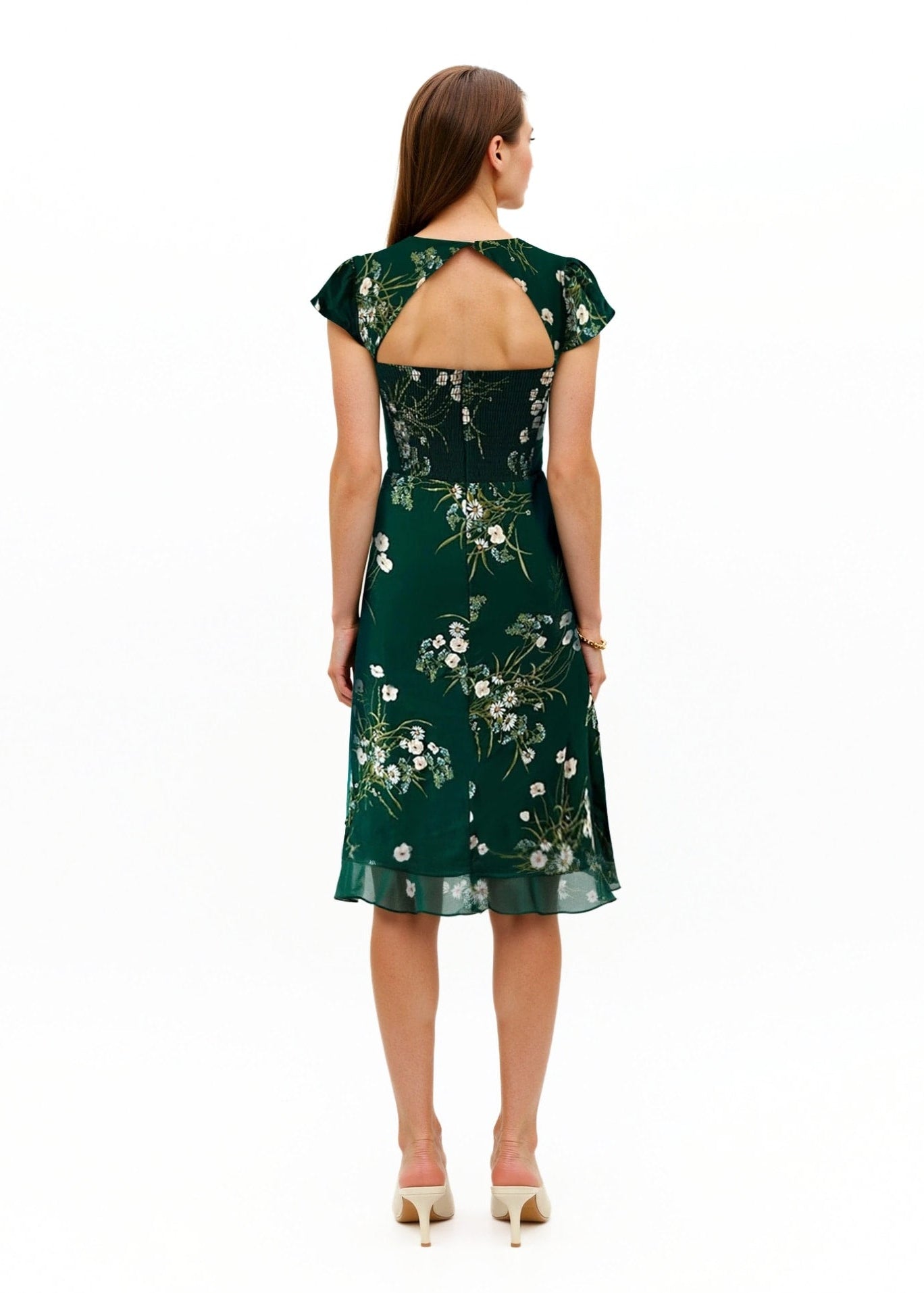 A square neckline with a soft notch brings gentle structure to the bodice, balanced by flutter sleeves that fall lightly at the edge of the shoulder. The waist is cut close to the body, then eased with a wide, smocked panel at the back for comfort and a neat silhouette. At the back, a diamond-shaped cutout closes with a single looped button at the nape—subtle, but considered. The skirt finishes just below the knee, with a light flounce stitched into the hem that moves as you walk.