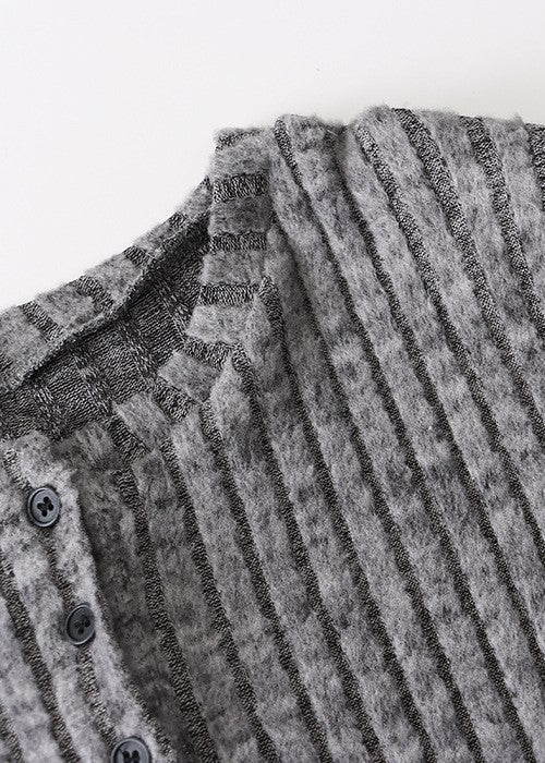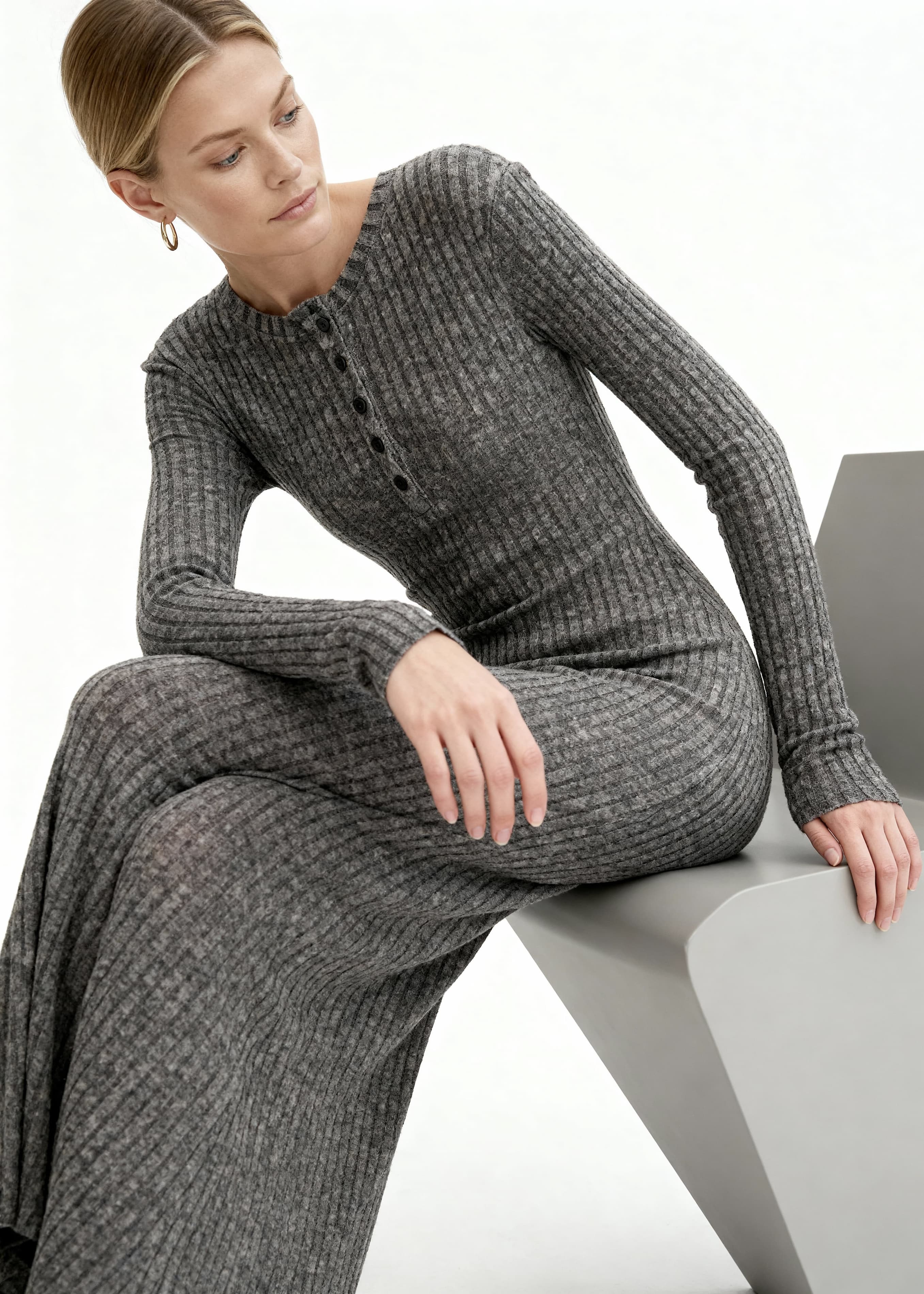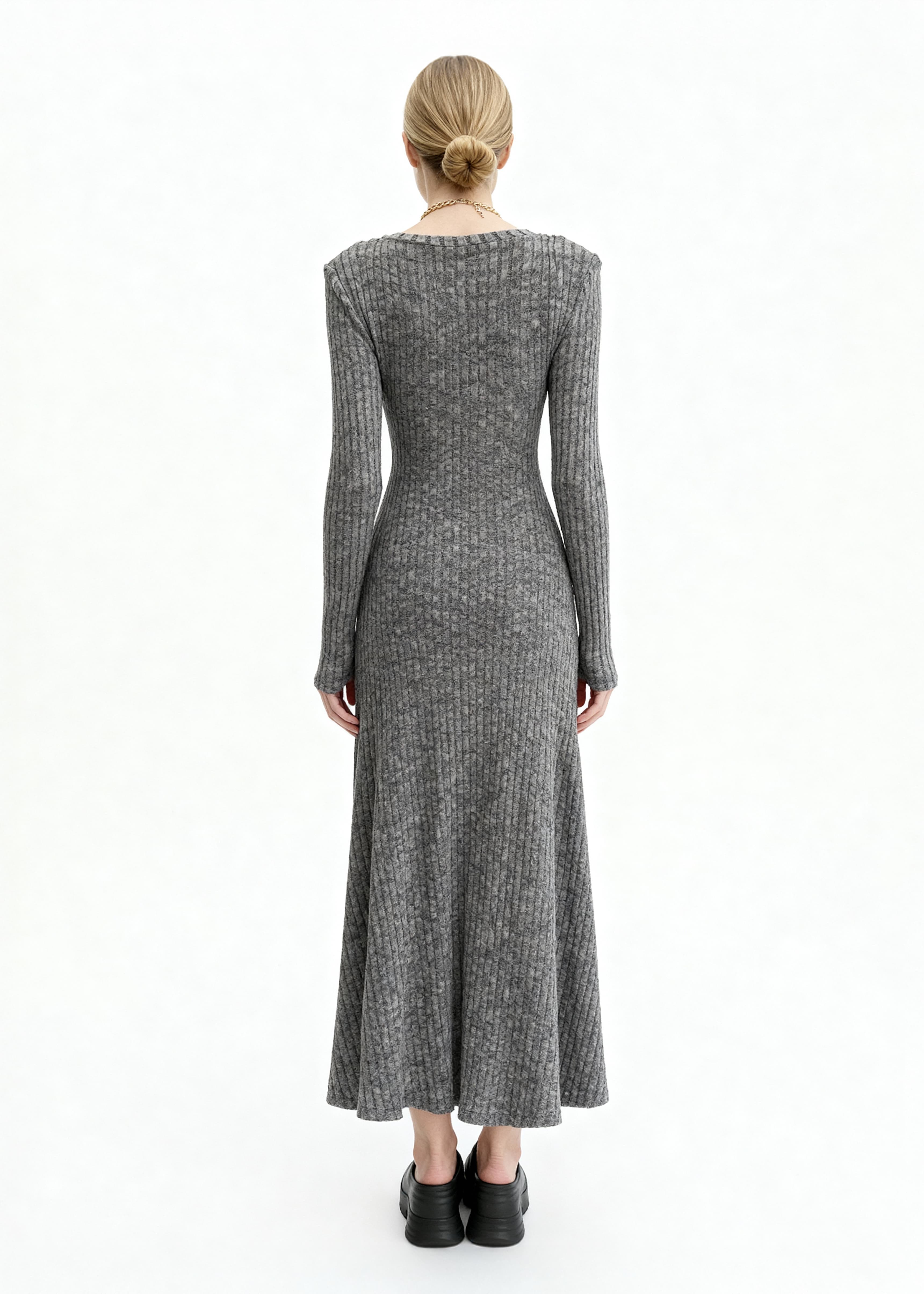 The kind of dress that feels like a second skin. Made from a soft ribbed knit in charcoal grey, it follows the lines of the body before opening out through the skirt. The texture is plush but not heavy, with enough stretch to move without losing shape. A small button placket at the chest and a clean round neckline keep the look simple.
